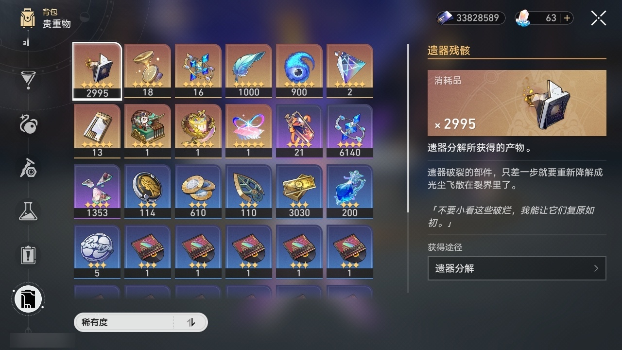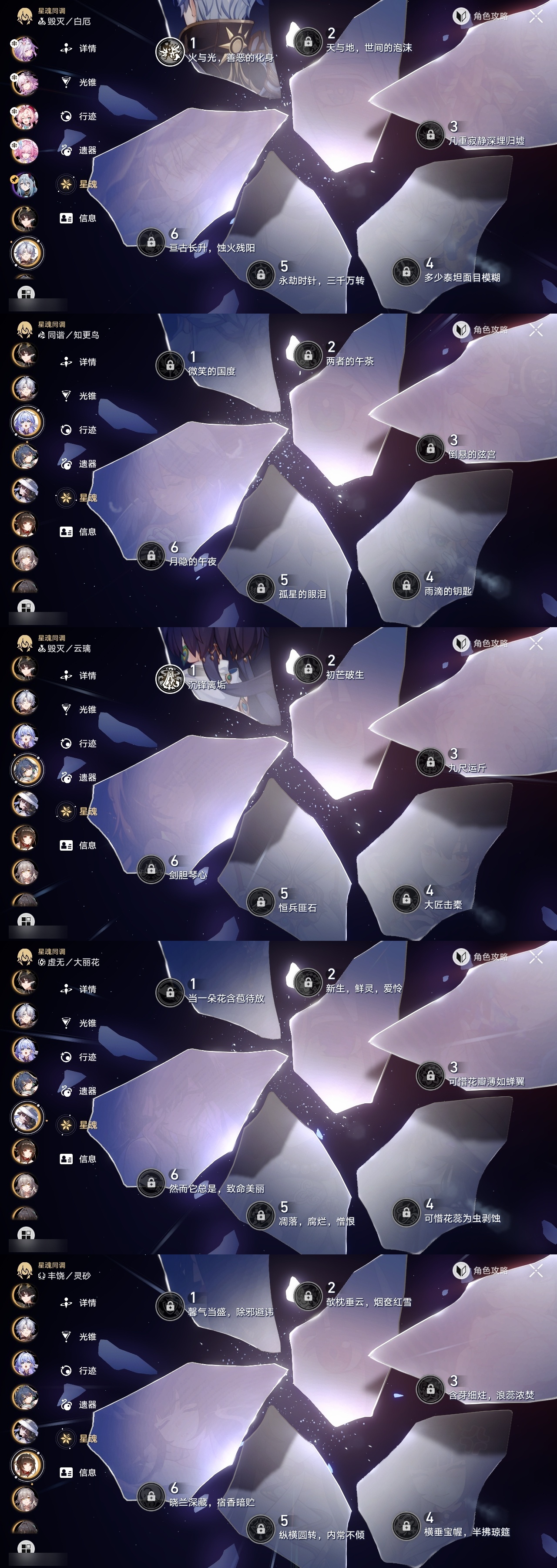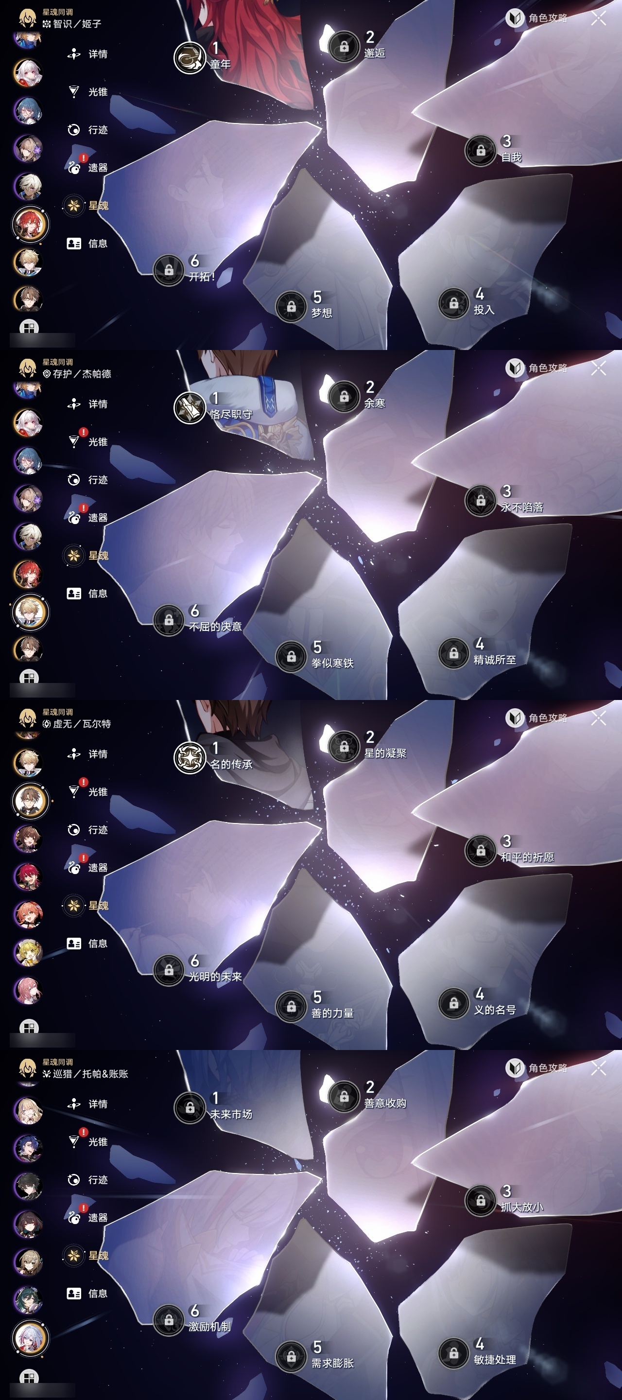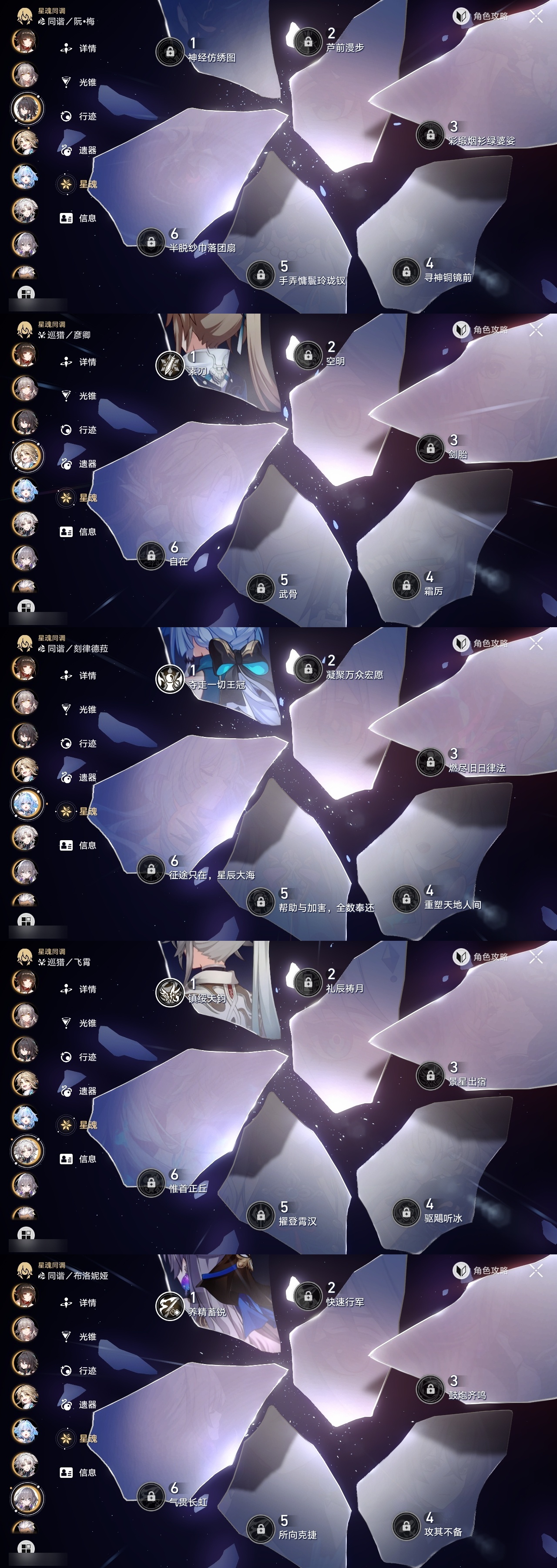 【崩坏·星穹铁道】【lyxq9224】冒险等级:70,女主,五星数量:35,五星角色:云璃 1命飞霄 1命布洛妮娅 1命姬子 1命杰帕德 1命彦卿 1命瓦尔特 1命克拉拉 1命遐蝶 1命白厄 1命刻律德菈 1命长夜月 1命希儿白露灵砂星期日托帕账账风堇知更鸟archer丹恒·腾荒昔涟大丽花__五星光锥:记一位星神的陨落 5精记忆永不落幕 5精时节不居 3精落日时起舞星海巡航制胜的瞬间银河铁道之夜于夜色中我将,巡征追猎镜中故我黎明恰如此燃烧理想燃烧的地狱__四星角色:阿兰 6命娜塔莎 6命虎克 6命貊泽 6命黑塔 6命艾丝妲 6命停云 6命素裳 6命三月七 6命佩拉 6命驭空 6命卢卡 6命玲可 6命桂乃芬 6命雪衣 6命加拉赫 6命桑博 5命青雀 5命寒鸦 5命米沙 5命丹恒 4命希露瓦 4命记忆队 白厄队