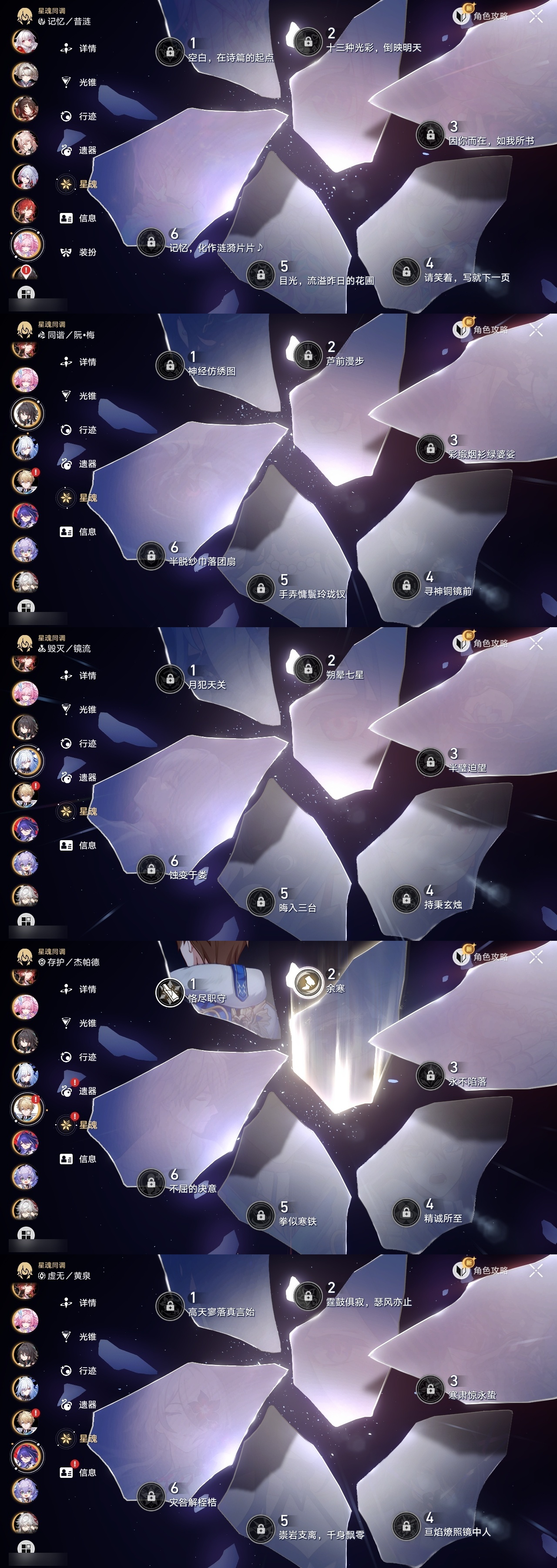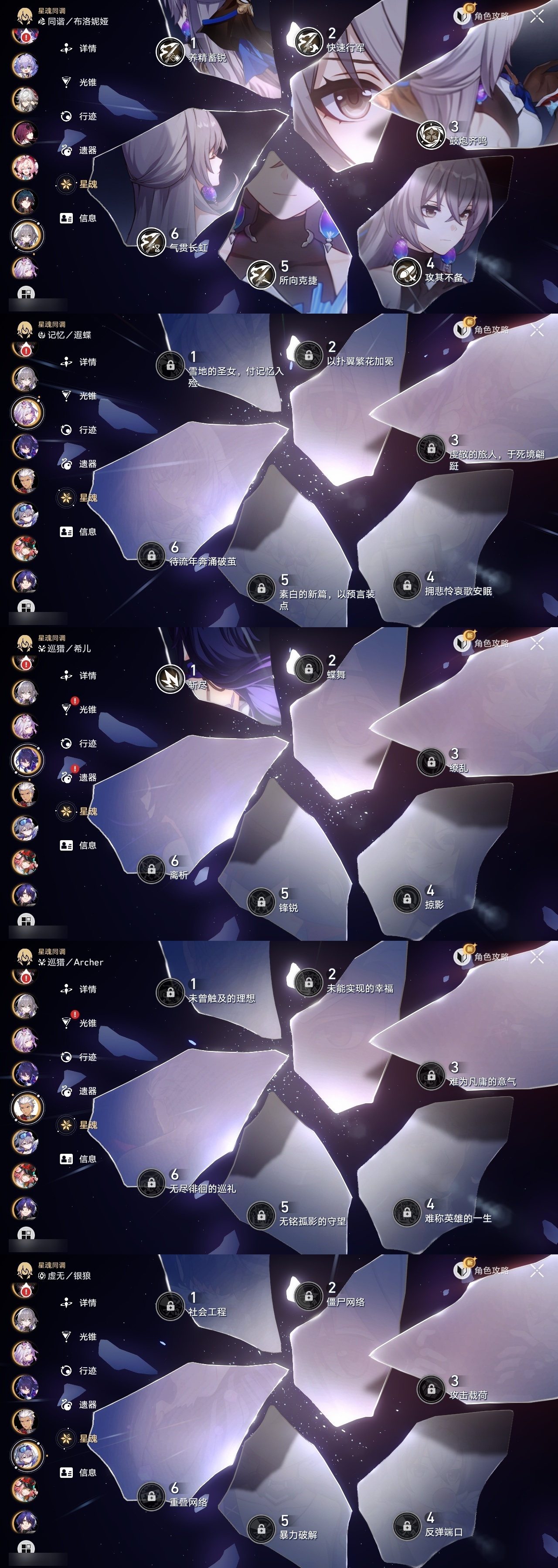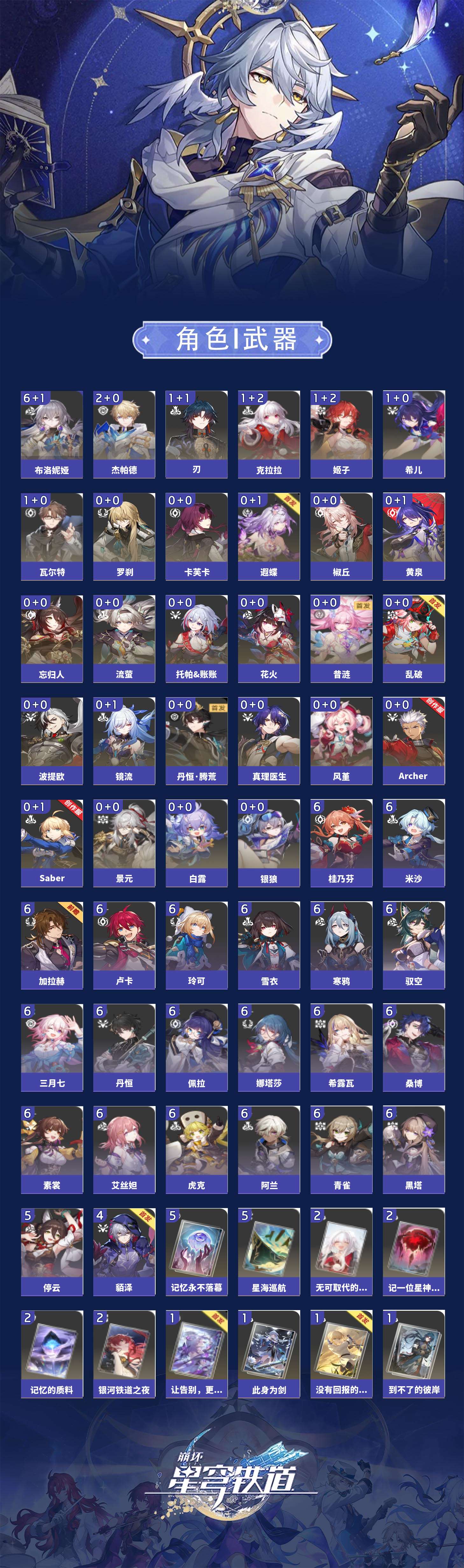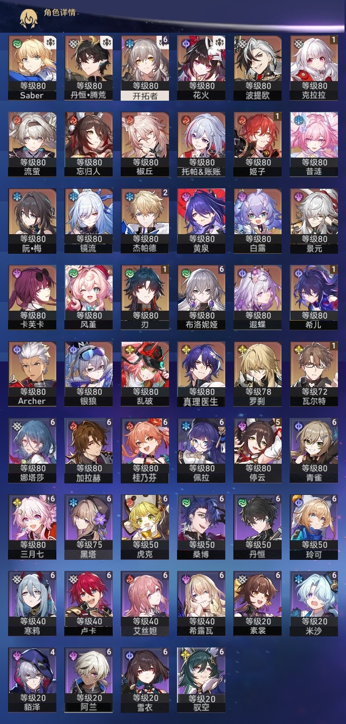 【崩坏·星穹铁道】【lyxq9220】冒险等级:70,女主,五星数量:40,五星角色:布洛妮娅 6命杰帕德 2命希儿 1命姬子 1命瓦尔特 1命克拉拉 1命刃 1命椒丘银狼景元白露乱破忘归人罗刹卡芙卡遐蝶镜流托帕账账真理医生花火黄泉风堇saberarcher丹恒·腾荒昔涟波提欧流萤__五星光锥:星海巡航 5精记忆永不落幕 5精记忆的质料 2精记一位星神的陨落 2精银河铁道之夜 2精无可取代的东西 2精但战斗还未结束到不了的彼岸让告别,更美一些此身为剑行于流逝的岸没有回报的加冕__四星角色:阿兰 6命娜塔莎 6命虎克 6命黑塔 6命丹恒 6命艾丝妲 6命希露瓦 6命素裳 6命桑博 6命三月七 6命青雀 6命佩拉 6命驭空 6命卢卡 6命玲可 6命桂乃芬 6命寒鸦 6命雪衣 6命米沙 6命加拉赫 6命停云 5命貊泽 4命遐碟黄泉带专队伍