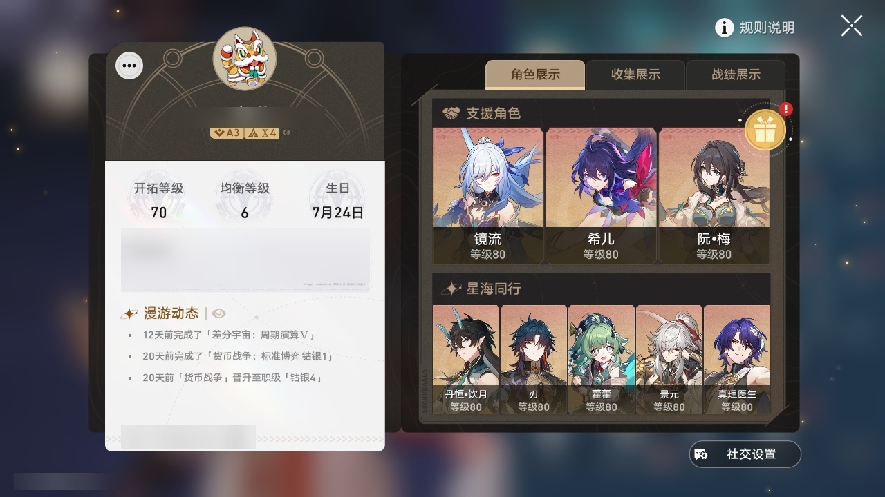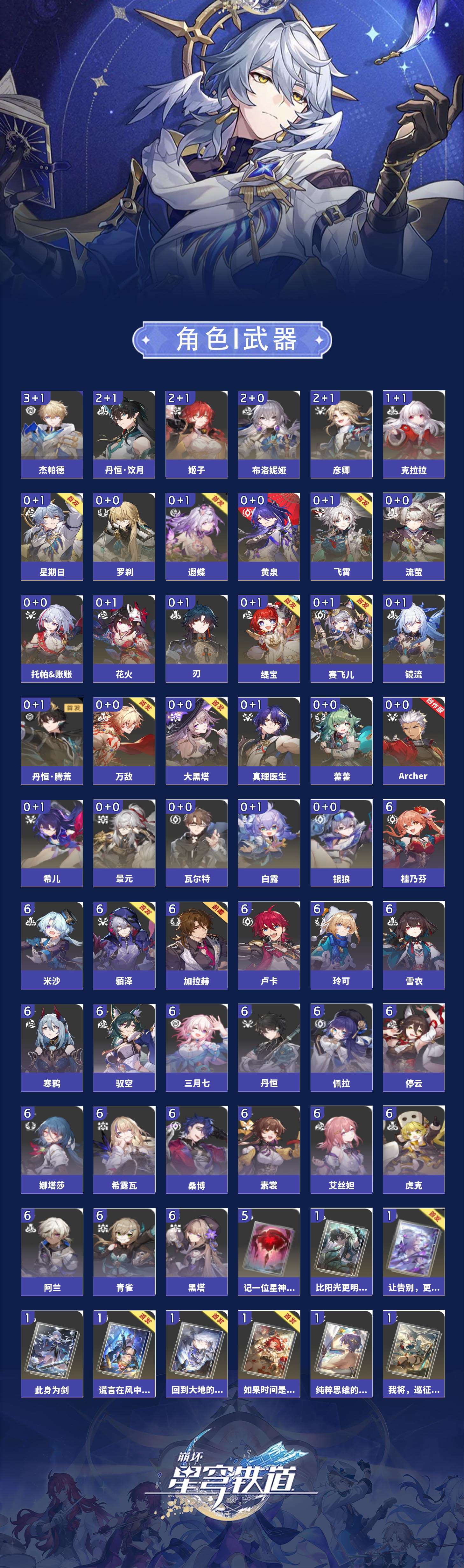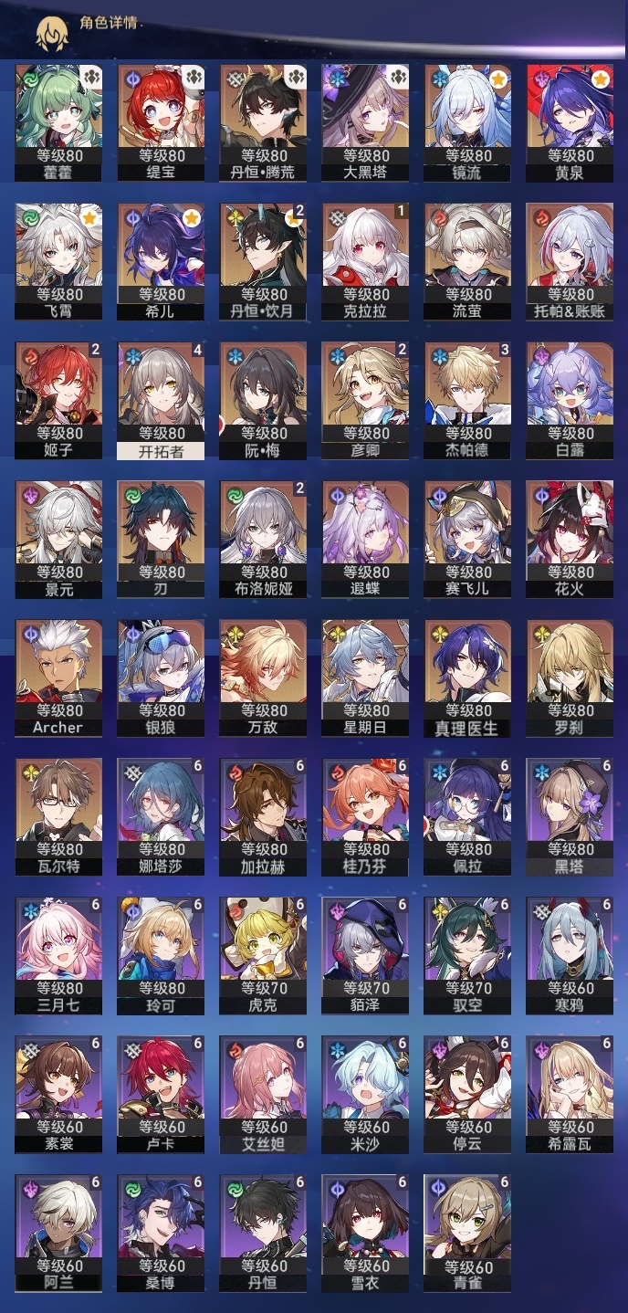 【崩坏·星穹铁道】【lyxq9261】冒险等级:70,女主,五星数量:49,五星角色:杰帕德 3命布洛妮娅 2命姬子 2命彦卿 2命丹恒·饮月 2命克拉拉 1命飞霄银狼景元希儿白露瓦尔特星期日大黑塔罗刹缇宝万敌刃遐蝶镜流托帕账账藿藿真理医生花火黄泉赛飞儿archer丹恒·腾荒流萤__五星光锥:记一位星神的陨落 5精制胜的瞬间制胜的瞬间银河铁道之夜银河铁道之夜无可取代的东西时节不居如泥酣眠于夜色中我将,巡征追猎回到大地的飞行如果时间是一朵花到不了的彼岸比阳光更明亮的让告别,更美一些此身为剑纯粹思维的洗礼游戏尘寰谎言在风中飘扬纵然山河万程__四星角色:阿兰 6命娜塔莎 6命虎克 6命貊泽 6命黑塔 6命丹恒 6命艾丝妲 6命希露瓦 6命停云 6命素裳 6命桑博 6命三月七 6命青雀 6命佩拉 6命驭空 6命卢卡 6命玲可 6命桂乃芬 6命寒鸦 6命雪衣 6命米沙 6命加拉赫 6命遐碟带专武 角色多