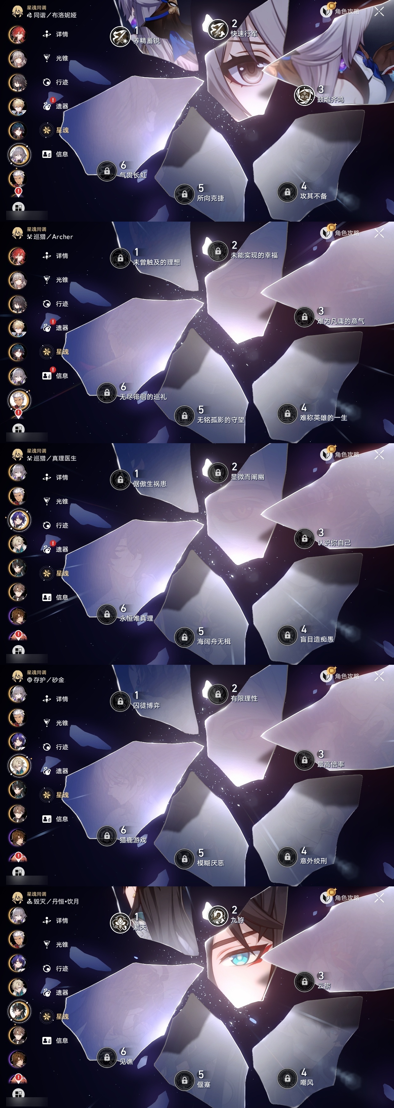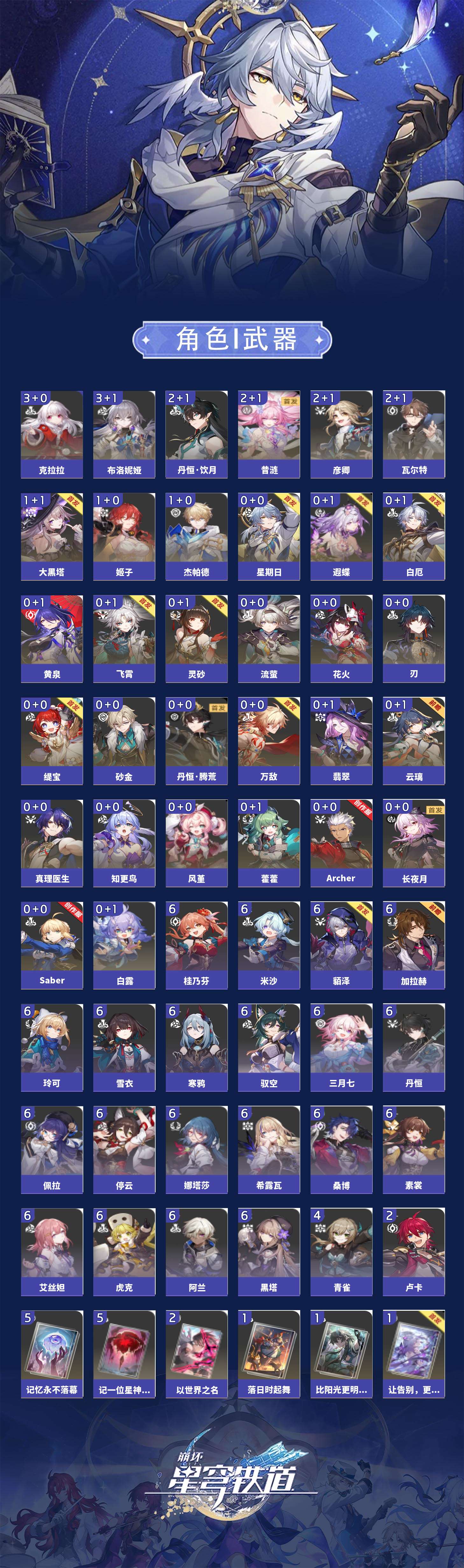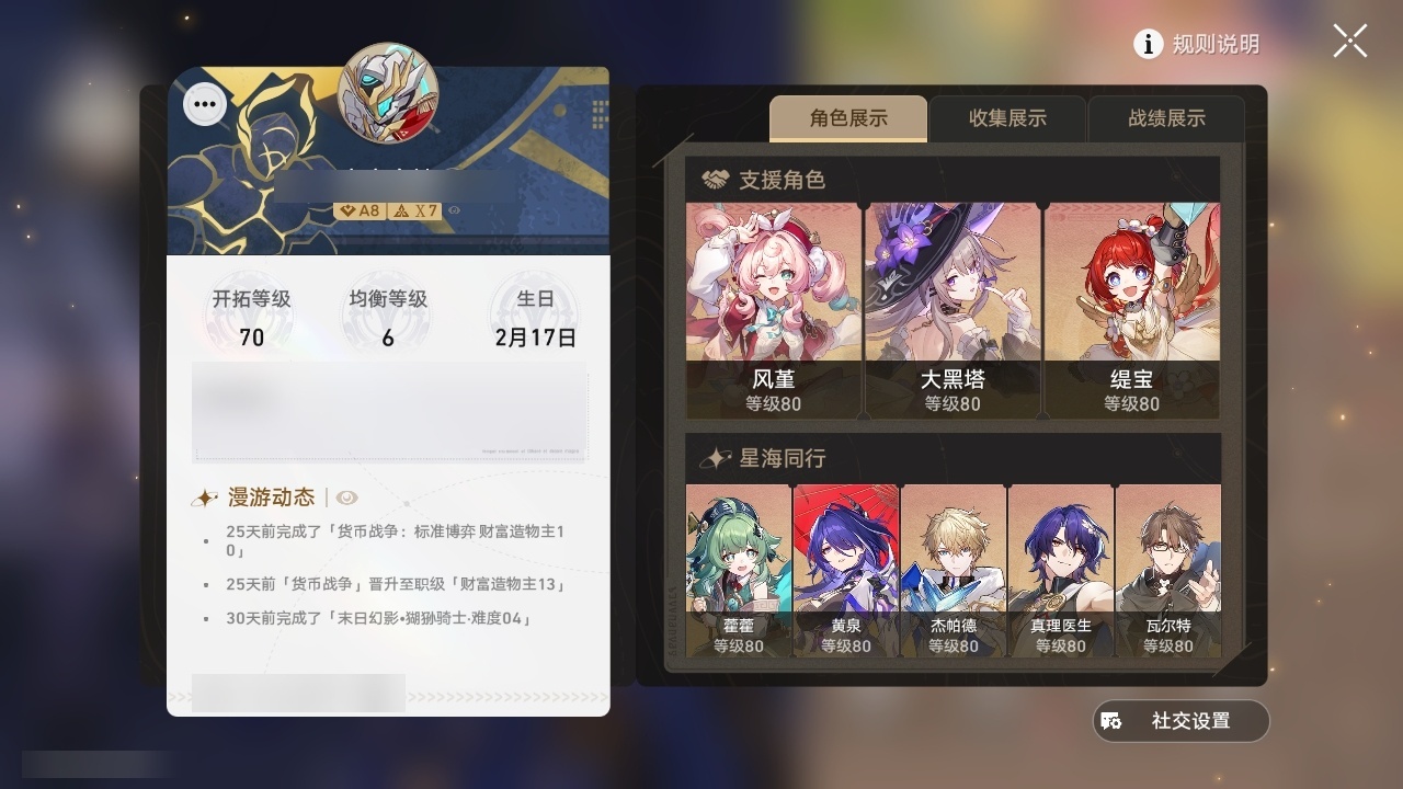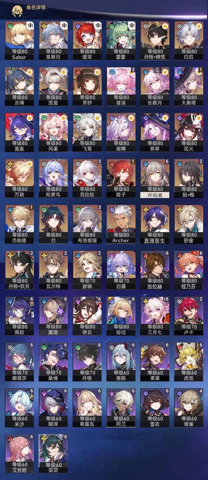 【崩坏·星穹铁道】【lyxq9257】冒险等级:70,女主,五星数量:54,五星角色:布洛妮娅 3命克拉拉 3命彦卿 2命瓦尔特 2命丹恒·饮月 2命昔涟 2命姬子 1命杰帕德 1命大黑塔 1命云璃飞霄白露灵砂星期日缇宝万敌刃遐蝶藿藿真理医生花火黄泉风堇砂金知更鸟白厄saberarcher长夜月丹恒·腾荒流萤翡翠__五星光锥:记一位星神的陨落 5精不息的演算 5精记忆永不落幕 5精以世界之名 2精落日时起舞星海巡航以世界之名时节不居如泥酣眠但战斗还未结束我将,巡征追猎唯有香如故向着不可追问处孤独的疗愈比阳光更明亮的让告别,更美一些惊魂夜镜中故我行于流逝的岸黎明恰如此燃烧爱如此刻永恒偏偏希望无价__四星角色:阿兰 6命娜塔莎 6命虎克 6命貊泽 6命黑塔 6命丹恒 6命艾丝妲 6命希露瓦 6命停云 6命素裳 6命桑博 6命三月七 6命佩拉 6命驭空 6命玲可 6命桂乃芬 6命寒鸦 6命雪衣 6命米沙 6命加拉赫 6命青雀 4命卢卡 2命