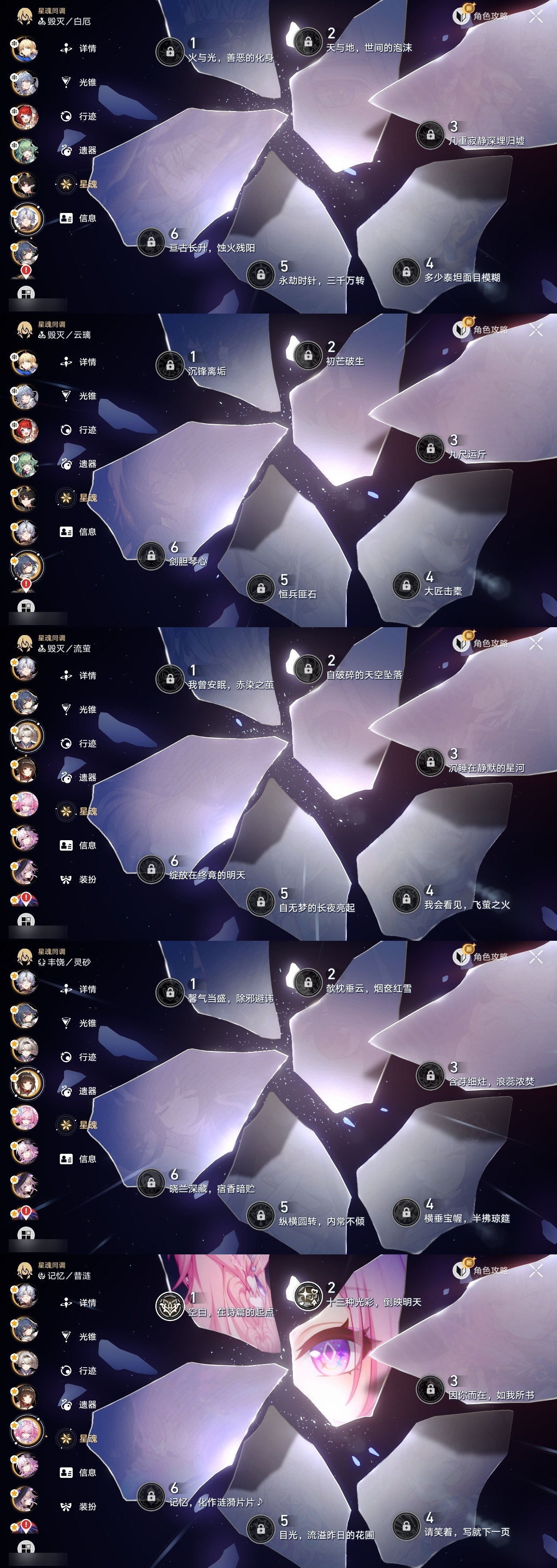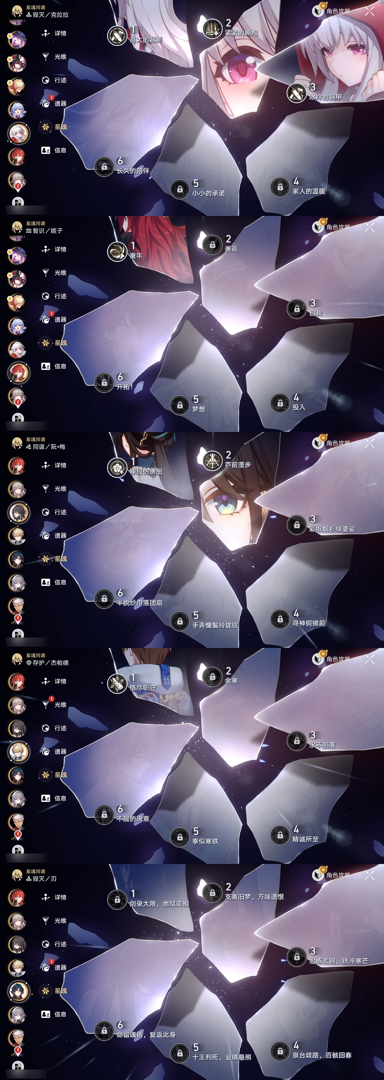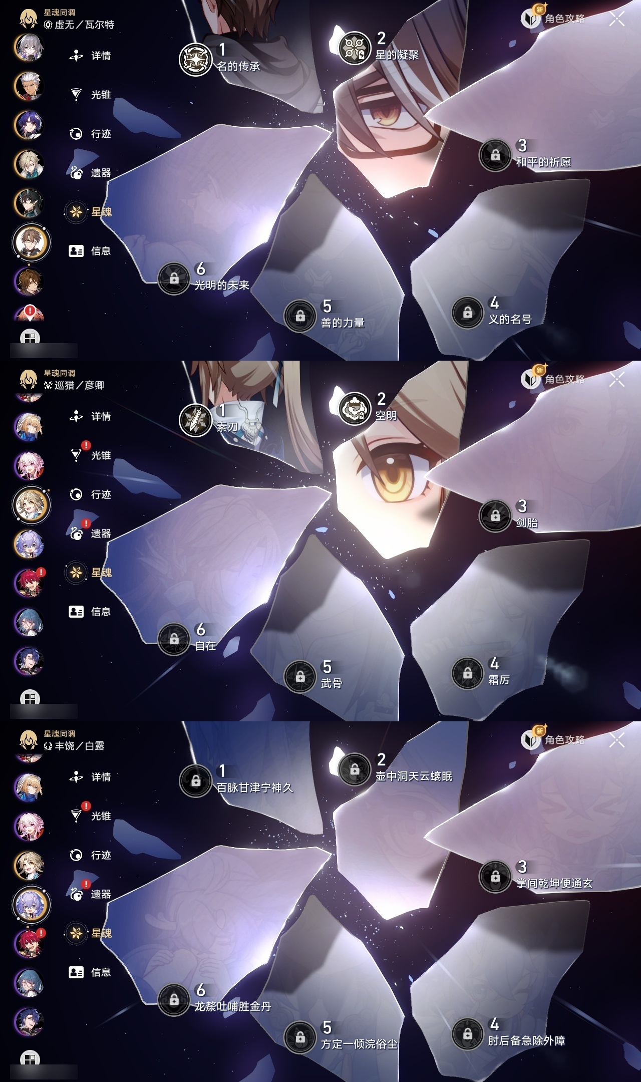 【崩坏·星穹铁道】【lyxq9257】冒险等级:70,女主,五星数量:54,五星角色:布洛妮娅 3命克拉拉 3命彦卿 2命瓦尔特 2命丹恒·饮月 2命昔涟 2命姬子 1命杰帕德 1命大黑塔 1命云璃飞霄白露灵砂星期日缇宝万敌刃遐蝶藿藿真理医生花火黄泉风堇砂金知更鸟白厄saberarcher长夜月丹恒·腾荒流萤翡翠__五星光锥:记一位星神的陨落 5精不息的演算 5精记忆永不落幕 5精以世界之名 2精落日时起舞星海巡航以世界之名时节不居如泥酣眠但战斗还未结束我将,巡征追猎唯有香如故向着不可追问处孤独的疗愈比阳光更明亮的让告别,更美一些惊魂夜镜中故我行于流逝的岸黎明恰如此燃烧爱如此刻永恒偏偏希望无价__四星角色:阿兰 6命娜塔莎 6命虎克 6命貊泽 6命黑塔 6命丹恒 6命艾丝妲 6命希露瓦 6命停云 6命素裳 6命桑博 6命三月七 6命佩拉 6命驭空 6命玲可 6命桂乃芬 6命寒鸦 6命雪衣 6命米沙 6命加拉赫 6命青雀 4命卢卡 2命