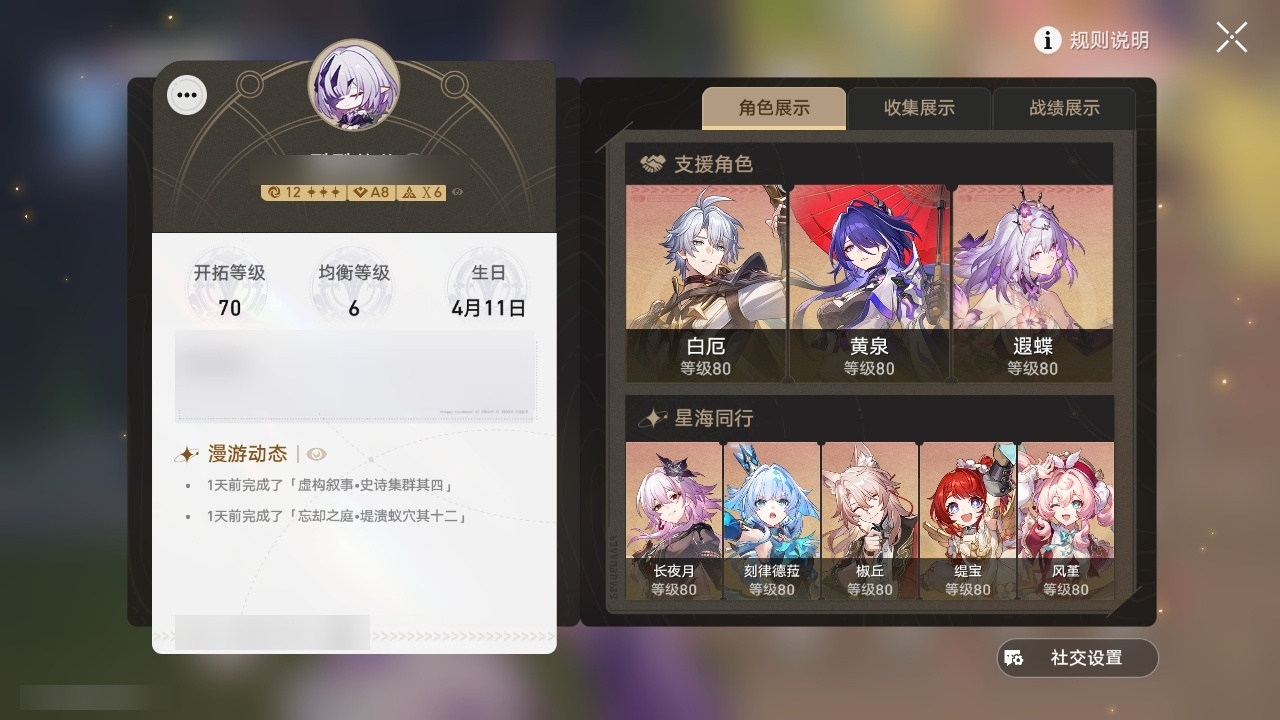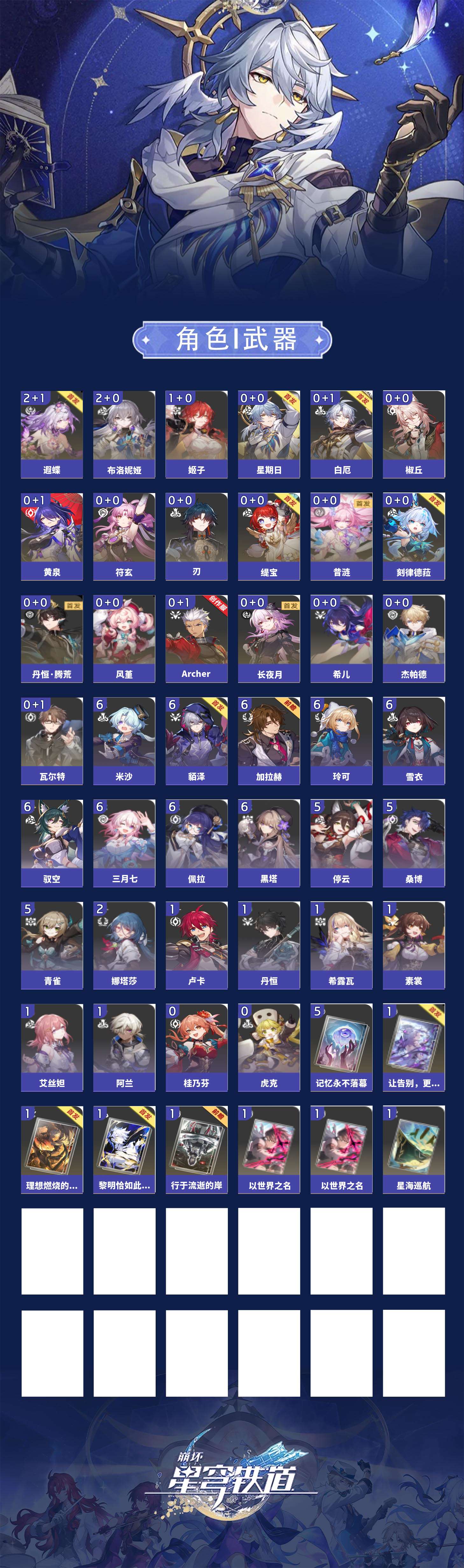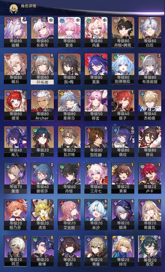 【崩坏·星穹铁道】【lyxq9235】冒险等级:70,女主,五星数量:27,五星角色:布洛妮娅 2命遐蝶 2命姬子 1命椒丘希儿杰帕德瓦尔特星期日缇宝刃符玄黄泉风堇白厄archer刻律德菈长夜月丹恒·腾荒昔涟__五星光锥:记忆永不落幕 5精星海巡航以世界之名以世界之名让告别,更美一些行于流逝的岸黎明恰如此燃烧理想燃烧的地狱__四星角色:貊泽 6命黑塔 6命三月七 6命佩拉 6命驭空 6命玲可 6命雪衣 6命米沙 6命加拉赫 6命停云 5命桑博 5命青雀 5命娜塔莎 2命阿兰 1命丹恒 1命艾丝妲 1命希露瓦 1命素裳 1命卢卡 1命虎克桂乃芬21遐蝶记忆战舰,白厄队