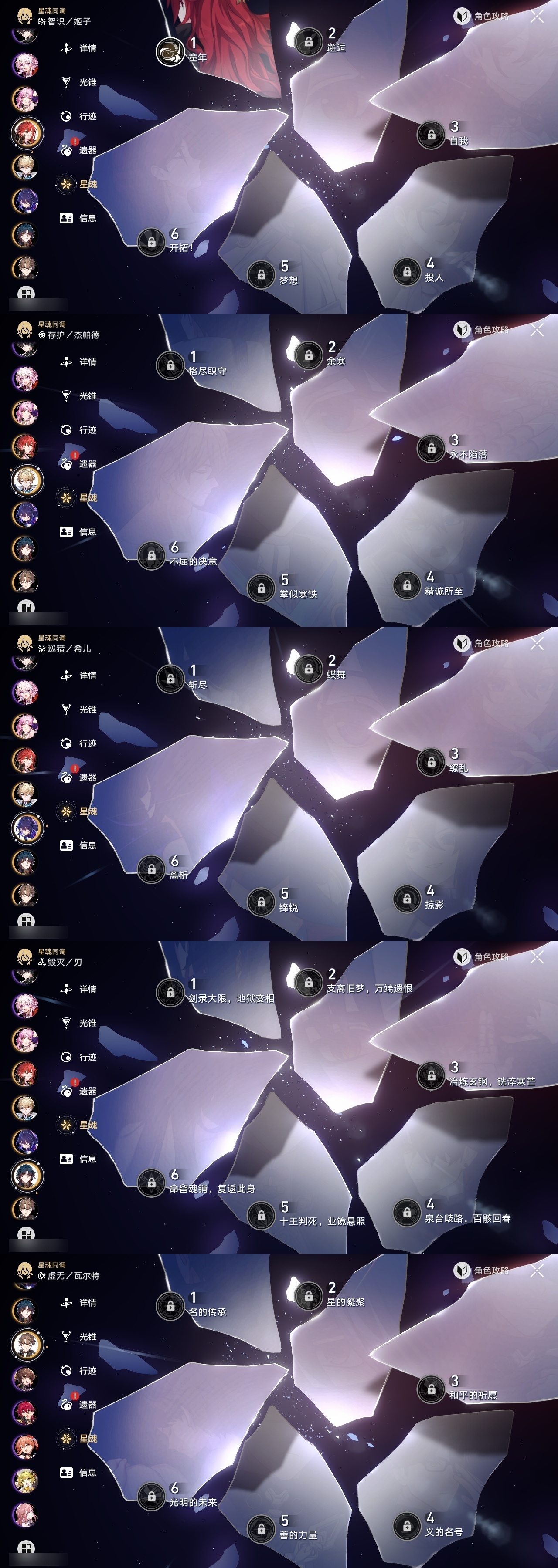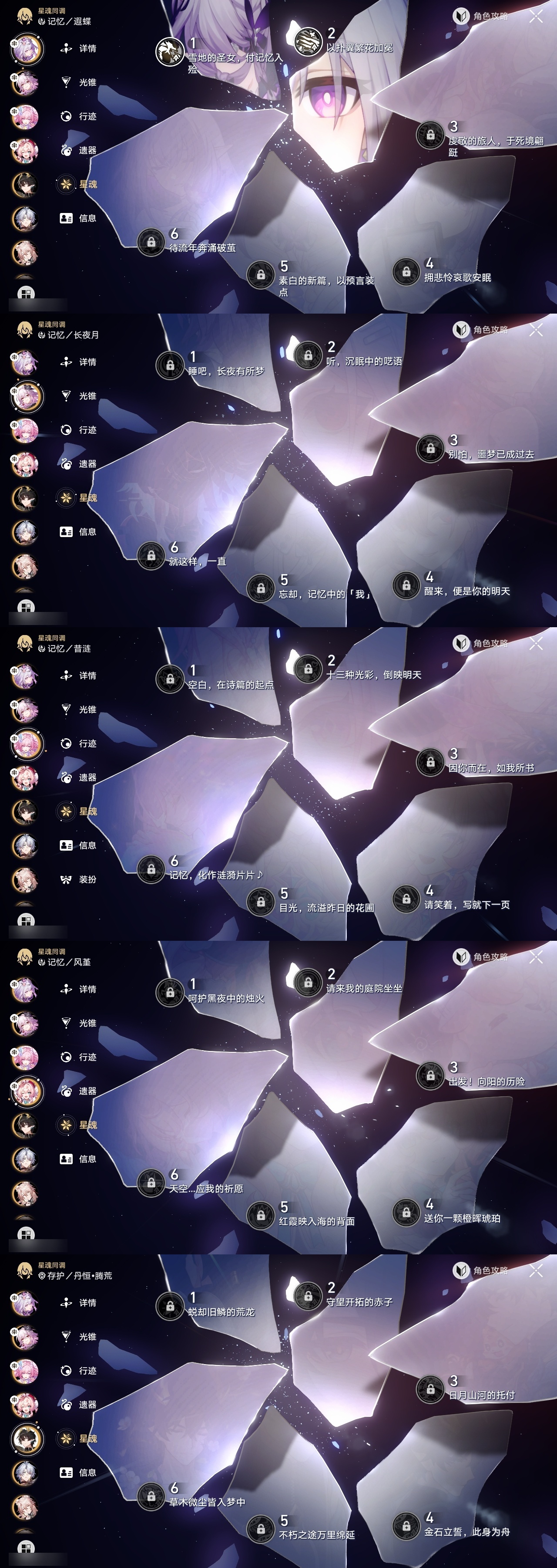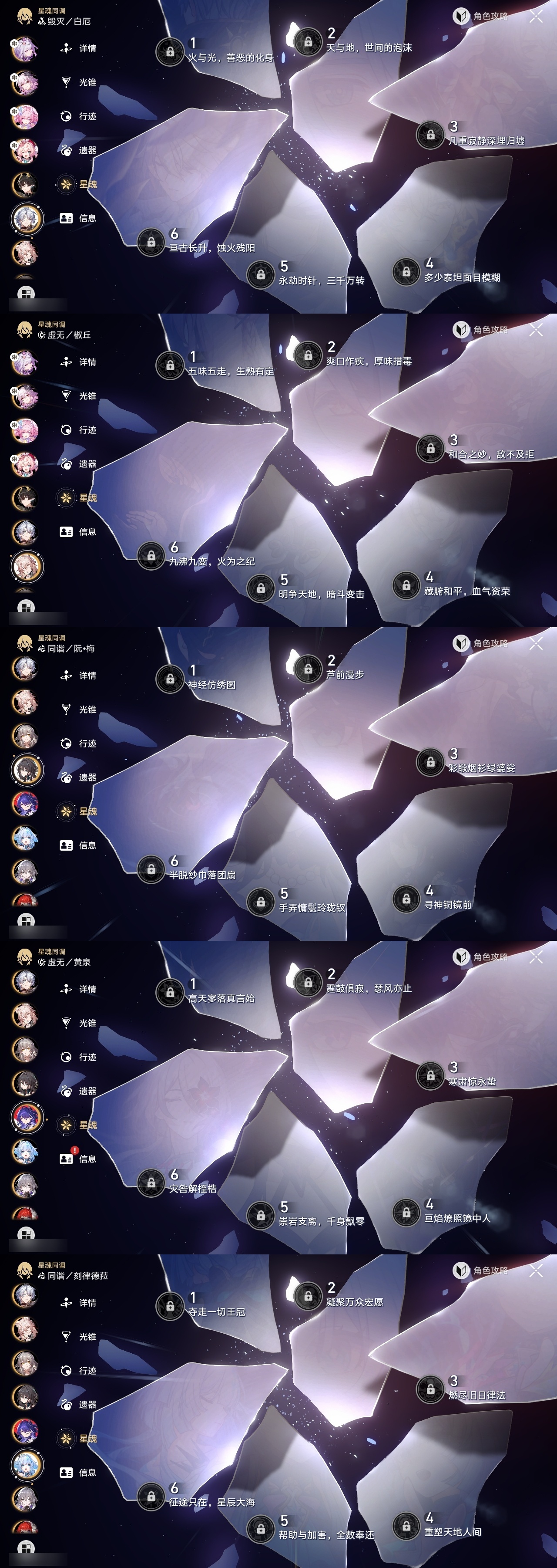 【崩坏·星穹铁道】【lyxq9235】冒险等级:70,女主,五星数量:27,五星角色:布洛妮娅 2命遐蝶 2命姬子 1命椒丘希儿杰帕德瓦尔特星期日缇宝刃符玄黄泉风堇白厄archer刻律德菈长夜月丹恒·腾荒昔涟__五星光锥:记忆永不落幕 5精星海巡航以世界之名以世界之名让告别,更美一些行于流逝的岸黎明恰如此燃烧理想燃烧的地狱__四星角色:貊泽 6命黑塔 6命三月七 6命佩拉 6命驭空 6命玲可 6命雪衣 6命米沙 6命加拉赫 6命停云 5命桑博 5命青雀 5命娜塔莎 2命阿兰 1命丹恒 1命艾丝妲 1命希露瓦 1命素裳 1命卢卡 1命虎克桂乃芬21遐蝶记忆战舰,白厄队