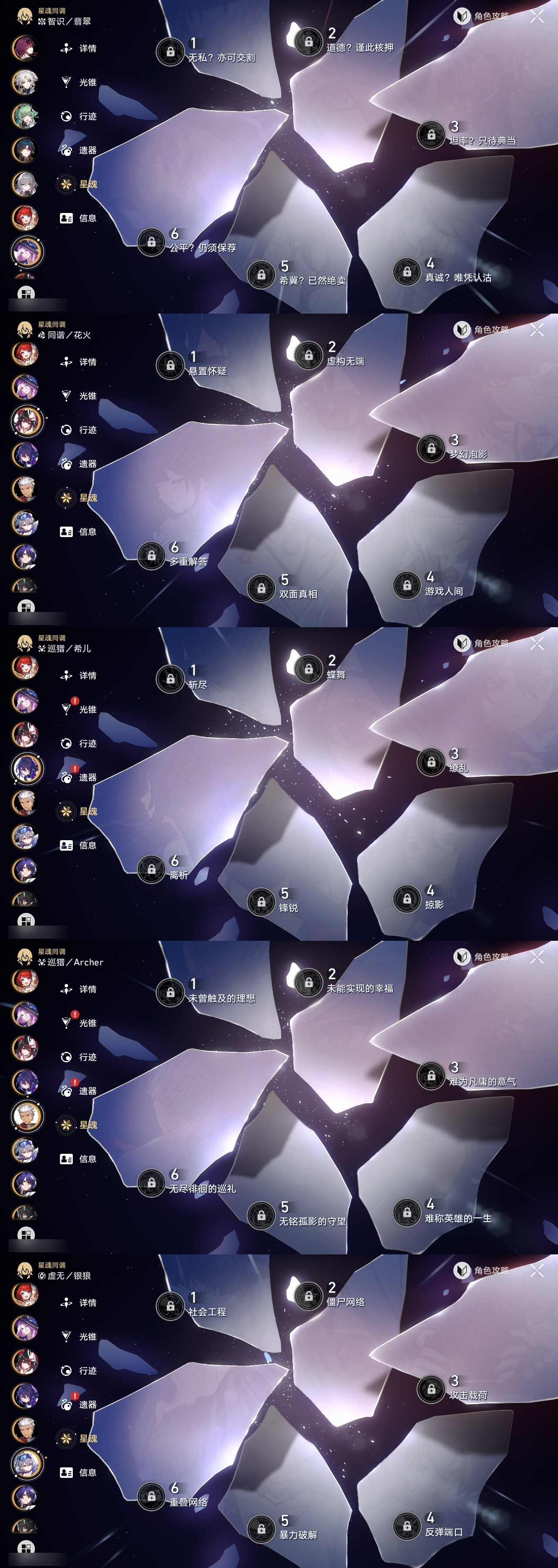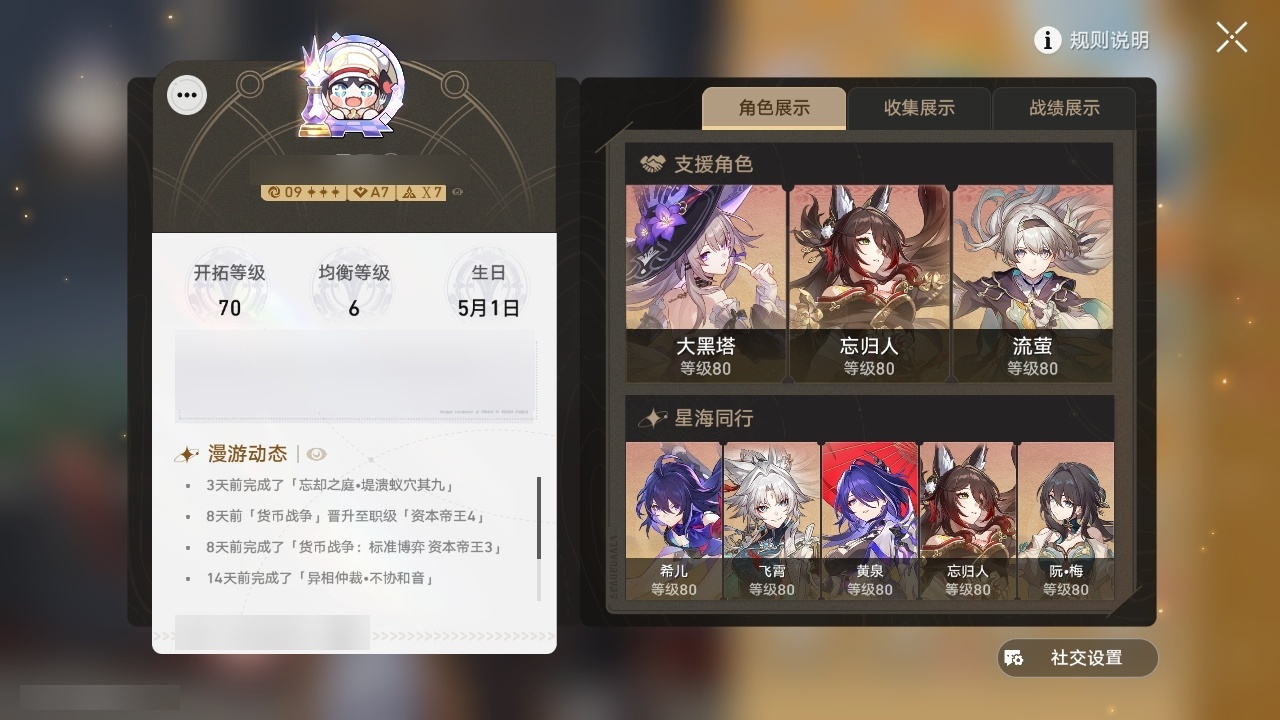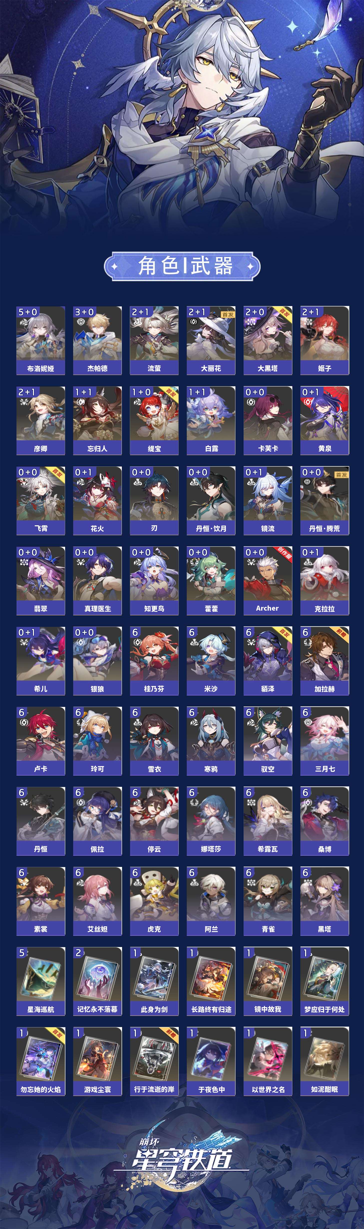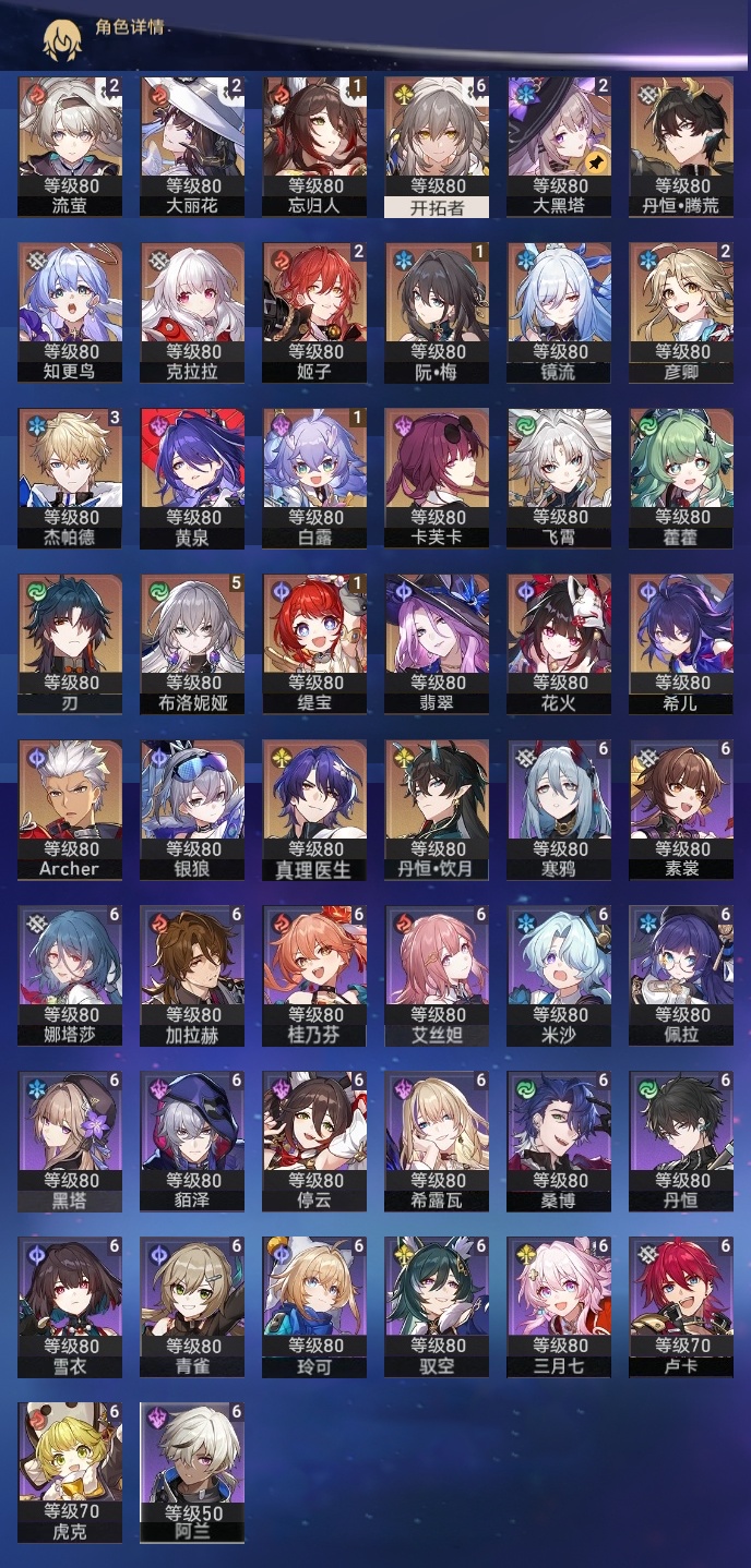 【崩坏·星穹铁道】【lyxq9251】冒险等级:70,女主,五星数量:42,五星角色:布洛妮娅 5命杰帕德 3命姬子 2命彦卿 2命大黑塔 2命大丽花 2命流萤 2命白露 1命忘归人 1命缇宝 1命飞霄银狼希儿克拉拉刃卡芙卡丹恒·饮月镜流藿藿真理医生花火黄泉知更鸟archer丹恒·腾荒翡翠__五星光锥:星海巡航 5精不息的演算 5精记忆永不落幕 2精银河铁道之夜以世界之名无可取代的东西时节不居如泥酣眠于夜色中长路终有归途此身为剑镜中故我游戏尘寰行于流逝的岸勿忘她的火焰梦应归于何处__四星角色:阿兰 6命娜塔莎 6命虎克 6命貊泽 6命黑塔 6命丹恒 6命艾丝妲 6命希露瓦 6命停云 6命素裳 6命桑博 6命三月七 6命青雀 6命佩拉 6命驭空 6命卢卡 6命玲可 6命桂乃芬 6命寒鸦 6命雪衣 6命米沙 6命加拉赫 6命击破队 二命流萤大丽花 二命大黑塔