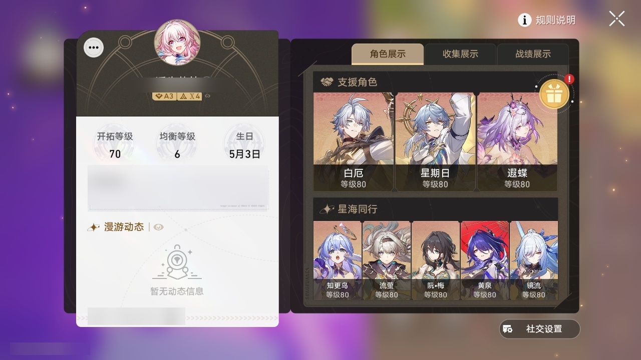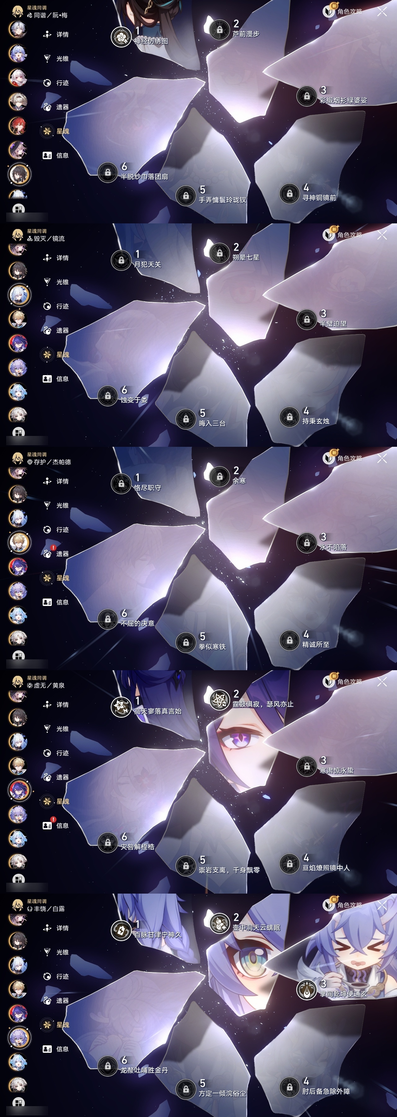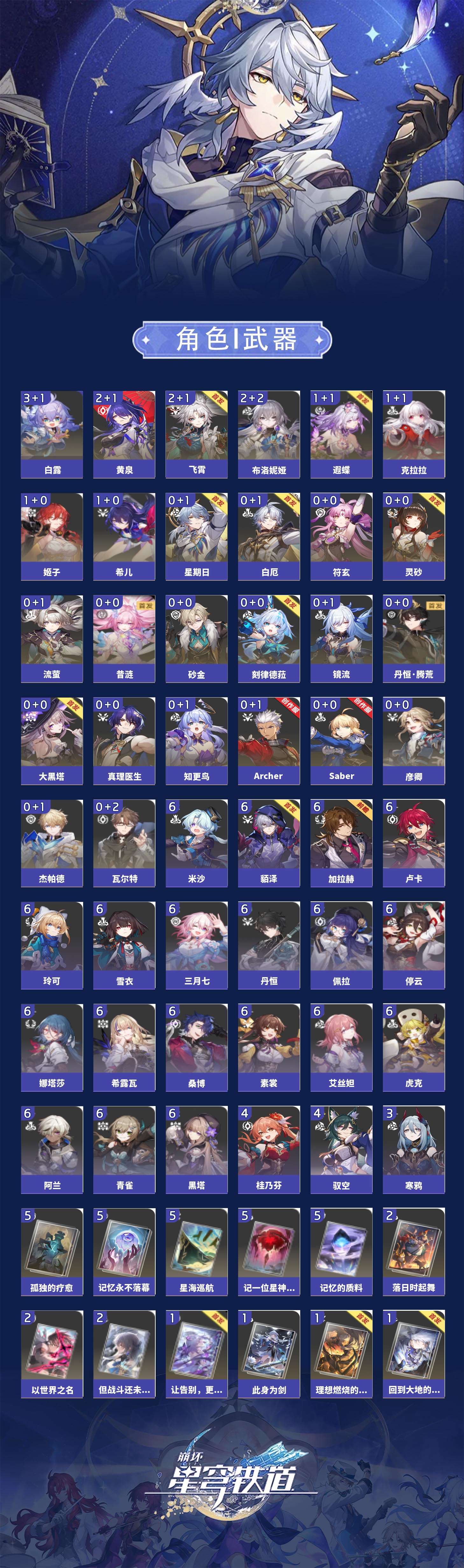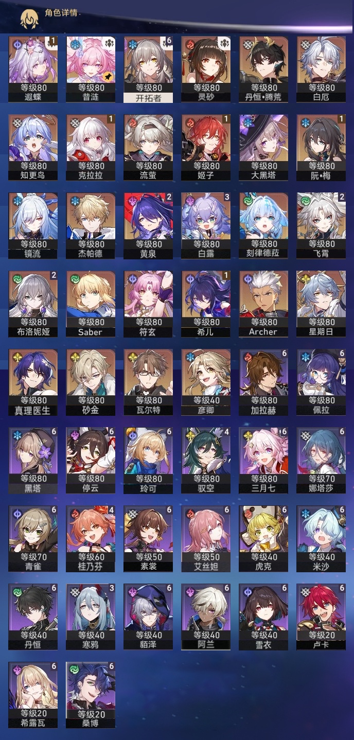 【崩坏·星穹铁道】【lyxq9262】冒险等级:70,女主,五星数量:49,五星角色:白露 3命飞霄 2命布洛妮娅 2命黄泉 2命希儿 1命姬子 1命克拉拉 1命遐蝶 1命灵砂杰帕德彦卿瓦尔特星期日大黑塔符玄镜流真理医生砂金知更鸟白厄saberarcher刻律德菈丹恒·腾荒昔涟流萤__五星光锥:星海巡航 5精记忆的质料 5精记一位星神的陨落 5精不息的演算 5精孤独的疗愈 5精记忆永不落幕 5精落日时起舞 2精以世界之名 2精但战斗还未结束 2精制胜的瞬间无可取代的东西时节不居时节不居我将,巡征追猎回到大地的飞行让告别,更美一些此身为剑镜中故我行于流逝的岸夜色流光溢彩黎明恰如此燃烧理想燃烧的地狱梦应归于何处__四星角色:阿兰 6命娜塔莎 6命虎克 6命貊泽 6命黑塔 6命丹恒 6命艾丝妲 6命希露瓦 6命停云 6命素裳 6命桑博 6命三月七 6命青雀 6命佩拉 6命卢卡 6命玲可 6命雪衣 6命米沙 6命加拉赫 6命驭空 4命桂乃芬 4命寒鸦 3命白厄带专队伍 二命飞霄追击队