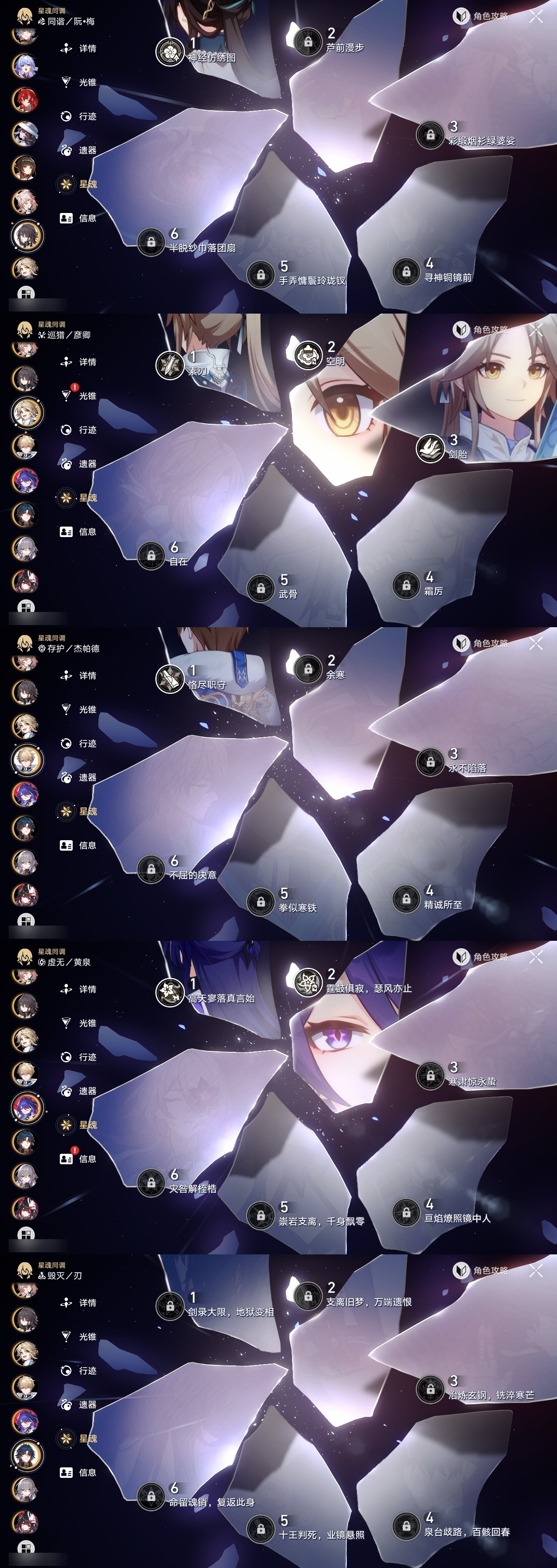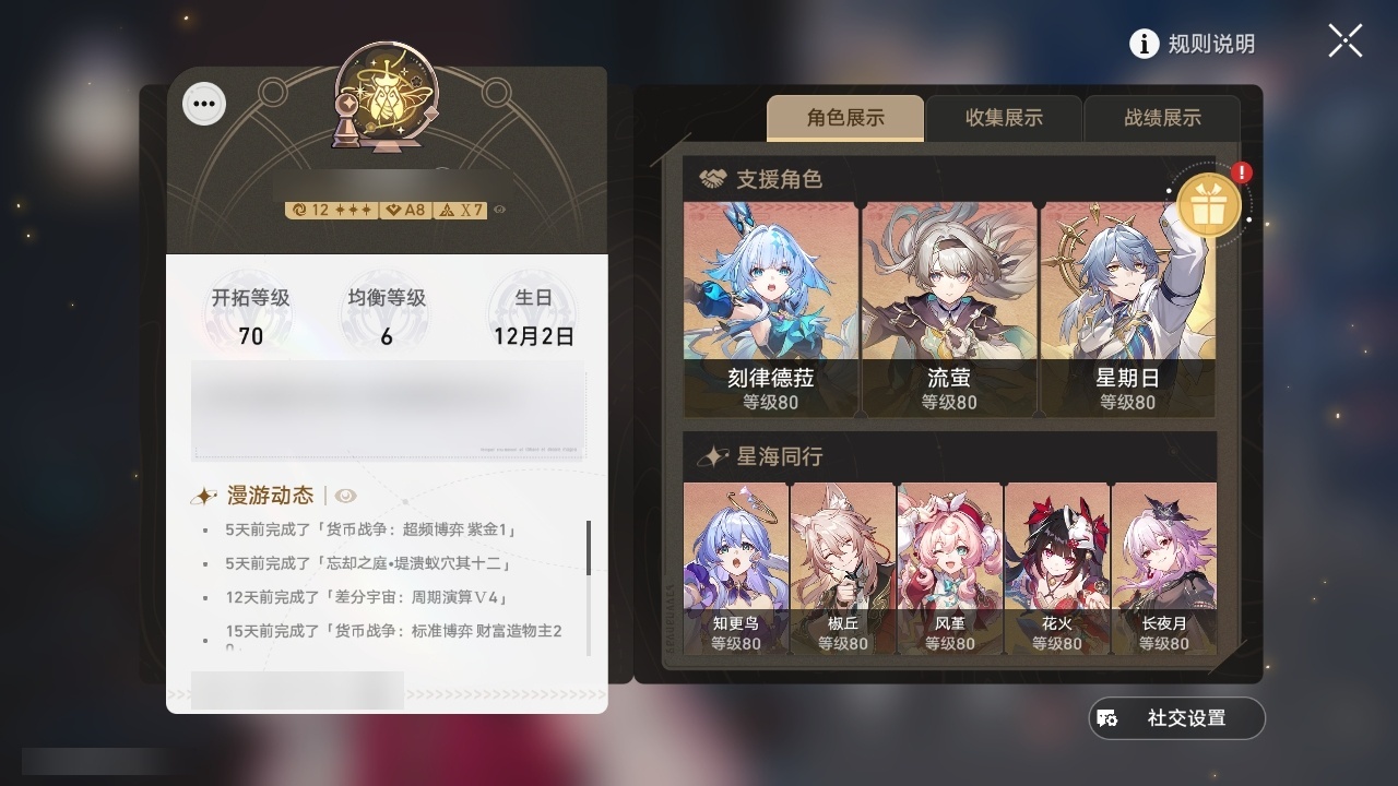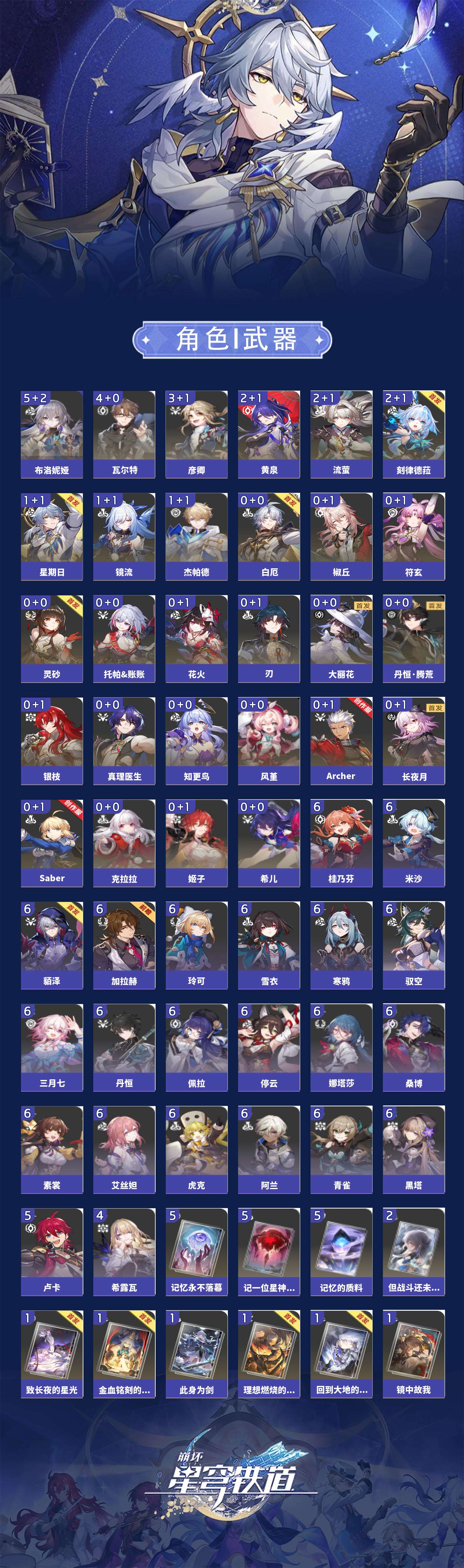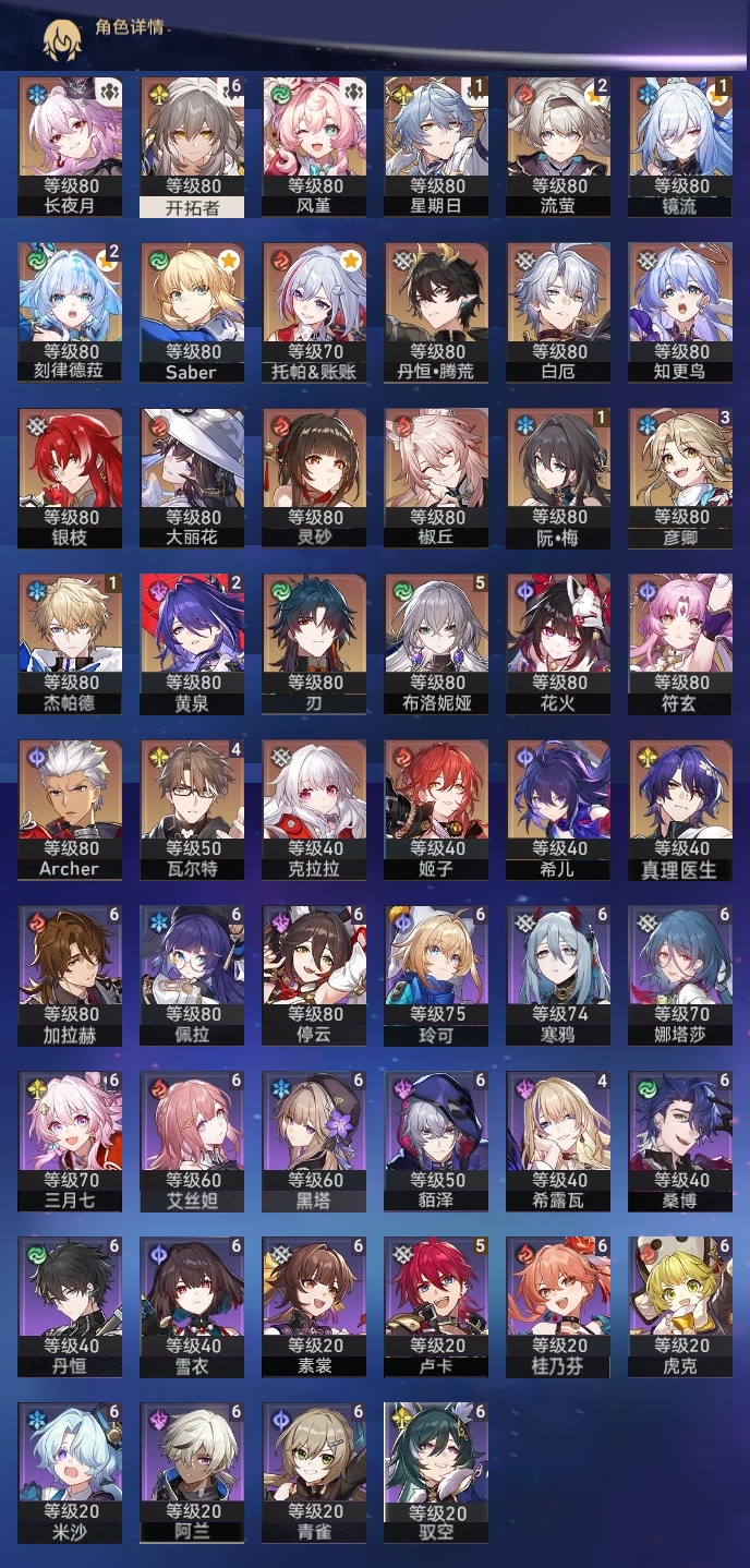 【崩坏·星穹铁道】【lyxq9326】冒险等级:70,女主,五星数量:53,五星角色:布洛妮娅 5命瓦尔特 4命彦卿 3命黄泉 2命刻律德菈 2命流萤 2命杰帕德 1命星期日 1命镜流 1命椒丘希儿姬子灵砂克拉拉刃符玄托帕账账银枝真理医生花火风堇知更鸟白厄saberarcher长夜月丹恒·腾荒大丽花__五星光锥:记忆的质料 5精记一位星神的陨落 5精记忆永不落幕 5精但战斗还未结束 2精星海巡航那无数个春天制胜的瞬间银河铁道之夜银河铁道之夜时节不居如泥酣眠回到大地的飞行到不了的彼岸孤独的疗愈她已闭上双眼此身为剑片刻,留在眼底镜中故我游戏尘寰行于流逝的岸理想燃烧的地狱没有回报的加冕金血铭刻的时代致长夜的星光梦应归于何处__四星角色:阿兰 6命娜塔莎 6命虎克 6命貊泽 6命黑塔 6命丹恒 6命艾丝妲 6命停云 6命素裳 6命桑博 6命三月七 6命青雀 6命佩拉 6命驭空 6命玲可 6命桂乃芬 6命寒鸦 6命雪衣 6命米沙 6命加拉赫 6命卢卡 5命希露瓦 4命白厄队