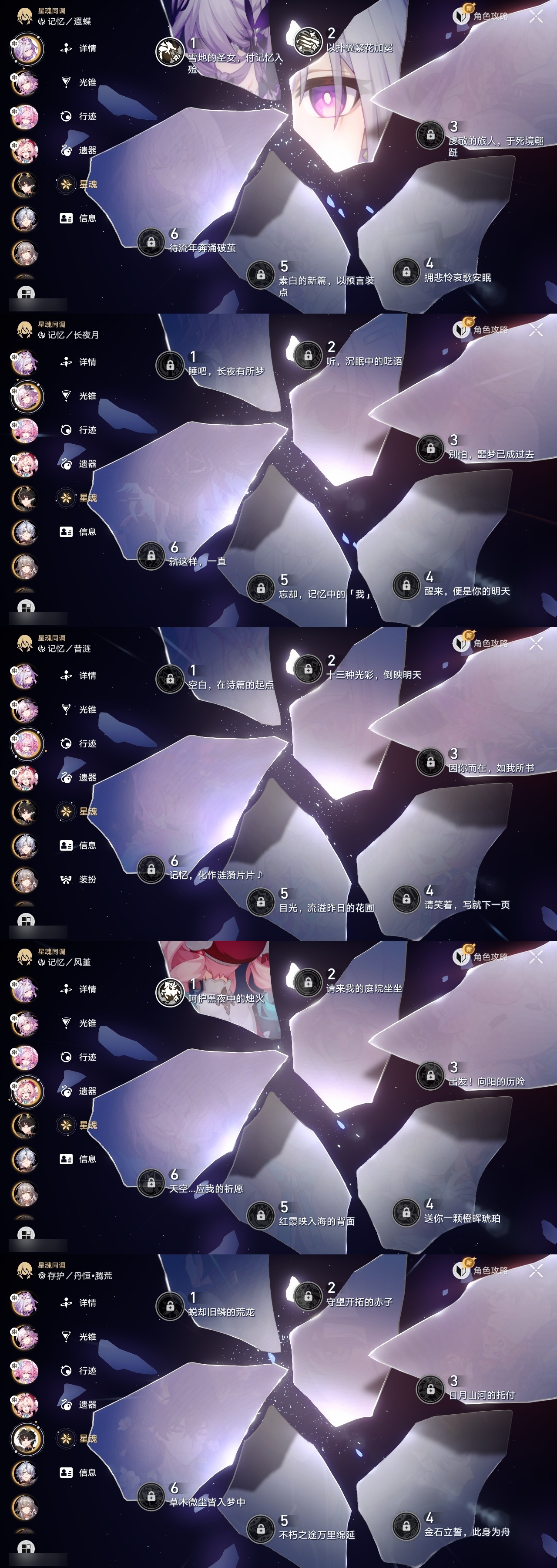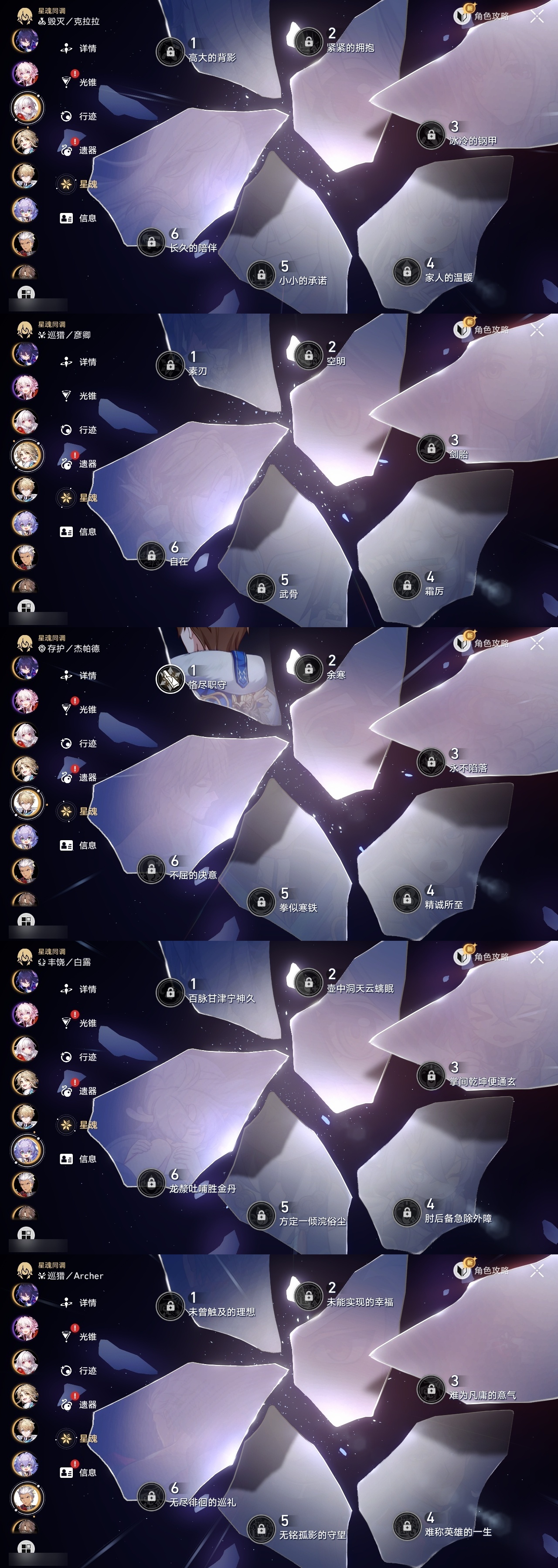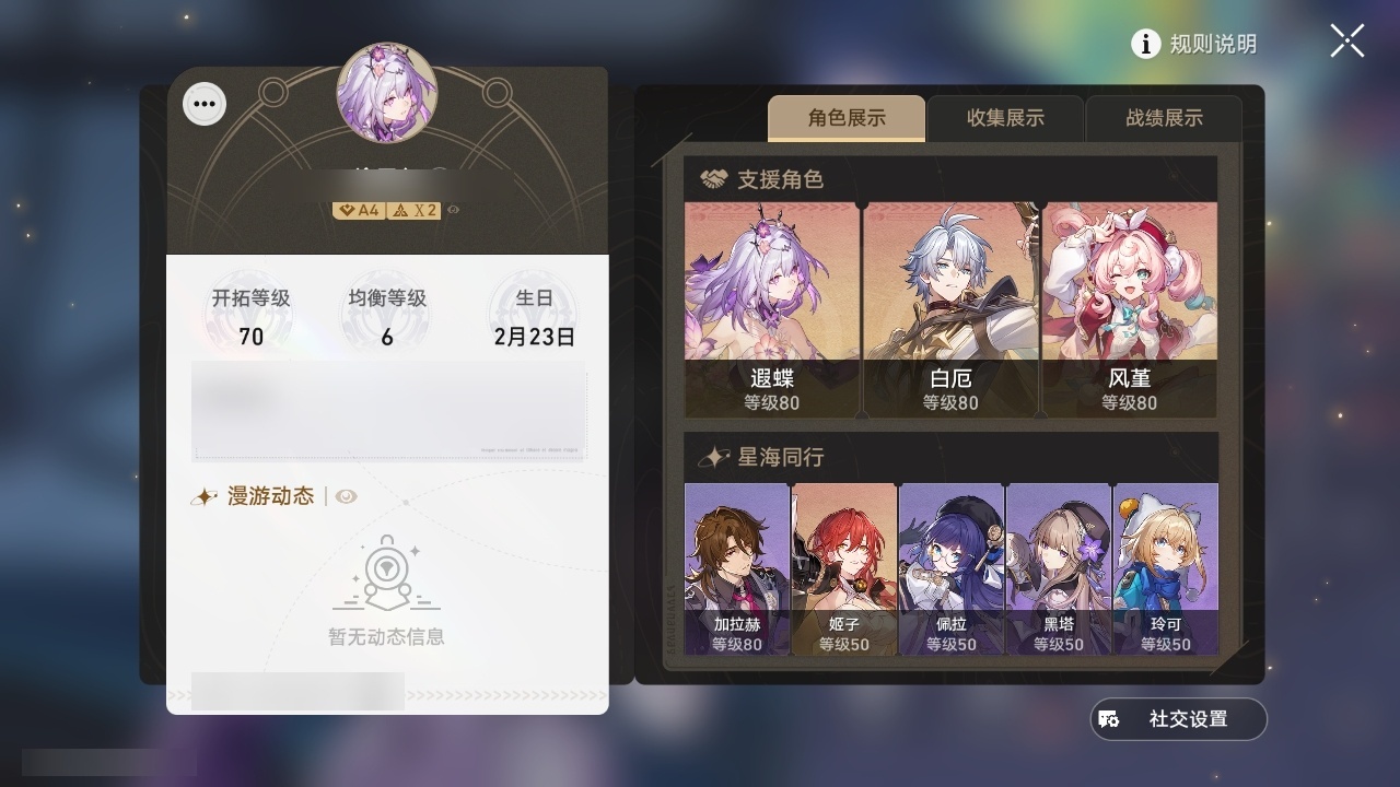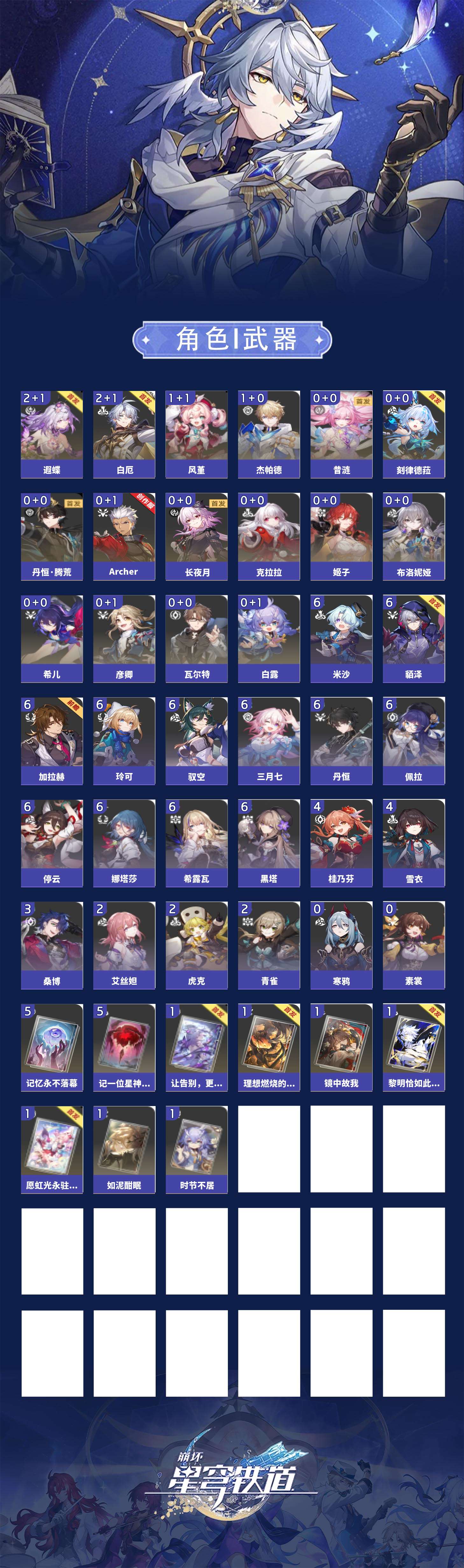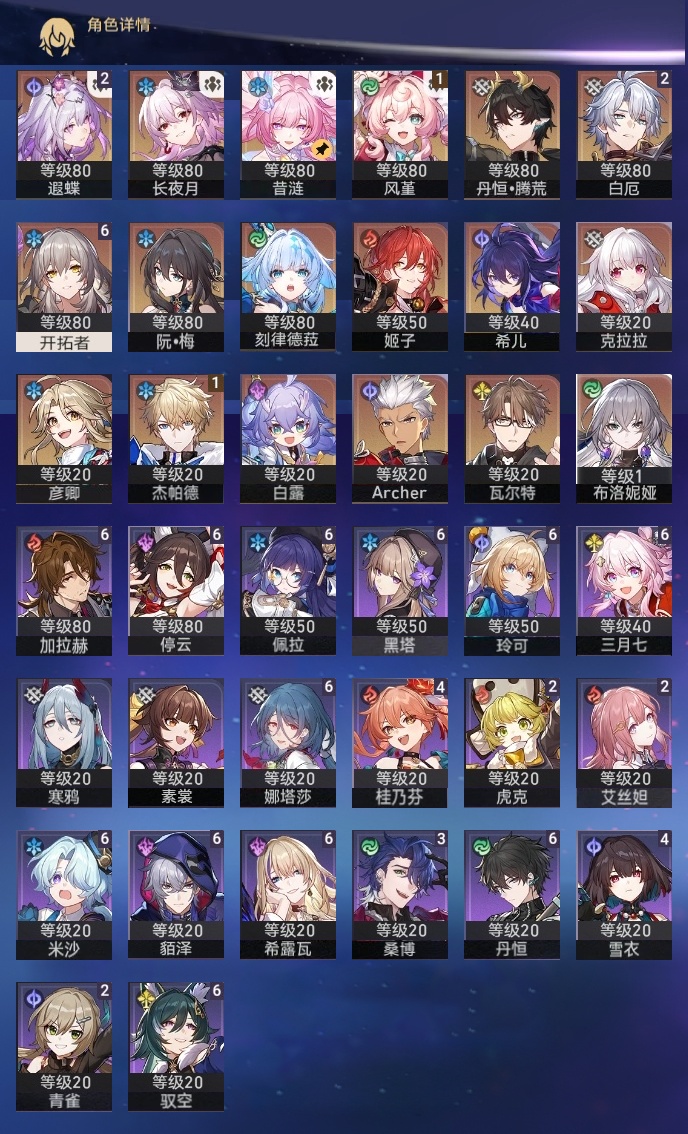【崩坏·星穹铁道】【lyxq9275】冒险等级:70,女主,五星数量:25,五星角色:遐蝶 2命白厄 2命杰帕德 1命风堇 1命希儿白露布洛妮娅姬子彦卿瓦尔特克拉拉archer刻律德菈长夜月丹恒·腾荒昔涟__五星光锥:记一位星神的陨落 5精记忆永不落幕 5精时节不居如泥酣眠让告别,更美一些镜中故我愿虹光永驻天空黎明恰如此燃烧理想燃烧的地狱__四星角色:娜塔莎 6命貊泽 6命黑塔 6命丹恒 6命希露瓦 6命停云 6命三月七 6命佩拉 6命驭空 6命玲可 6命米沙 6命加拉赫 6命桂乃芬 4命雪衣 4命桑博 3命虎克 2命艾丝妲 2命青雀 2命素裳寒鸦21白厄队,21遐碟记忆战舰