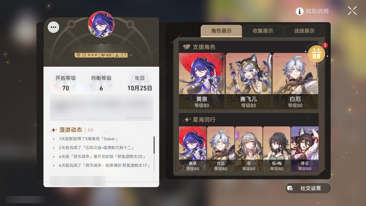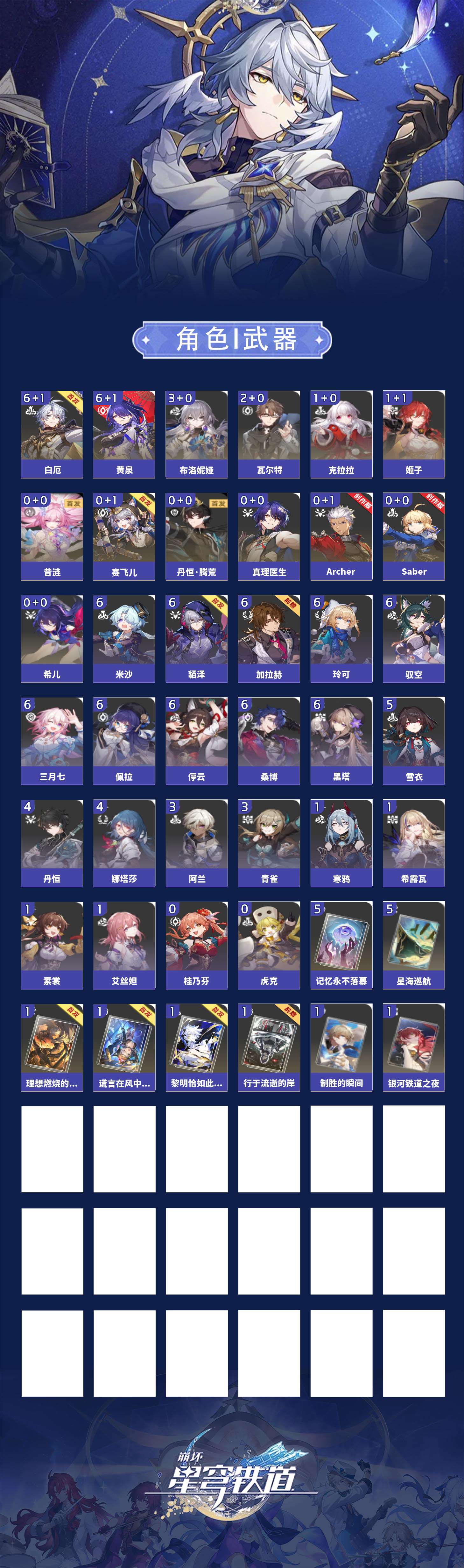 【崩坏·星穹铁道】【lyxq9292】冒险等级:70,女主,五星数量:21,五星角色:黄泉 6命白厄 6命布洛妮娅 3命瓦尔特 2命姬子 1命克拉拉 1命希儿真理医生赛飞儿saberarcher丹恒·腾荒昔涟__五星光锥:星海巡航 5精记忆永不落幕 5精制胜的瞬间银河铁道之夜行于流逝的岸谎言在风中飘扬黎明恰如此燃烧理想燃烧的地狱__四星角色:貊泽 6命黑塔 6命停云 6命桑博 6命三月七 6命佩拉 6命驭空 6命玲可 6命米沙 6命加拉赫 6命雪衣 5命娜塔莎 4命丹恒 4命阿兰 3命青雀 3命艾丝妲 1命希露瓦 1命素裳 1命寒鸦 1命虎克桂乃芬黄泉白厄双满命