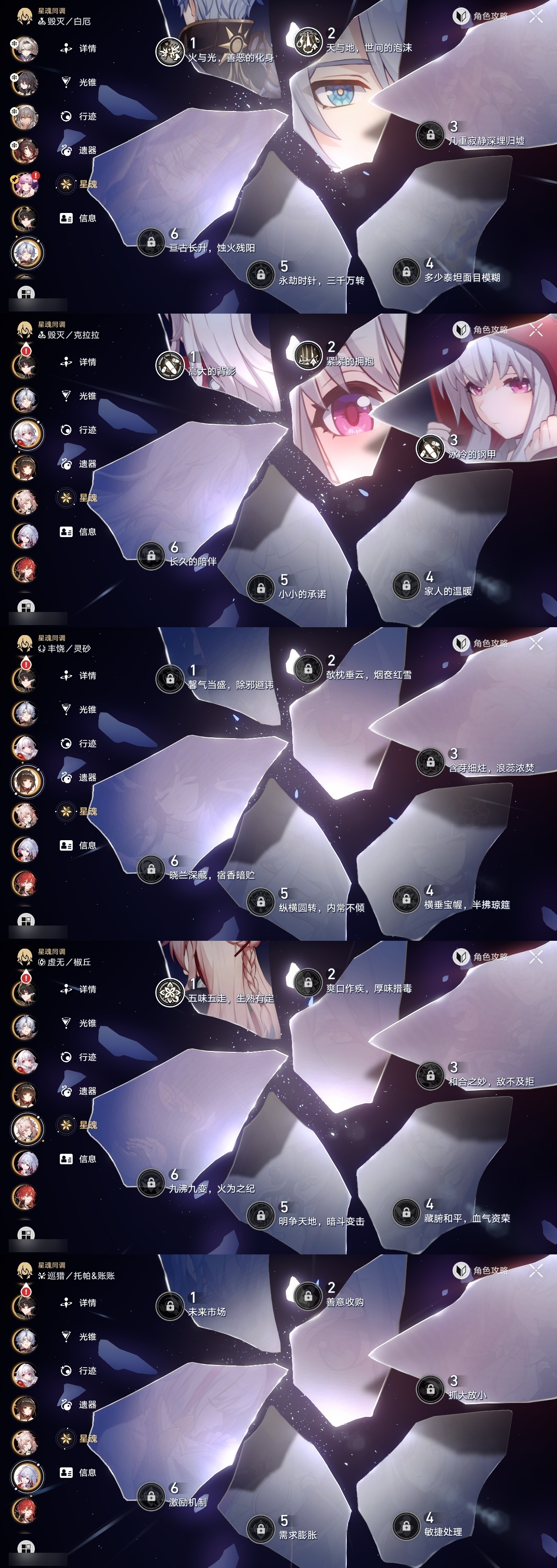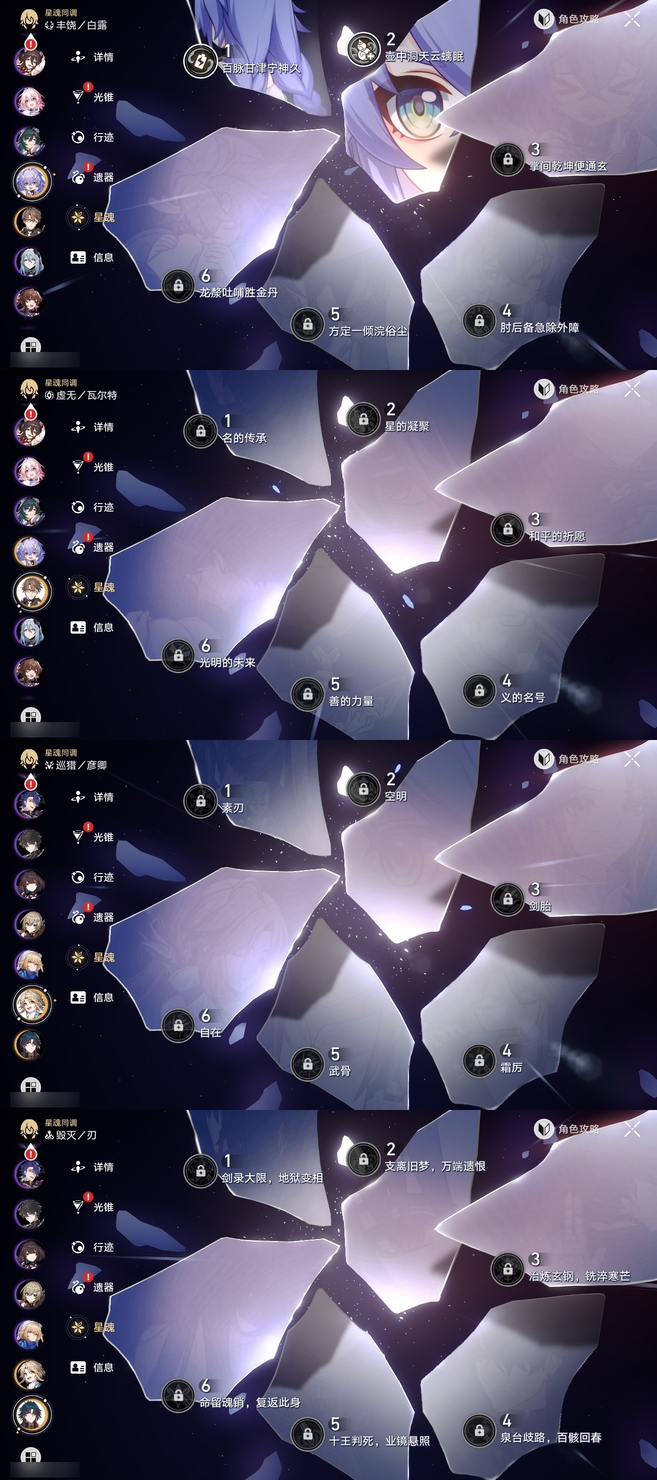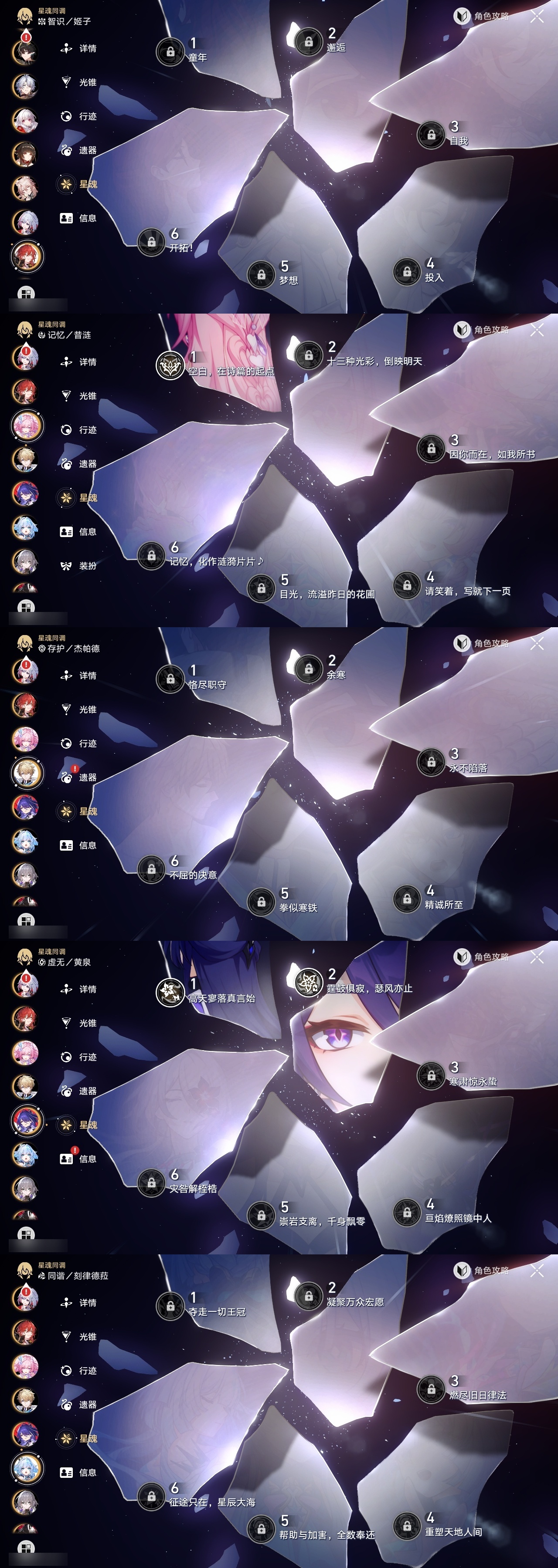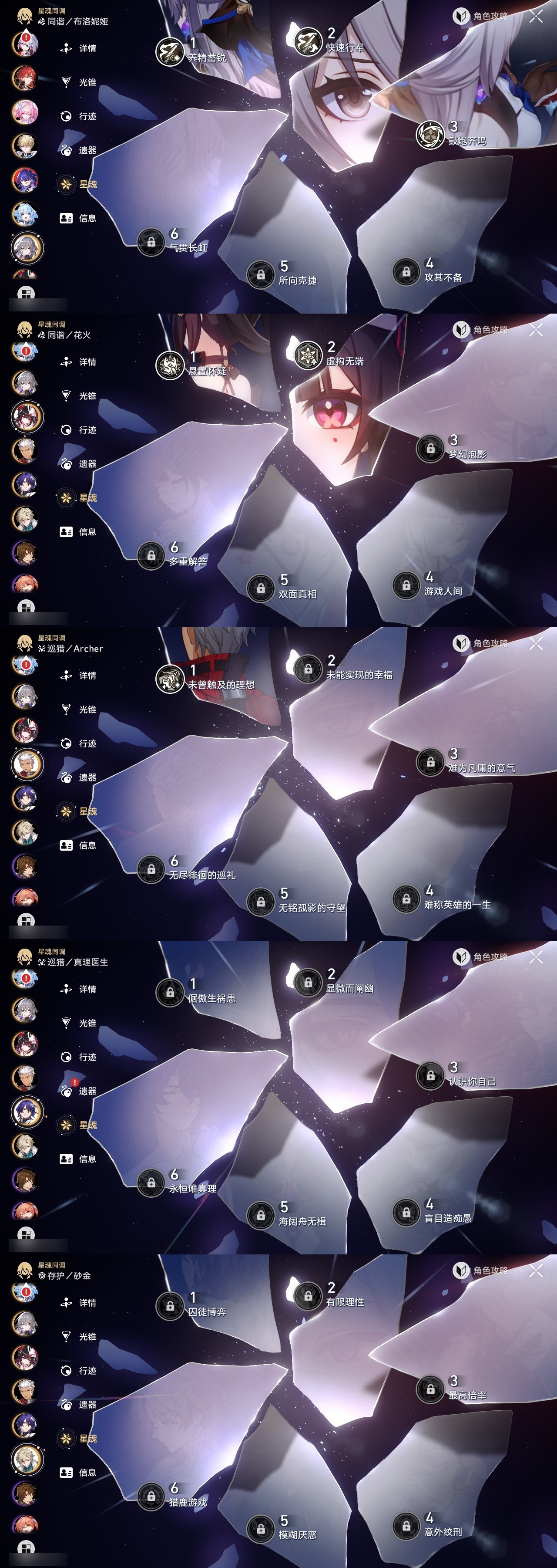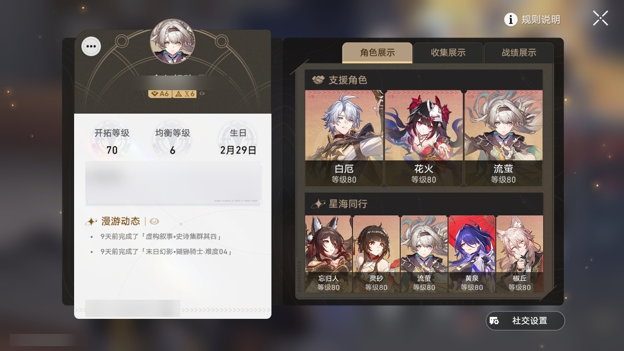 【崩坏·星穹铁道】【lyxq9299】冒险等级:70,女主,五星数量:40,五星角色:布洛妮娅 3命克拉拉 3命流萤 3命白露 2命花火 2命黄泉 2命白厄 2命椒丘 1命忘归人 1命符玄 1命archer 1命昔涟 1命姬子灵砂杰帕德彦卿瓦尔特刃托帕账账真理医生砂金刻律德菈丹恒·腾荒__五星光锥:星海巡航 5精记忆永不落幕 3精记忆的质料记一位星神的陨落制胜的瞬间银河铁道之夜无可取代的东西时节不居但战斗还未结束不息的演算长路终有归途孤独的疗愈重塑时光之忆行于流逝的岸黎明恰如此燃烧理想燃烧的地狱梦应归于何处__四星角色:阿兰 6命娜塔莎 6命虎克 6命貊泽 6命黑塔 6命丹恒 6命停云 6命桑博 6命三月七 6命青雀 6命佩拉 6命驭空 6命玲可 6命桂乃芬 6命雪衣 6命米沙 6命加拉赫 6命素裳 5命艾丝妲 3命希露瓦 3命寒鸦 2命卢卡 1命