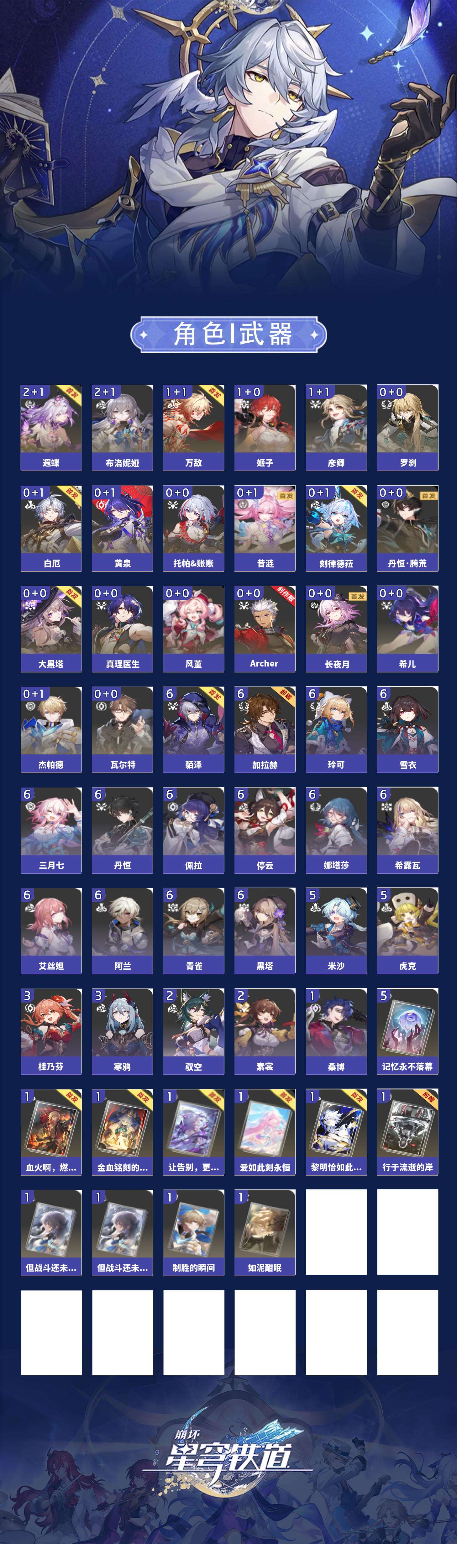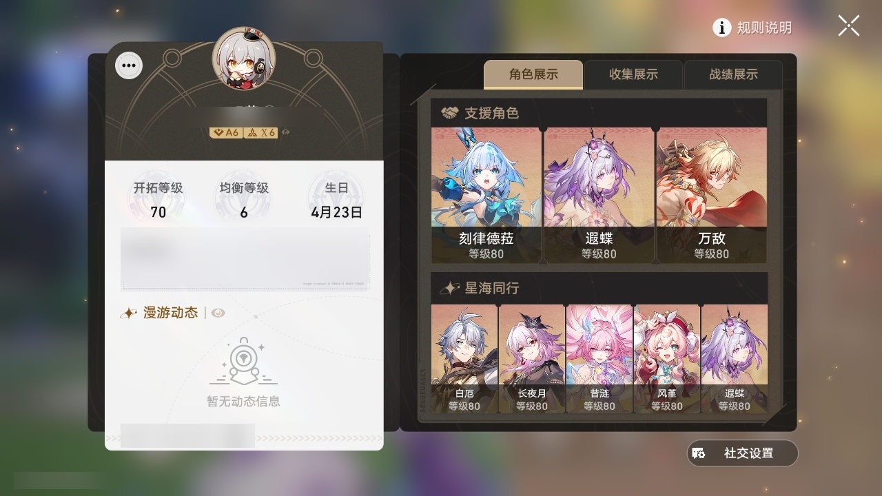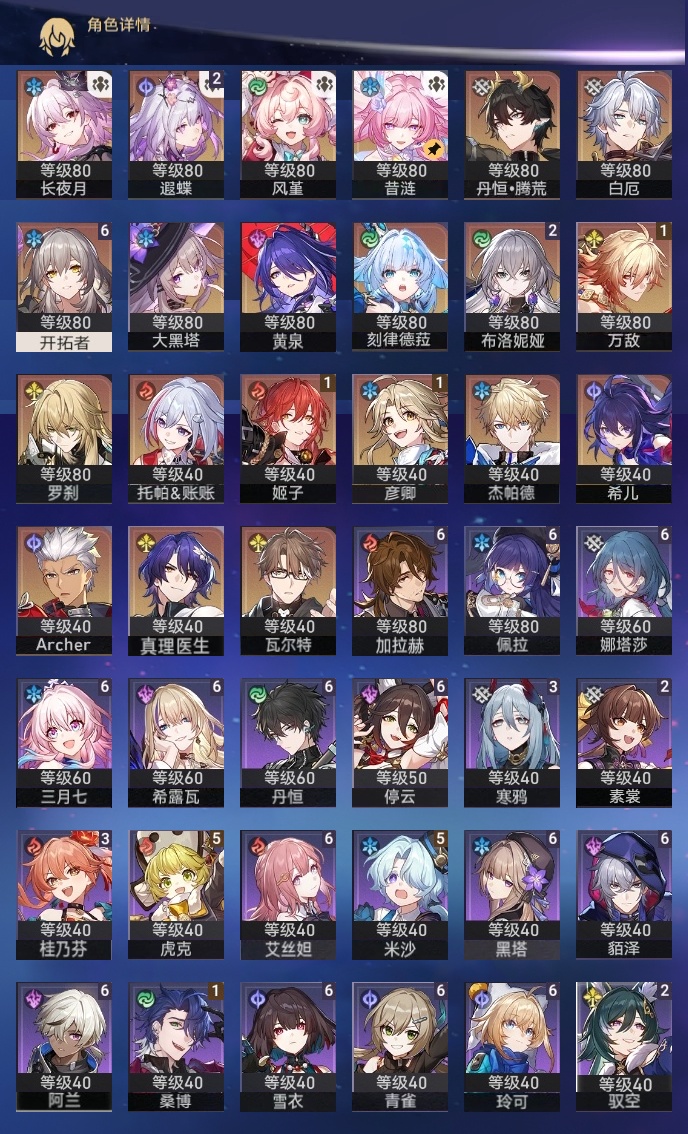 【崩坏·星穹铁道】【lyxq9371】冒险等级:70,女主,五星数量:31,五星角色:布洛妮娅 2命遐蝶 2命姬子 1命彦卿 1命万敌 1命希儿杰帕德瓦尔特大黑塔罗刹托帕账账真理医生黄泉风堇白厄archer刻律德菈长夜月丹恒·腾荒昔涟__五星光锥:记忆永不落幕 5精制胜的瞬间如泥酣眠但战斗还未结束但战斗还未结束血火啊,燃烧前路让告别,更美一些行于流逝的岸黎明恰如此燃烧金血铭刻的时代爱如此刻永恒__四星角色:阿兰 6命娜塔莎 6命貊泽 6命黑塔 6命丹恒 6命艾丝妲 6命希露瓦 6命停云 6命三月七 6命青雀 6命佩拉 6命玲可 6命雪衣 6命加拉赫 6命虎克 5命米沙 5命桂乃芬 3命寒鸦 3命素裳 2命驭空 2命桑博 1命21遐碟01昔涟0命风堇0命长夜月 记忆队 01白厄队
