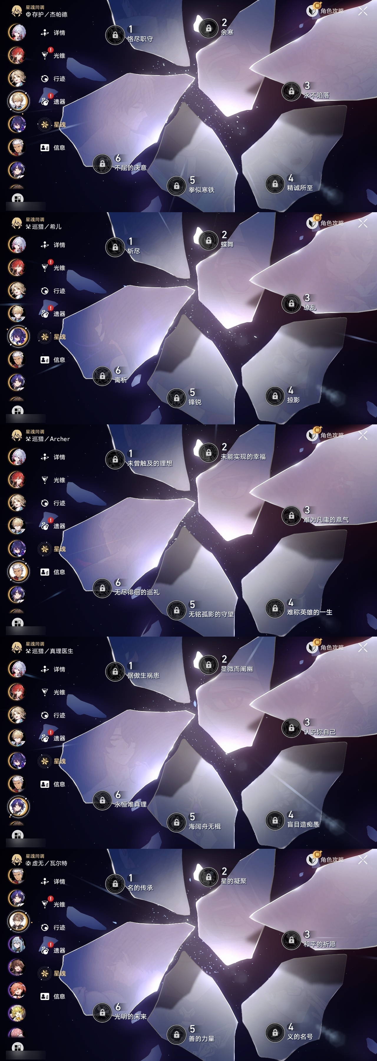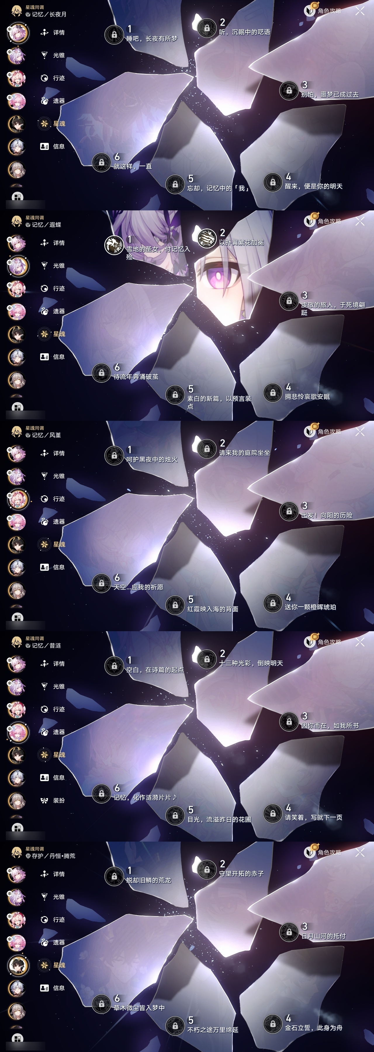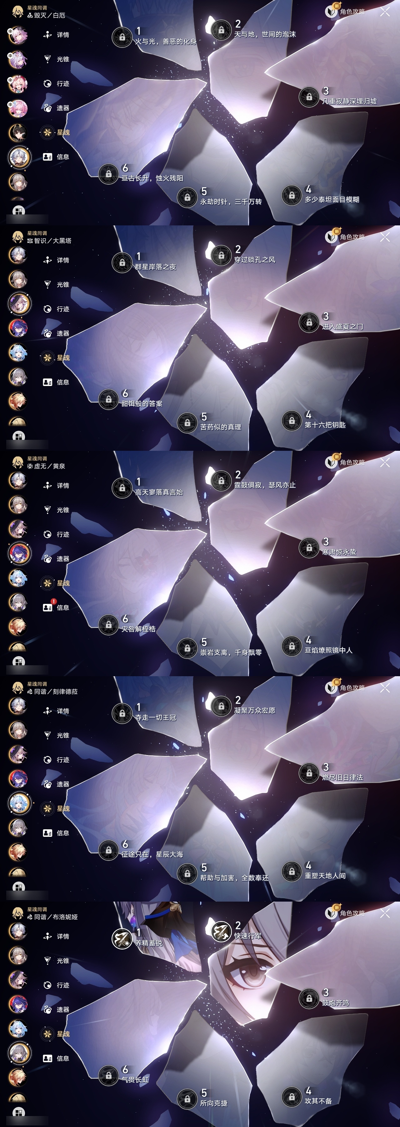 【崩坏·星穹铁道】【lyxq9371】冒险等级:70,女主,五星数量:31,五星角色:布洛妮娅 2命遐蝶 2命姬子 1命彦卿 1命万敌 1命希儿杰帕德瓦尔特大黑塔罗刹托帕账账真理医生黄泉风堇白厄archer刻律德菈长夜月丹恒·腾荒昔涟__五星光锥:记忆永不落幕 5精制胜的瞬间如泥酣眠但战斗还未结束但战斗还未结束血火啊,燃烧前路让告别,更美一些行于流逝的岸黎明恰如此燃烧金血铭刻的时代爱如此刻永恒__四星角色:阿兰 6命娜塔莎 6命貊泽 6命黑塔 6命丹恒 6命艾丝妲 6命希露瓦 6命停云 6命三月七 6命青雀 6命佩拉 6命玲可 6命雪衣 6命加拉赫 6命虎克 5命米沙 5命桂乃芬 3命寒鸦 3命素裳 2命驭空 2命桑博 1命21遐碟01昔涟0命风堇0命长夜月 记忆队 01白厄队