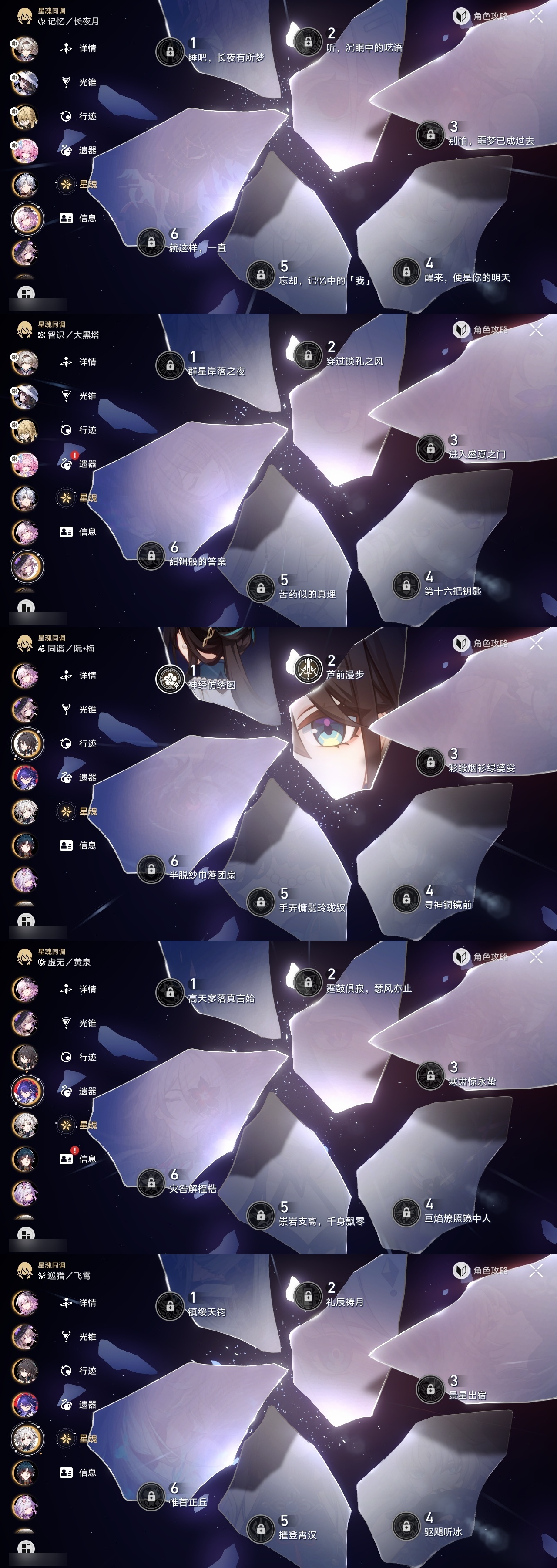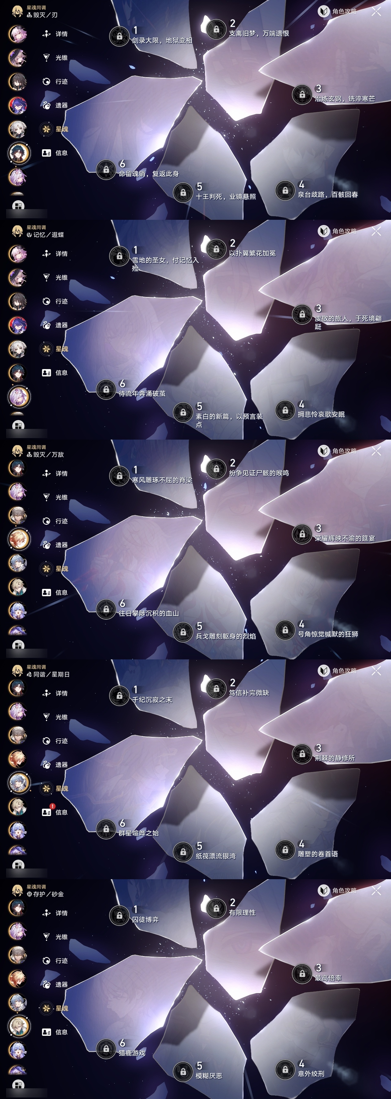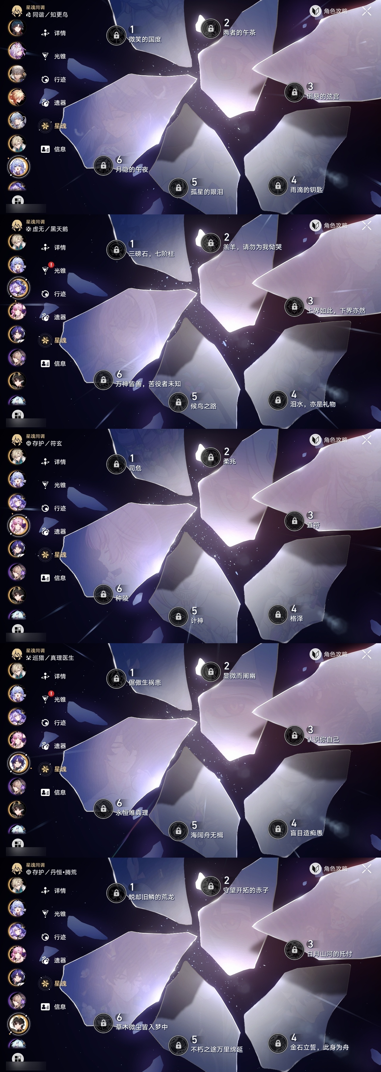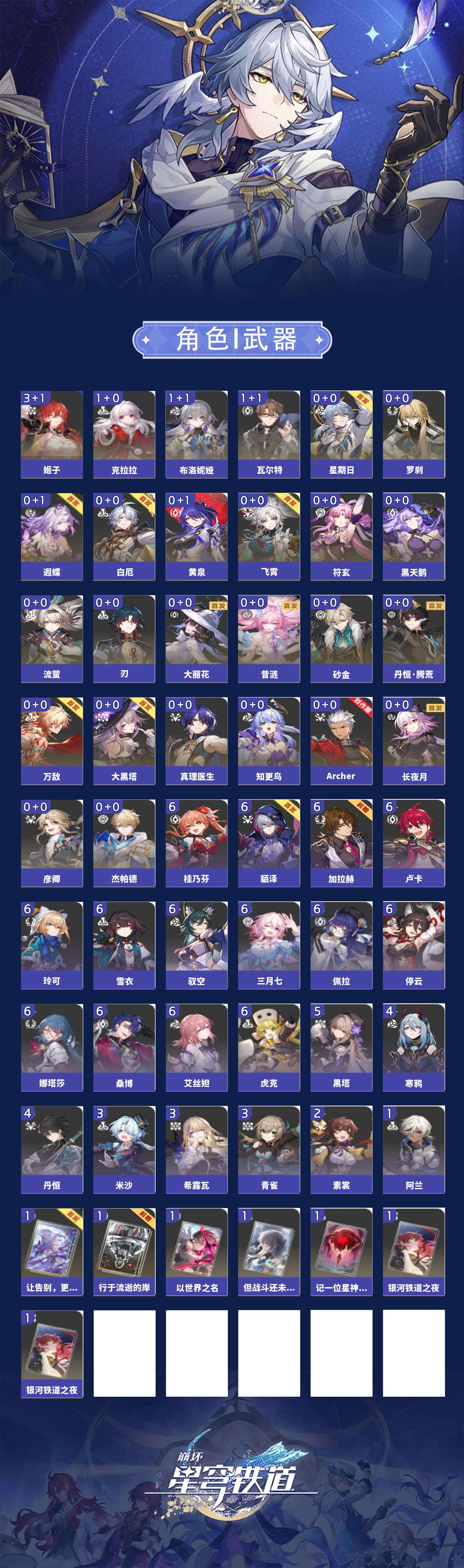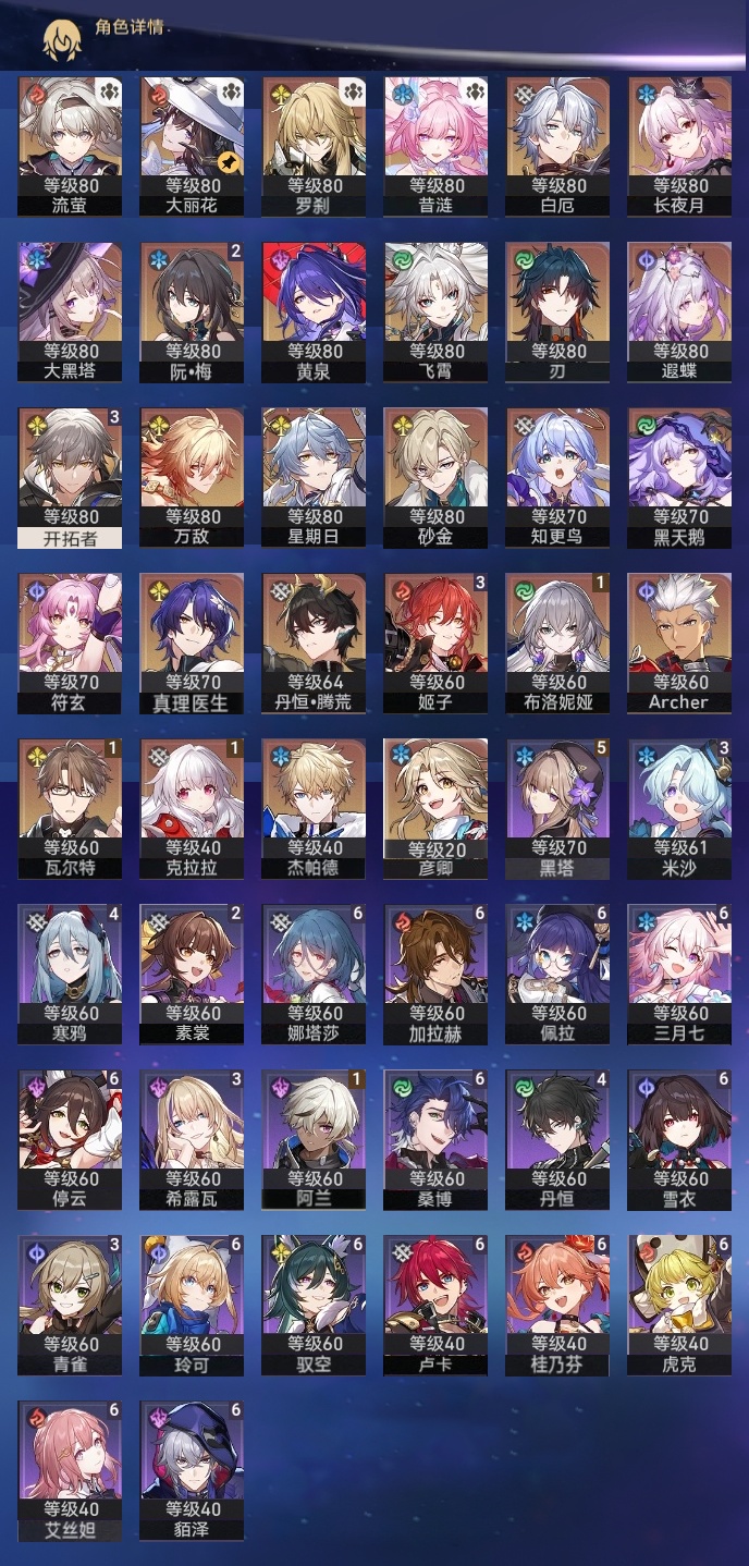 【崩坏·星穹铁道】【lyxq9315】冒险等级:70,男主,五星数量:33,五星角色:姬子 3命布洛妮娅 1命瓦尔特 1命克拉拉 1命飞霄杰帕德彦卿星期日大黑塔罗刹万敌刃遐蝶符玄真理医生黑天鹅黄泉砂金知更鸟白厄archer长夜月丹恒·腾荒昔涟大丽花流萤__五星光锥:记一位星神的陨落银河铁道之夜银河铁道之夜以世界之名但战斗还未结束让告别,更美一些行于流逝的岸__四星角色:娜塔莎 6命虎克 6命貊泽 6命艾丝妲 6命停云 6命桑博 6命三月七 6命佩拉 6命驭空 6命卢卡 6命玲可 6命桂乃芬 6命雪衣 6命加拉赫 6命黑塔 5命丹恒 4命寒鸦 4命希露瓦 3命青雀 3命米沙 3命素裳 2命阿兰 1命01遐碟带0命昔涟0命长夜月