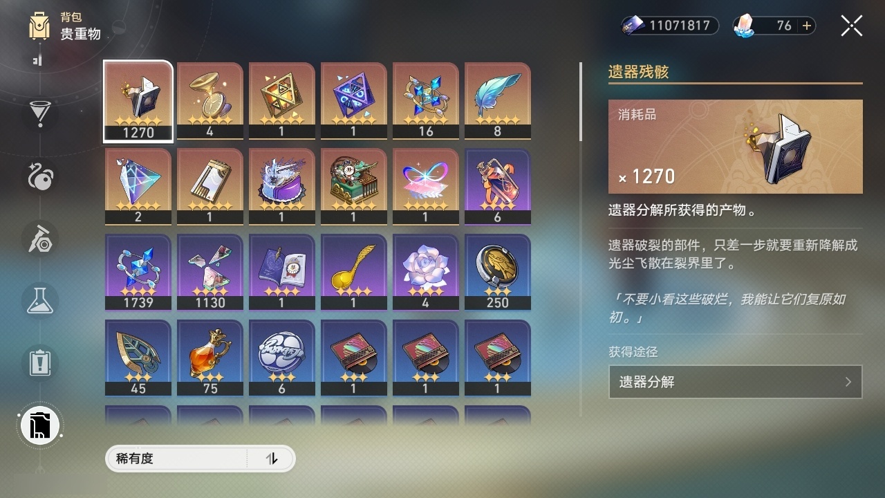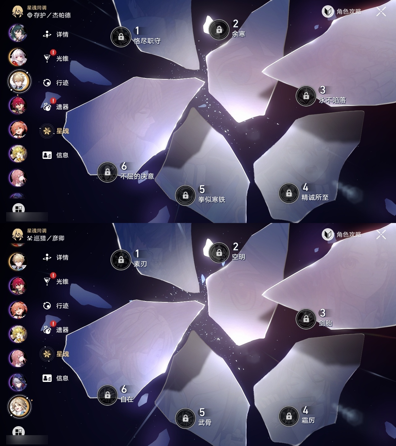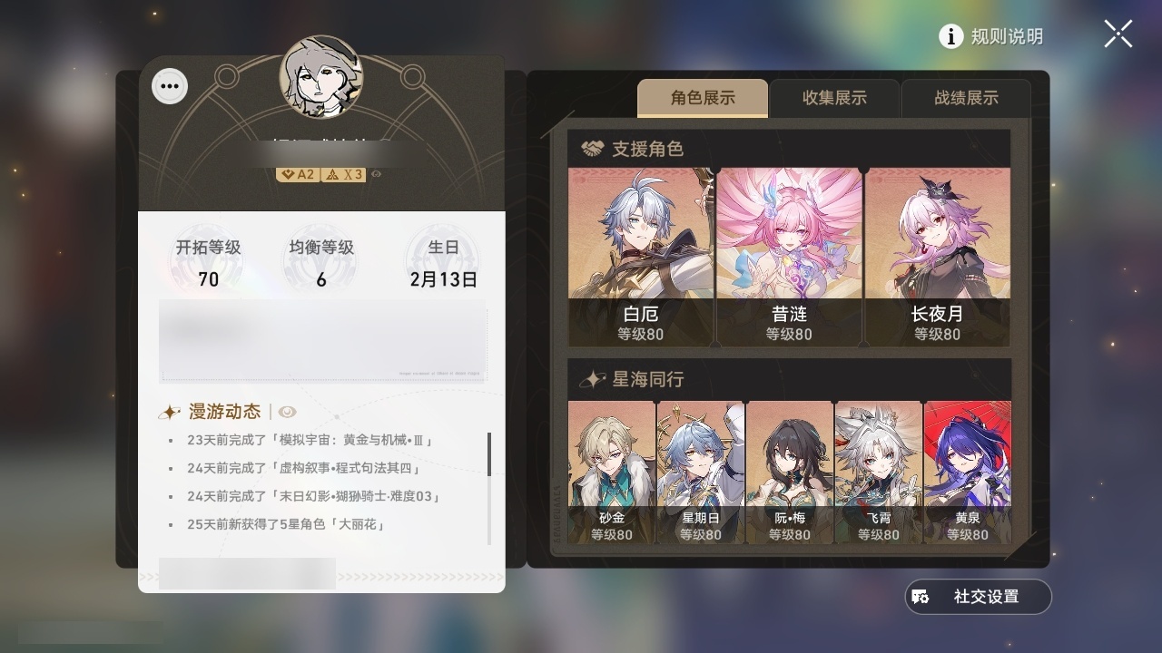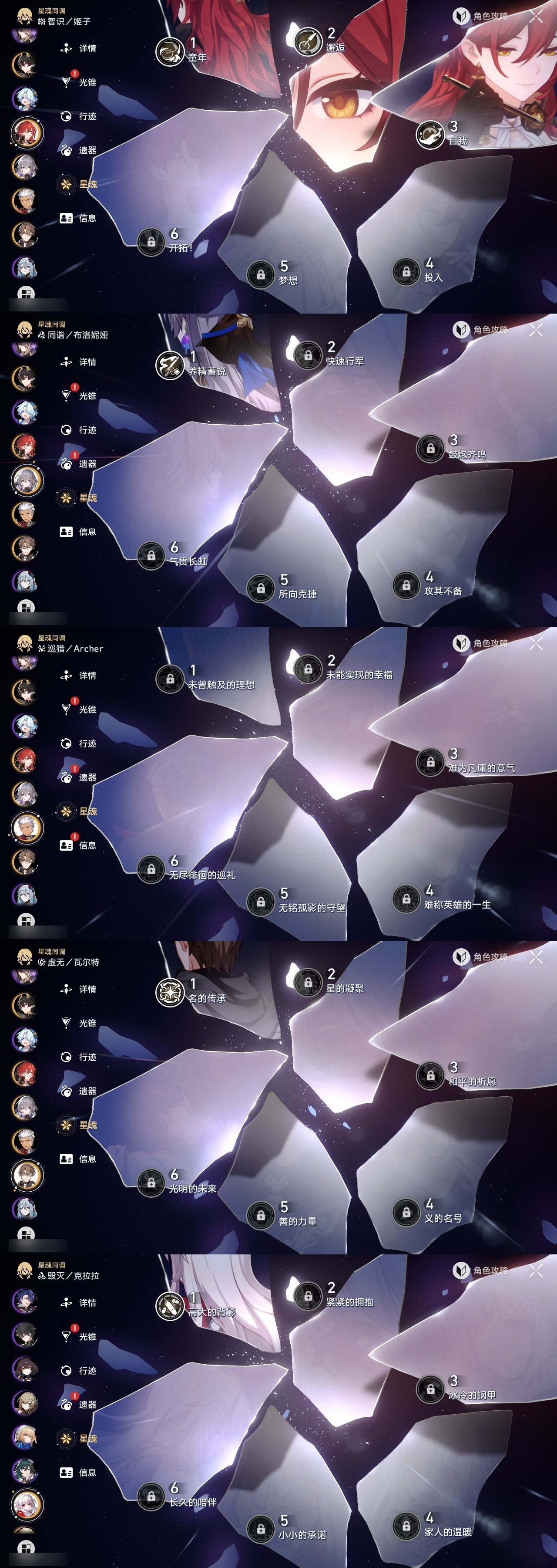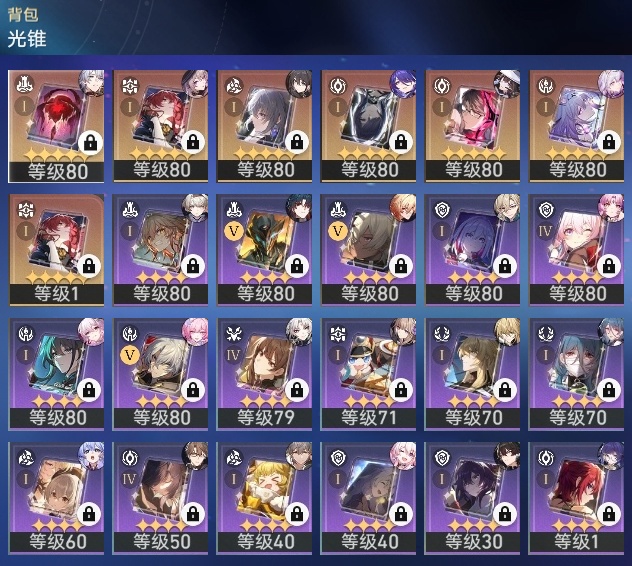 【崩坏·星穹铁道】【lyxq9315】冒险等级:70,男主,五星数量:33,五星角色:姬子 3命布洛妮娅 1命瓦尔特 1命克拉拉 1命飞霄杰帕德彦卿星期日大黑塔罗刹万敌刃遐蝶符玄真理医生黑天鹅黄泉砂金知更鸟白厄archer长夜月丹恒·腾荒昔涟大丽花流萤__五星光锥:记一位星神的陨落银河铁道之夜银河铁道之夜以世界之名但战斗还未结束让告别,更美一些行于流逝的岸__四星角色:娜塔莎 6命虎克 6命貊泽 6命艾丝妲 6命停云 6命桑博 6命三月七 6命佩拉 6命驭空 6命卢卡 6命玲可 6命桂乃芬 6命雪衣 6命加拉赫 6命黑塔 5命丹恒 4命寒鸦 4命希露瓦 3命青雀 3命米沙 3命素裳 2命阿兰 1命01遐碟带0命昔涟0命长夜月