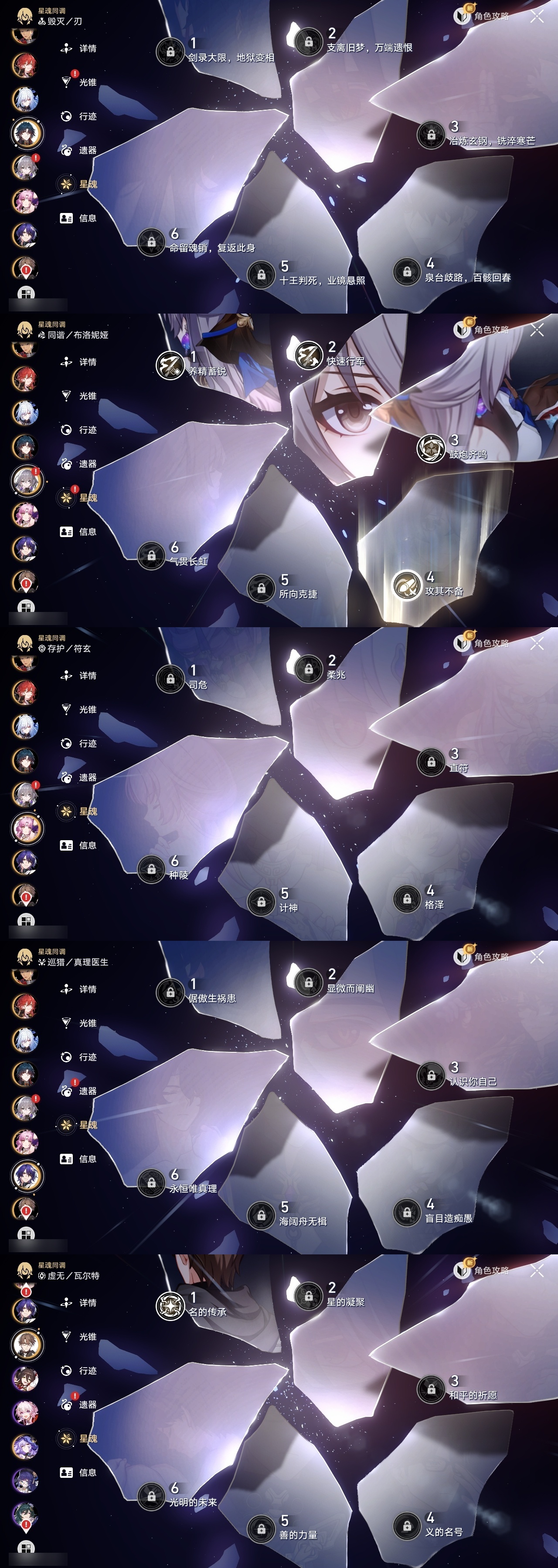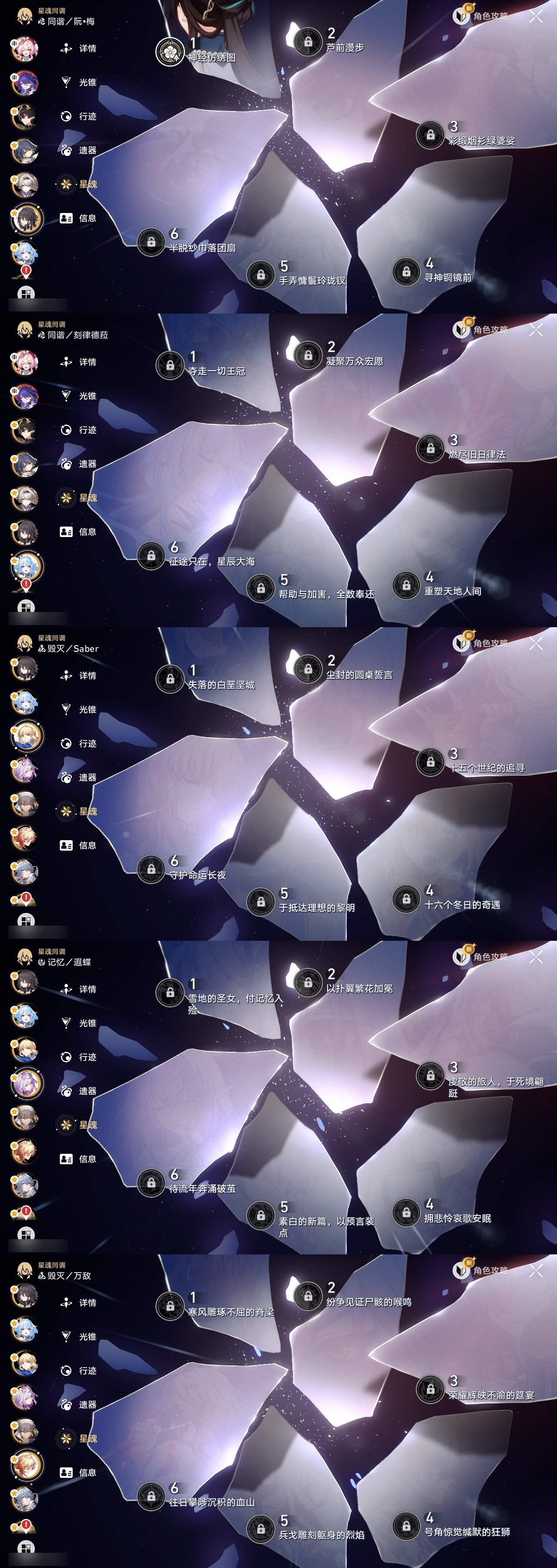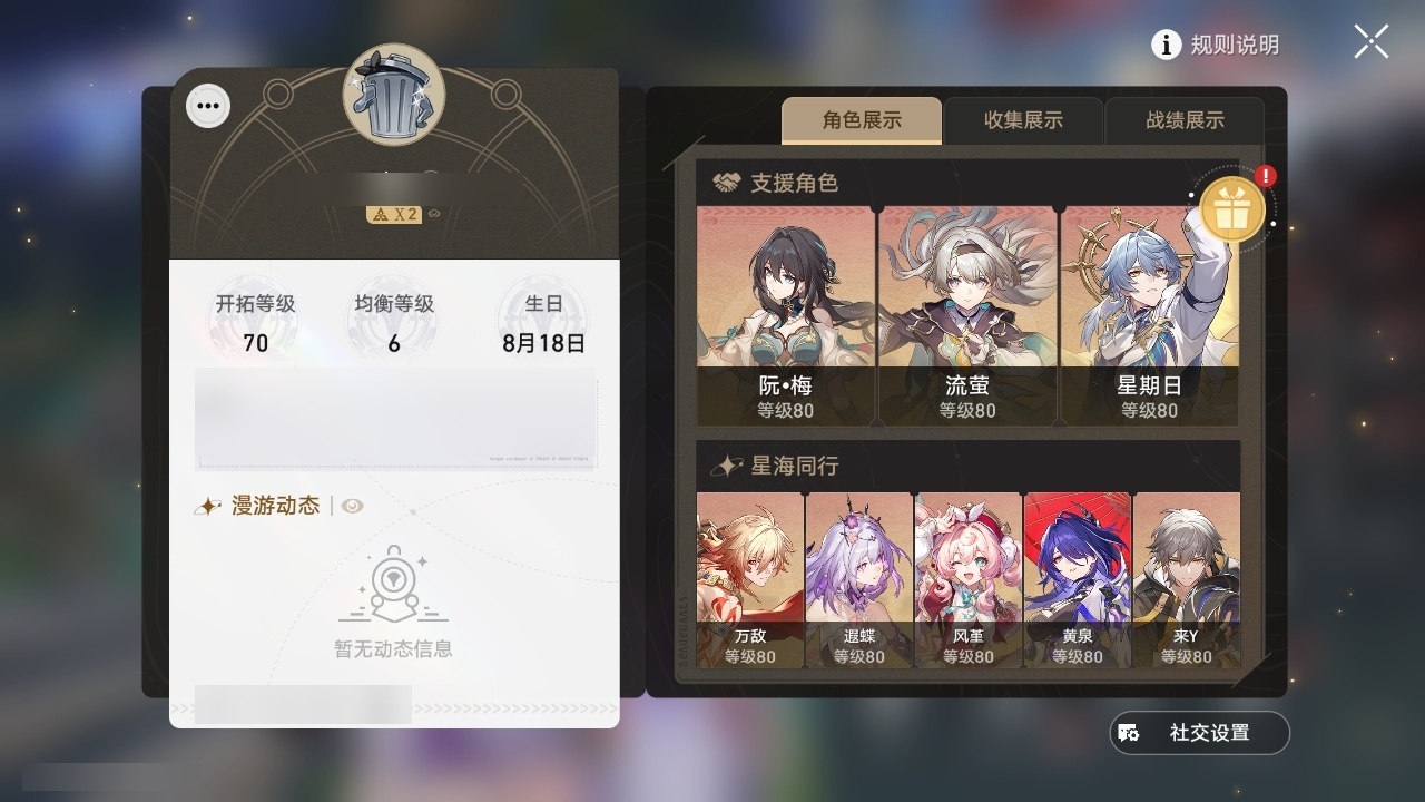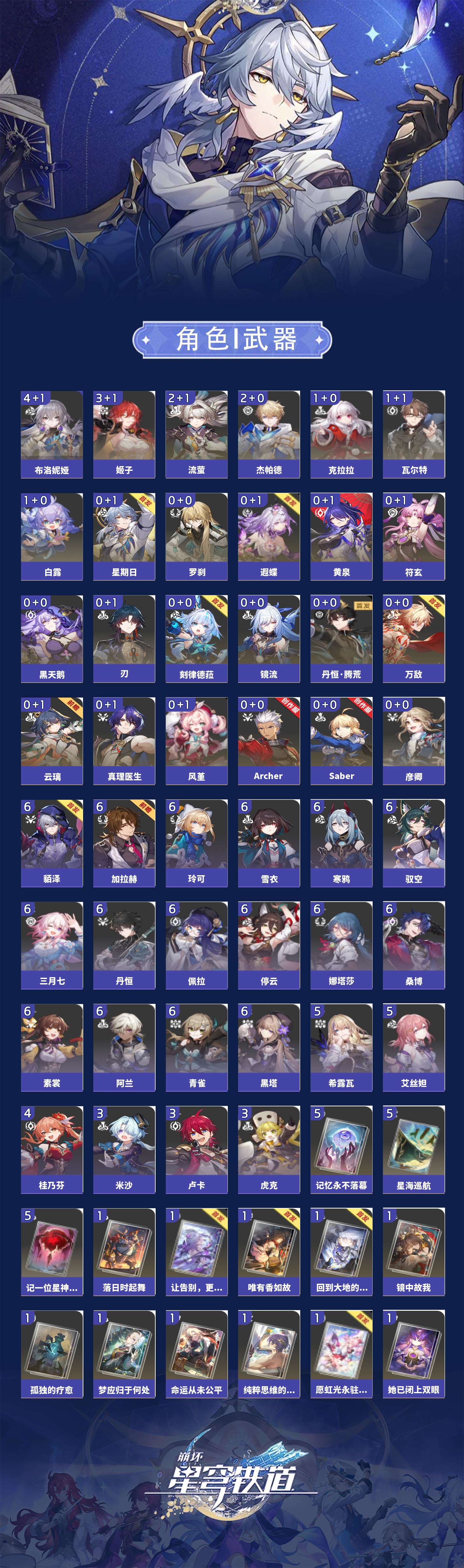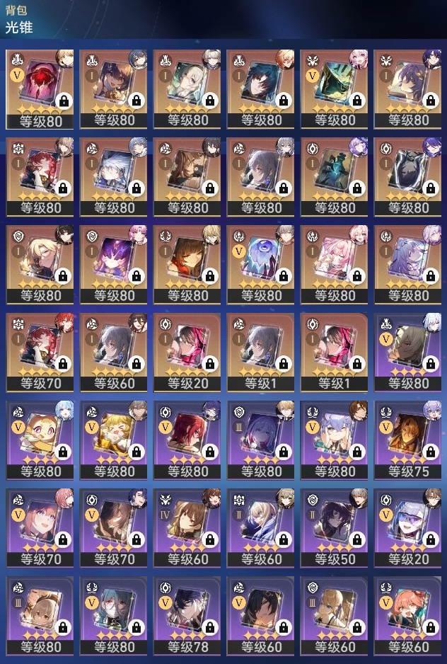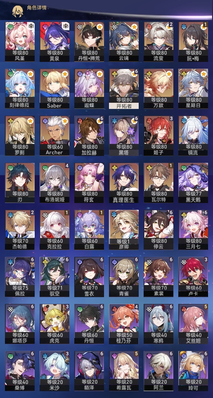 【崩坏·星穹铁道】【lyxq9424】冒险等级:70,男主,五星数量:47,五星角色:布洛妮娅 4命姬子 3命杰帕德 2命流萤 2命白露 1命瓦尔特 1命克拉拉 1命云璃彦卿星期日罗刹万敌刃遐蝶符玄镜流真理医生黑天鹅黄泉风堇saberarcher刻律德菈丹恒·腾荒__五星光锥:星海巡航 5精记一位星神的陨落 5精记忆永不落幕 5精落日时起舞银河铁道之夜银河铁道之夜以世界之名以世界之名但战斗还未结束但战斗还未结束但战斗还未结束唯有香如故回到大地的飞行到不了的彼岸孤独的疗愈她已闭上双眼让告别,更美一些镜中故我纯粹思维的洗礼行于流逝的岸愿虹光永驻天空命运从未公平梦应归于何处__四星角色:阿兰 6命娜塔莎 6命貊泽 6命黑塔 6命丹恒 6命停云 6命素裳 6命桑博 6命三月七 6命青雀 6命佩拉 6命驭空 6命玲可 6命寒鸦 6命雪衣 6命加拉赫 6命艾丝妲 5命希露瓦 5命桂乃芬 4命虎克 3命卢卡 3命米沙 3命2命流萤击破队 记忆队 召唤队