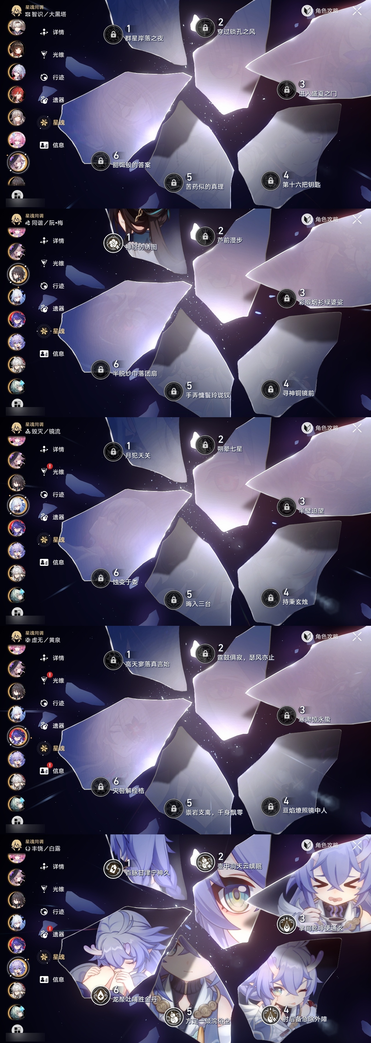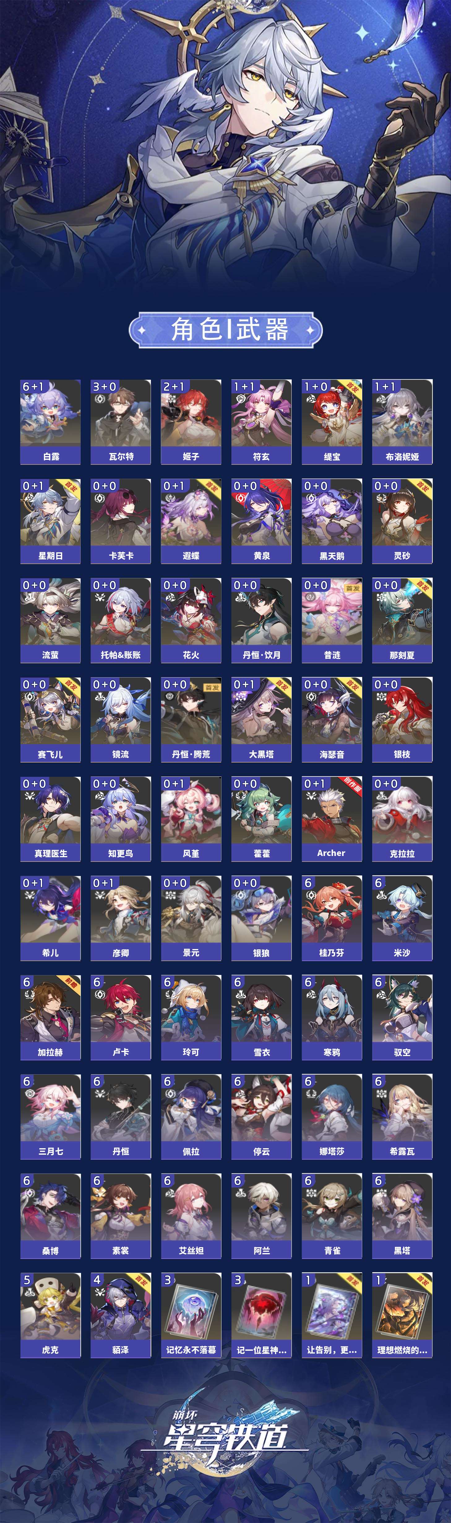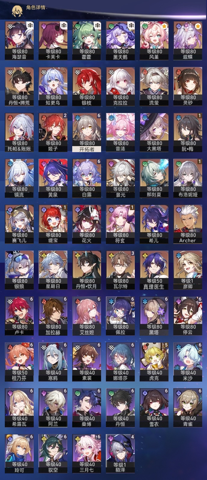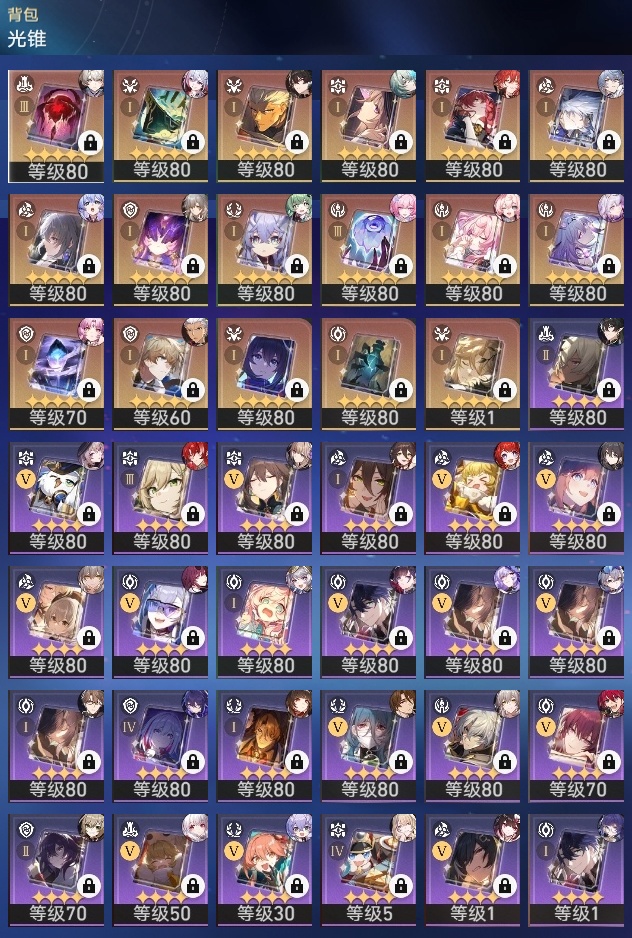 【崩坏·星穹铁道】【lyxq9180】冒险等级:70,女主,五星数量:51,五星角色:白露 6命瓦尔特 3命姬子 2命布洛妮娅 1命缇宝 1命符玄 1命银狼景元希儿灵砂彦卿克拉拉星期日大黑塔卡芙卡丹恒·饮月遐蝶镜流托帕账账藿藿银枝真理医生黑天鹅花火那刻夏黄泉风堇知更鸟赛飞儿archer海瑟音丹恒·腾荒昔涟流萤__五星光锥:记一位星神的陨落 3精记忆永不落幕 3精星海巡航记忆的质料制胜的瞬间银河铁道之夜时节不居如泥酣眠但战斗还未结束于夜色中回到大地的飞行向着不可追问处孤独的疗愈她已闭上双眼让告别,更美一些愿虹光永驻天空理想燃烧的地狱__四星角色:阿兰 6命娜塔莎 6命黑塔 6命丹恒 6命艾丝妲 6命希露瓦 6命停云 6命素裳 6命桑博 6命三月七 6命青雀 6命佩拉 6命驭空 6命卢卡 6命玲可 6命桂乃芬 6命寒鸦 6命雪衣 6命米沙 6命加拉赫 6命虎克 5命貊泽 4命