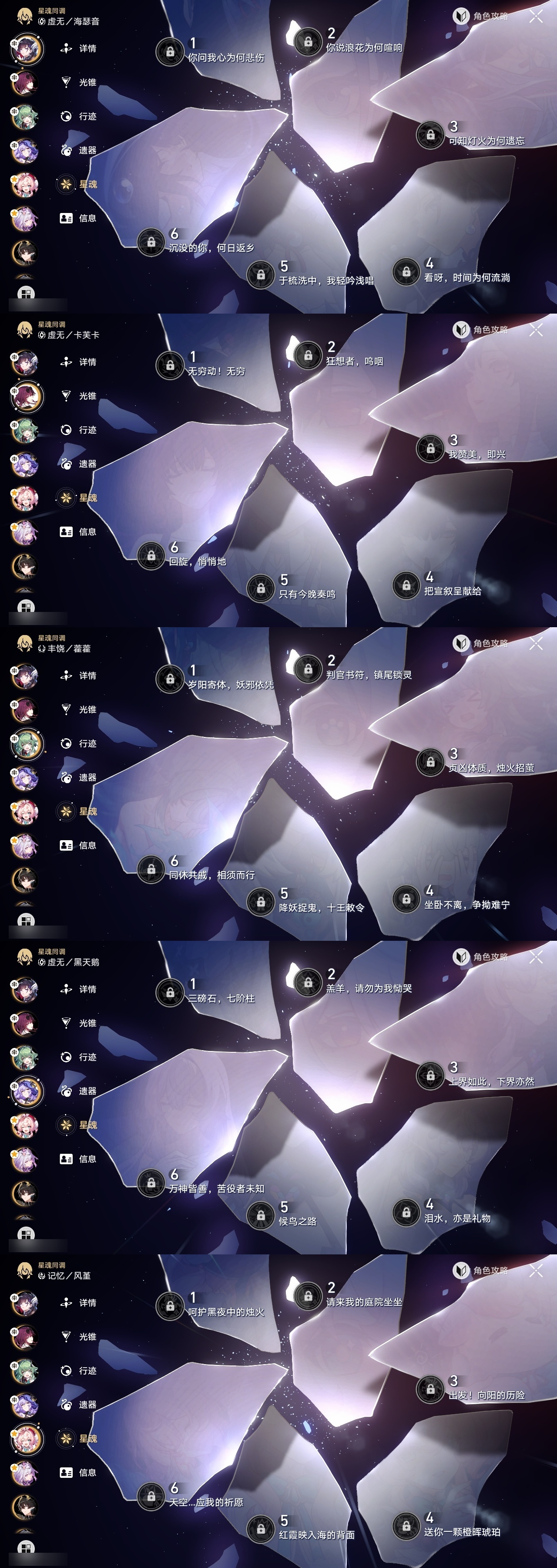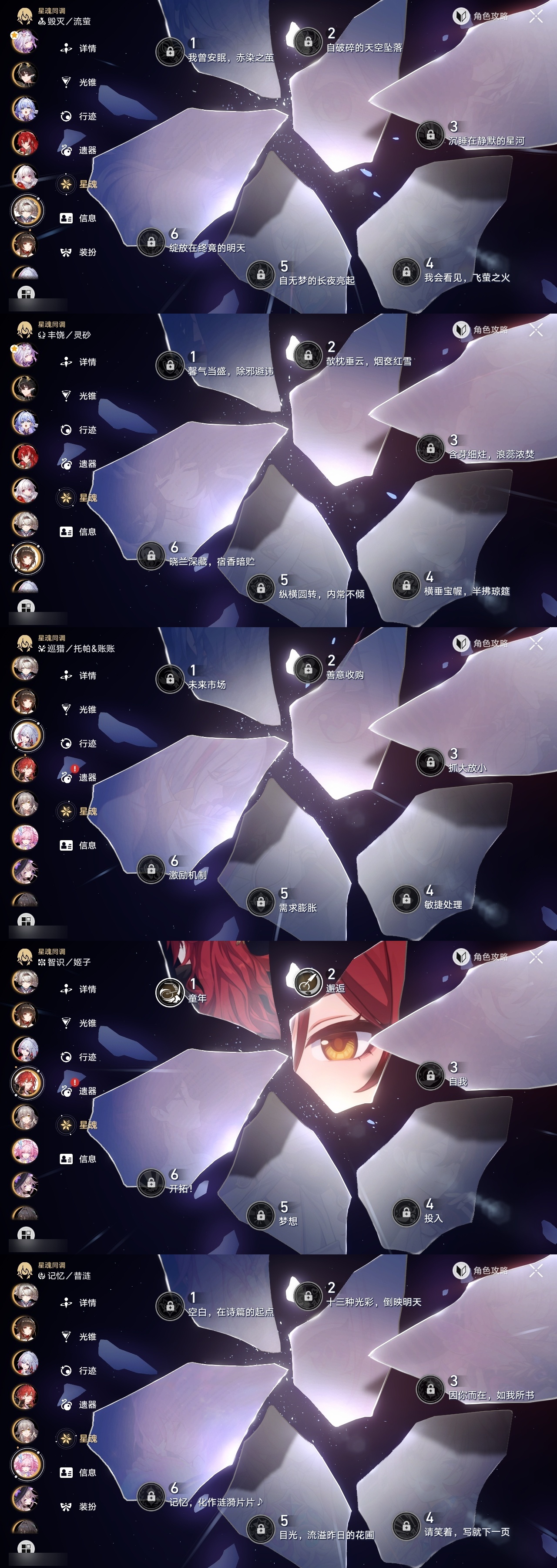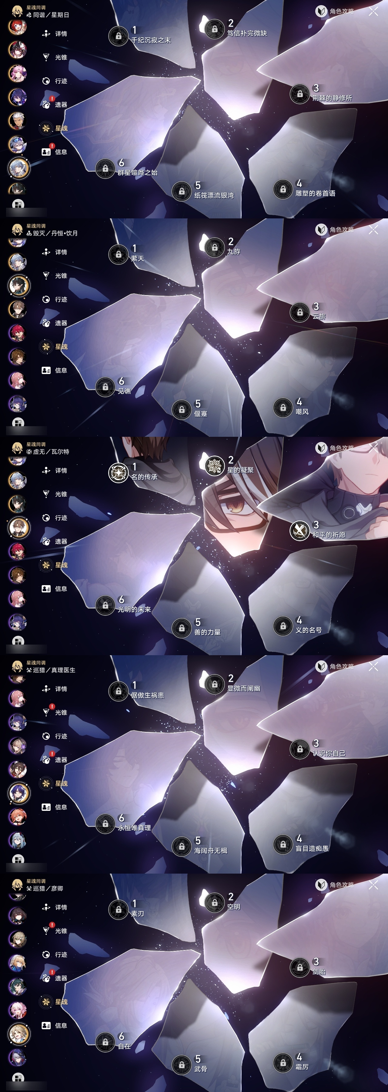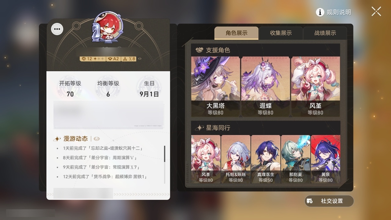 【崩坏·星穹铁道】【lyxq9180】冒险等级:70,女主,五星数量:51,五星角色:白露 6命瓦尔特 3命姬子 2命布洛妮娅 1命缇宝 1命符玄 1命银狼景元希儿灵砂彦卿克拉拉星期日大黑塔卡芙卡丹恒·饮月遐蝶镜流托帕账账藿藿银枝真理医生黑天鹅花火那刻夏黄泉风堇知更鸟赛飞儿archer海瑟音丹恒·腾荒昔涟流萤__五星光锥:记一位星神的陨落 3精记忆永不落幕 3精星海巡航记忆的质料制胜的瞬间银河铁道之夜时节不居如泥酣眠但战斗还未结束于夜色中回到大地的飞行向着不可追问处孤独的疗愈她已闭上双眼让告别,更美一些愿虹光永驻天空理想燃烧的地狱__四星角色:阿兰 6命娜塔莎 6命黑塔 6命丹恒 6命艾丝妲 6命希露瓦 6命停云 6命素裳 6命桑博 6命三月七 6命青雀 6命佩拉 6命驭空 6命卢卡 6命玲可 6命桂乃芬 6命寒鸦 6命雪衣 6命米沙 6命加拉赫 6命虎克 5命貊泽 4命