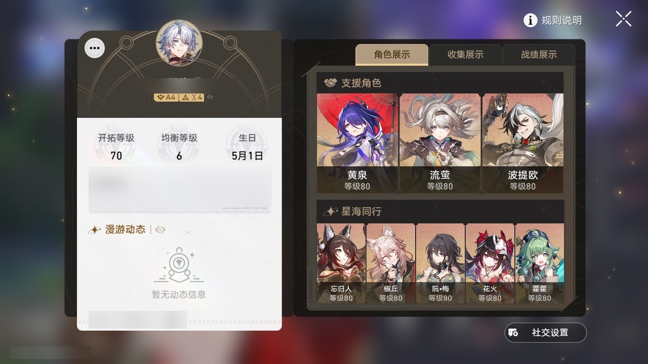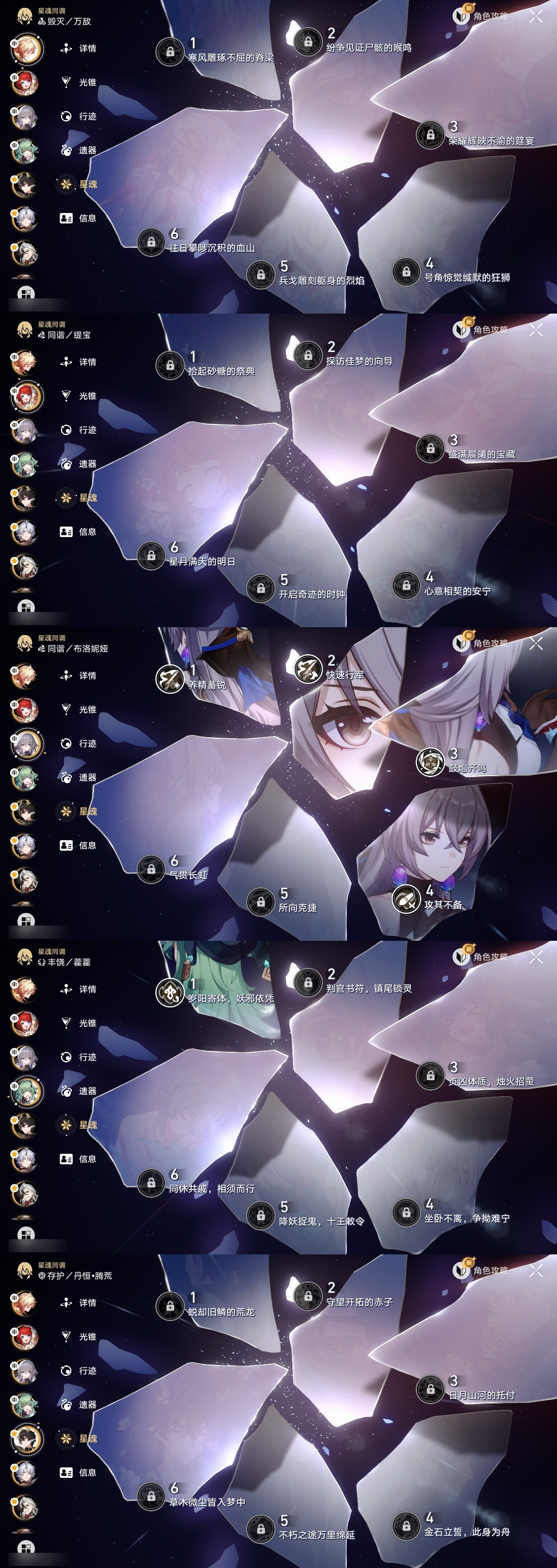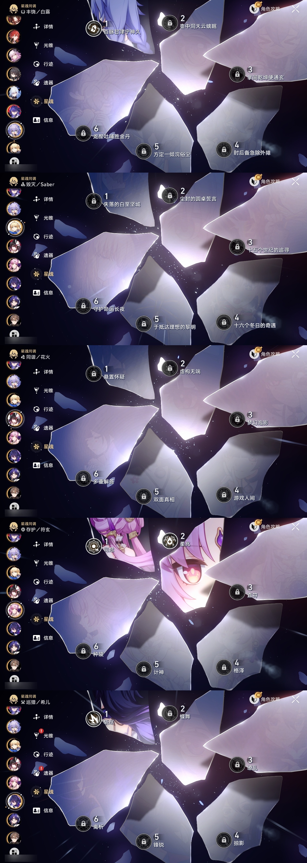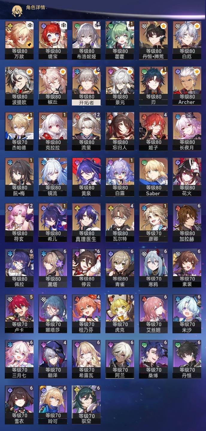 【崩坏·星穹铁道】【lyxq9313】冒险等级:70,男主,五星数量:42,五星角色:布洛妮娅 4命姬子 4命瓦尔特 4命符玄 2命流萤 2命希儿 1命白露 1命杰帕德 1命彦卿 1命克拉拉 1命刃 1命藿藿 1命椒丘景元忘归人缇宝万敌镜流真理医生花火黄泉白厄saberarcher长夜月丹恒·腾荒波提欧__五星光锥:星海巡航 5精孤独的疗愈 4精制胜的瞬间银河铁道之夜无可取代的东西但战斗还未结束到不了的彼岸她已闭上双眼此身为剑游戏尘寰行于流逝的岸理想燃烧的地狱没有回报的加冕驶向第二次生命梦应归于何处__四星角色:阿兰 6命娜塔莎 6命虎克 6命黑塔 6命丹恒 6命艾丝妲 6命希露瓦 6命停云 6命素裳 6命桑博 6命三月七 6命青雀 6命佩拉 6命驭空 6命玲可 6命寒鸦 6命雪衣 6命米沙 6命加拉赫 6命卢卡 5命貊泽 4命桂乃芬 4命