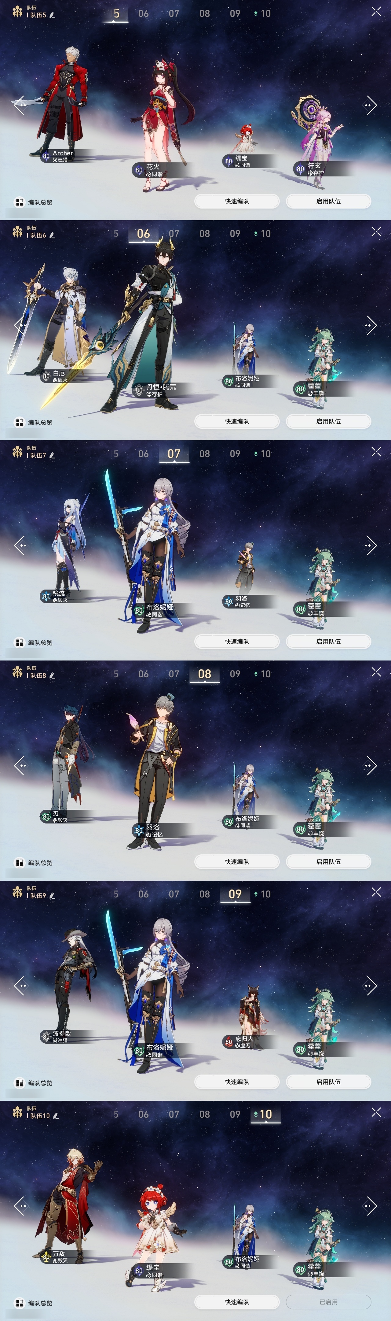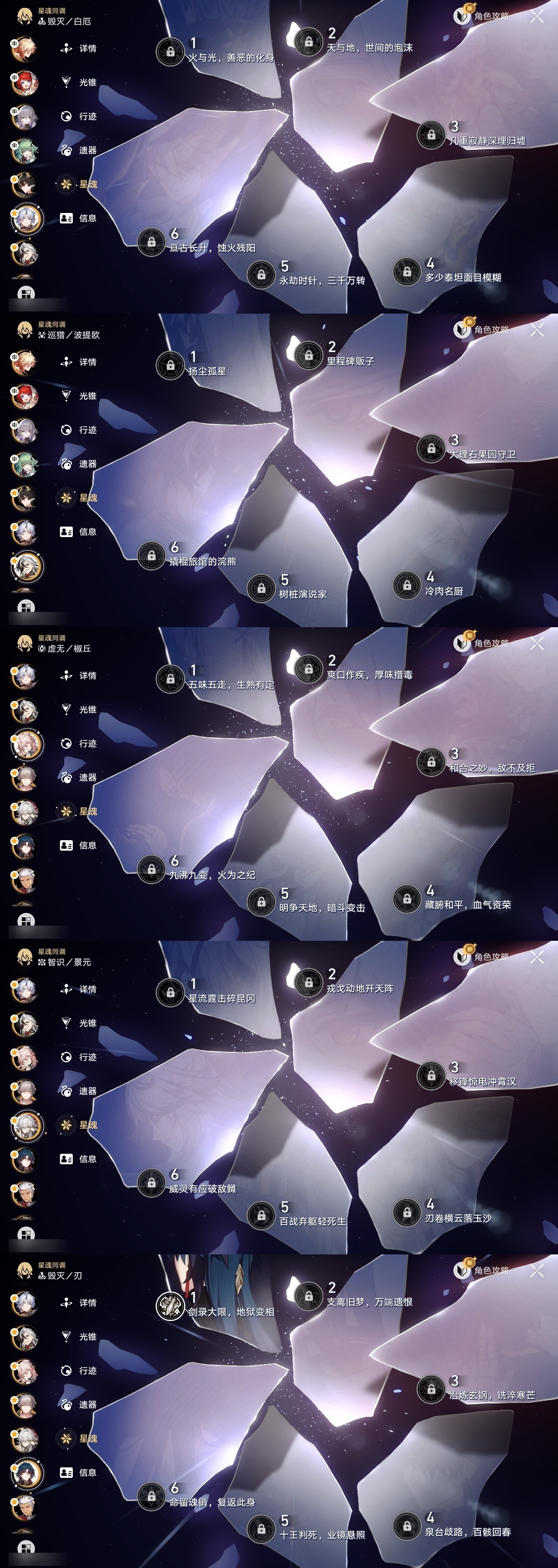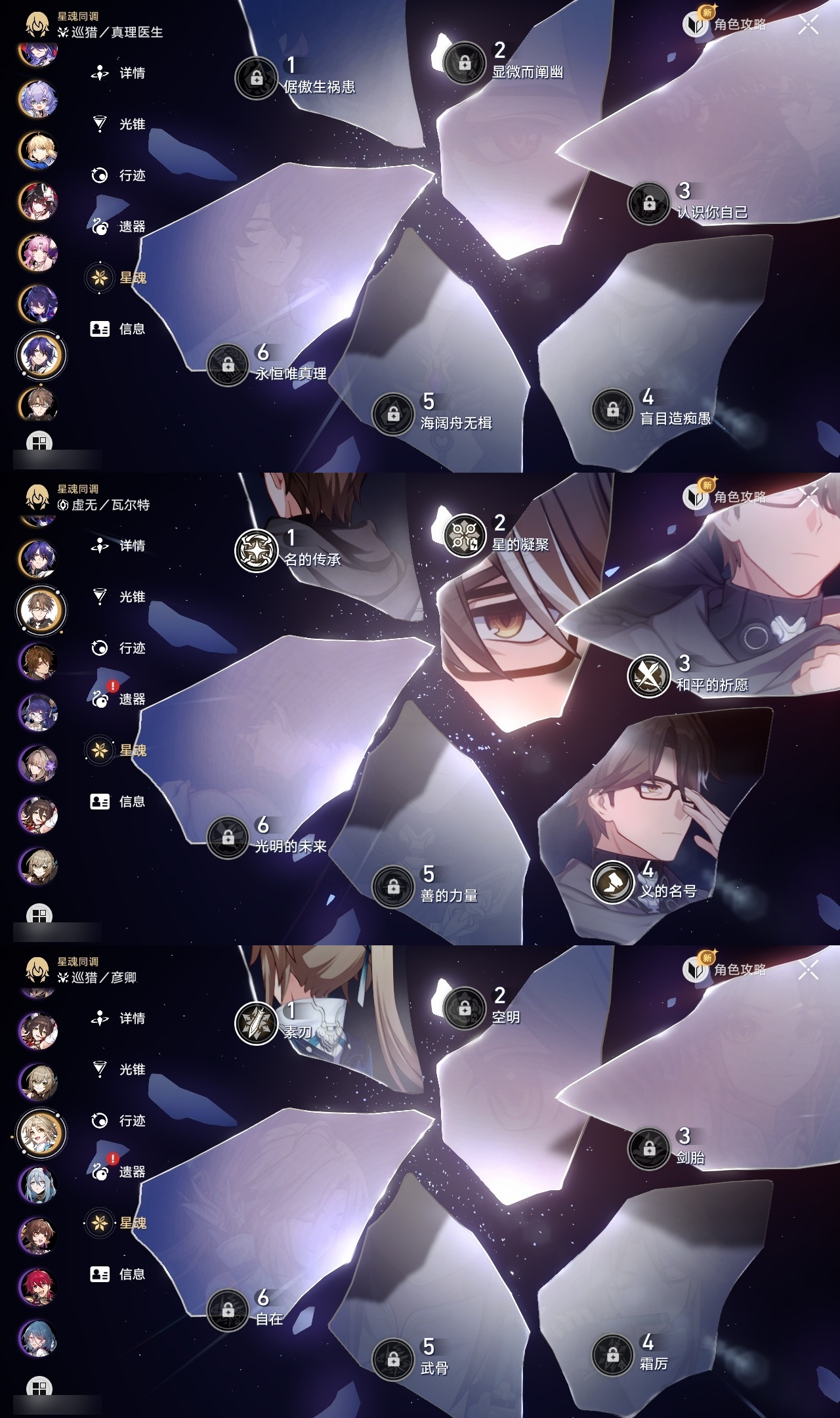 【崩坏·星穹铁道】【lyxq9313】冒险等级:70,男主,五星数量:42,五星角色:布洛妮娅 4命姬子 4命瓦尔特 4命符玄 2命流萤 2命希儿 1命白露 1命杰帕德 1命彦卿 1命克拉拉 1命刃 1命藿藿 1命椒丘景元忘归人缇宝万敌镜流真理医生花火黄泉白厄saberarcher长夜月丹恒·腾荒波提欧__五星光锥:星海巡航 5精孤独的疗愈 4精制胜的瞬间银河铁道之夜无可取代的东西但战斗还未结束到不了的彼岸她已闭上双眼此身为剑游戏尘寰行于流逝的岸理想燃烧的地狱没有回报的加冕驶向第二次生命梦应归于何处__四星角色:阿兰 6命娜塔莎 6命虎克 6命黑塔 6命丹恒 6命艾丝妲 6命希露瓦 6命停云 6命素裳 6命桑博 6命三月七 6命青雀 6命佩拉 6命驭空 6命玲可 6命寒鸦 6命雪衣 6命米沙 6命加拉赫 6命卢卡 5命貊泽 4命桂乃芬 4命