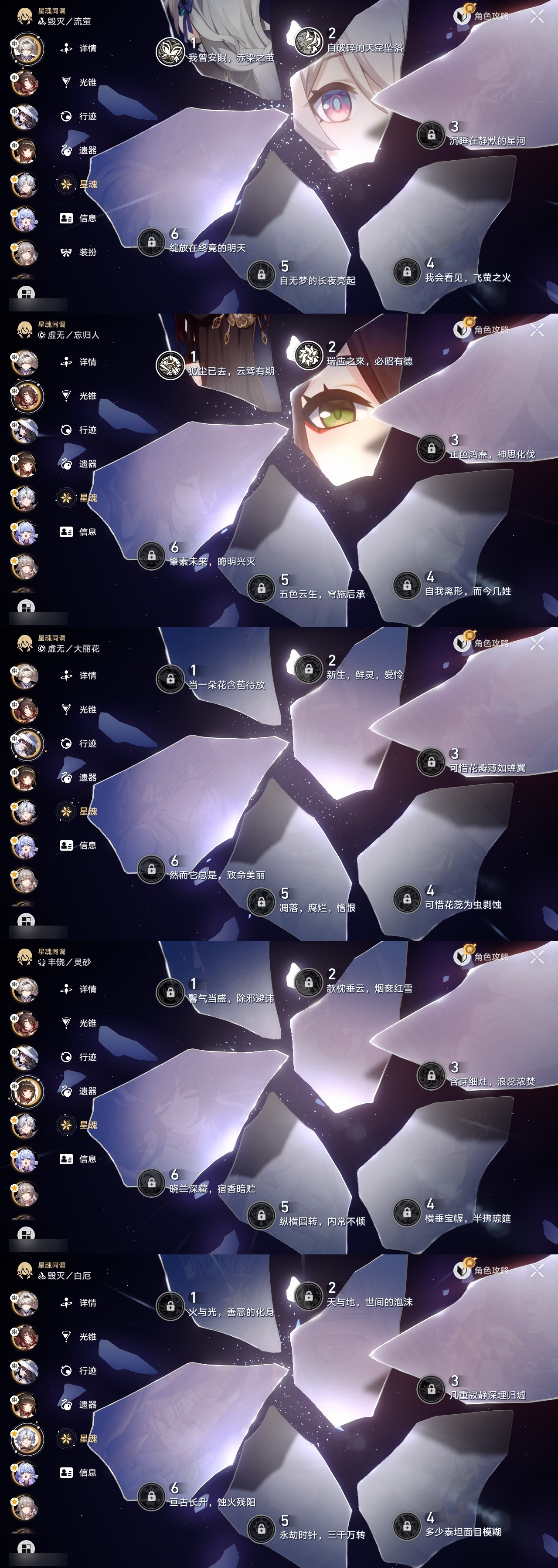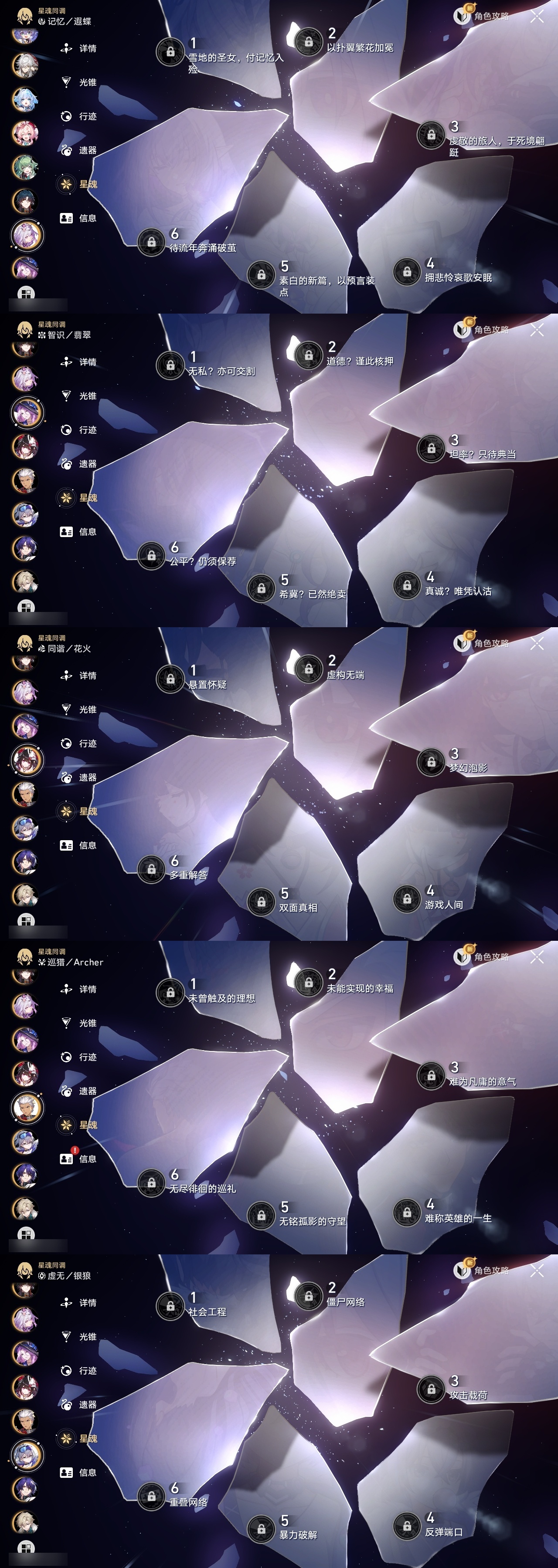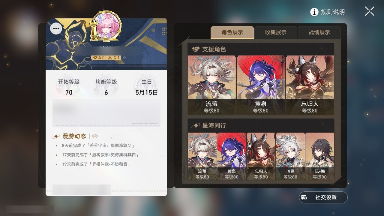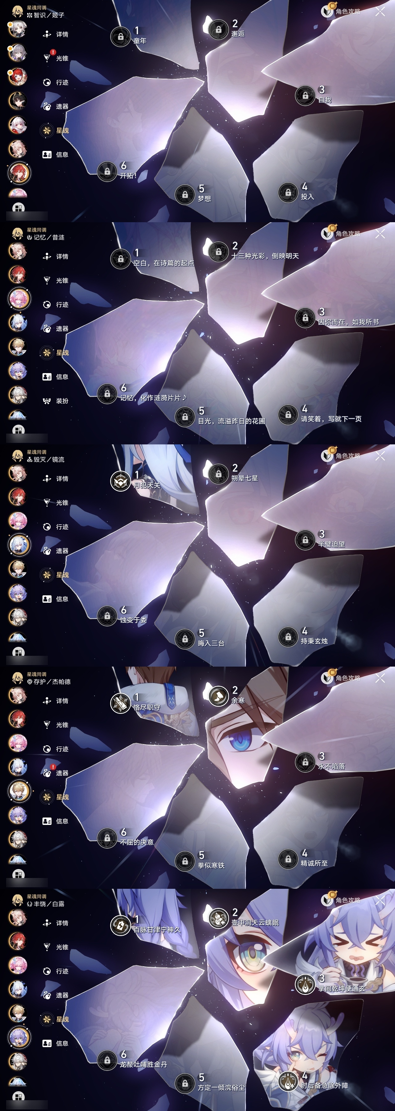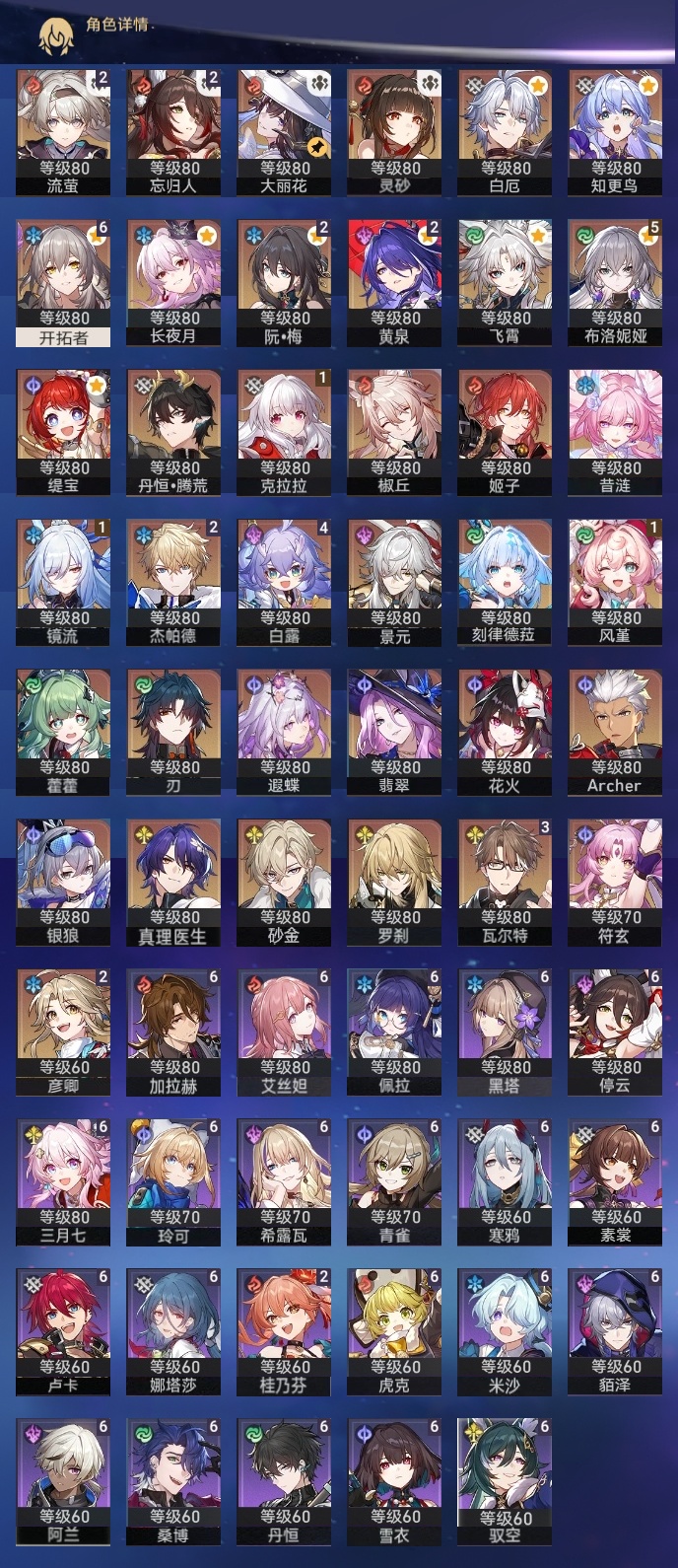 【崩坏·星穹铁道】【lyxq9312】冒险等级:70,女主,五星数量:61,五星角色:布洛妮娅 5命白露 4命瓦尔特 3命杰帕德 2命彦卿 2命忘归人 2命黄泉 2命流萤 2命克拉拉 1命镜流 1命风堇 1命椒丘飞霄银狼景元姬子灵砂罗刹缇宝刃遐蝶符玄藿藿真理医生花火砂金知更鸟白厄archer刻律德菈长夜月丹恒·腾荒昔涟大丽花翡翠__五星光锥:星海巡航 5精记一位星神的陨落 5精记忆永不落幕 5精制胜的瞬间制胜的瞬间无可取代的东西无可取代的东西时节不居时节不居但战斗还未结束拂晓之前雨一直下不息的演算长路终有归途让告别,更美一些此身为剑烦恼着,幸福着惊魂夜镜中故我游戏尘寰行于流逝的岸愿虹光永驻天空黎明恰如此燃烧理想燃烧的地狱勿忘她的火焰梦应归于何处__四星角色:阿兰 6命娜塔莎 6命虎克 6命貊泽 6命黑塔 6命丹恒 6命艾丝妲 6命希露瓦 6命停云 6命素裳 6命桑博 6命三月七 6命青雀 6命佩拉 6命驭空 6命卢卡 6命玲可 6命寒鸦 6命雪衣 6命米沙 6命加拉赫 6命桂乃芬 2命