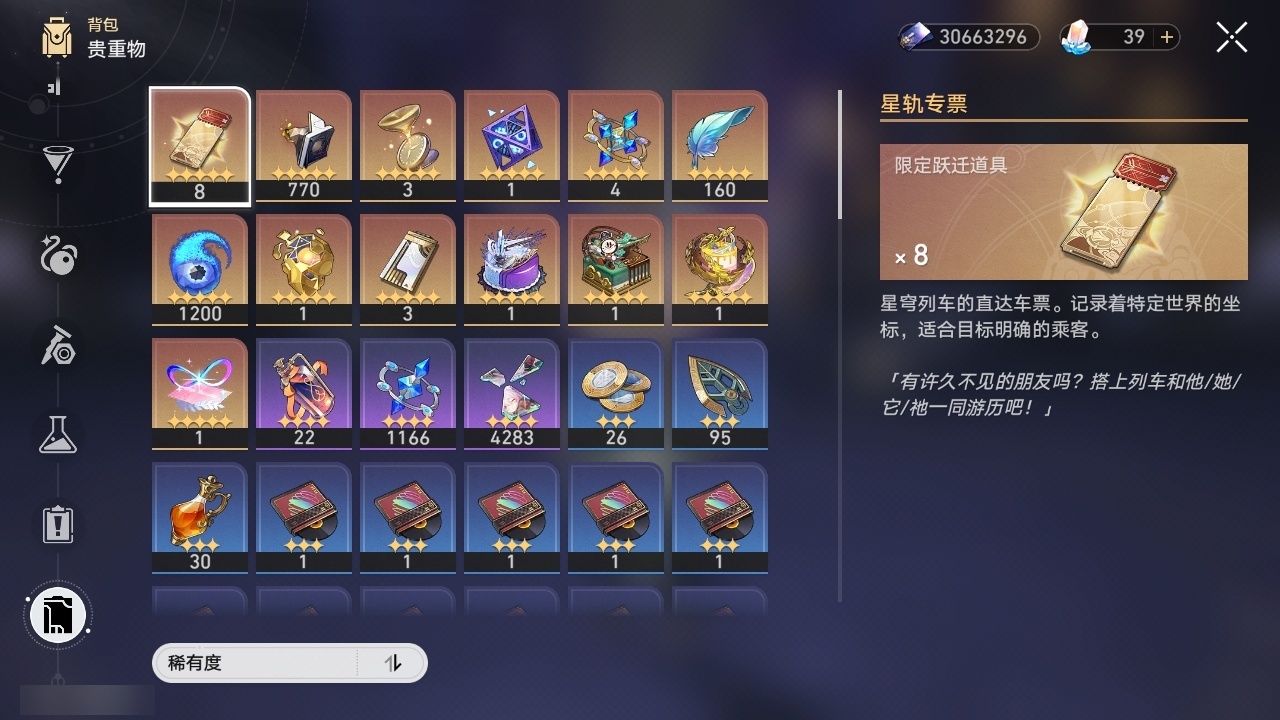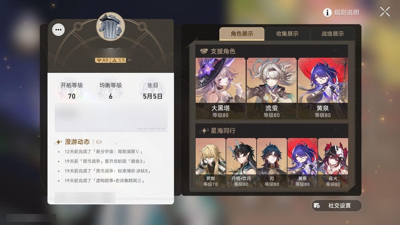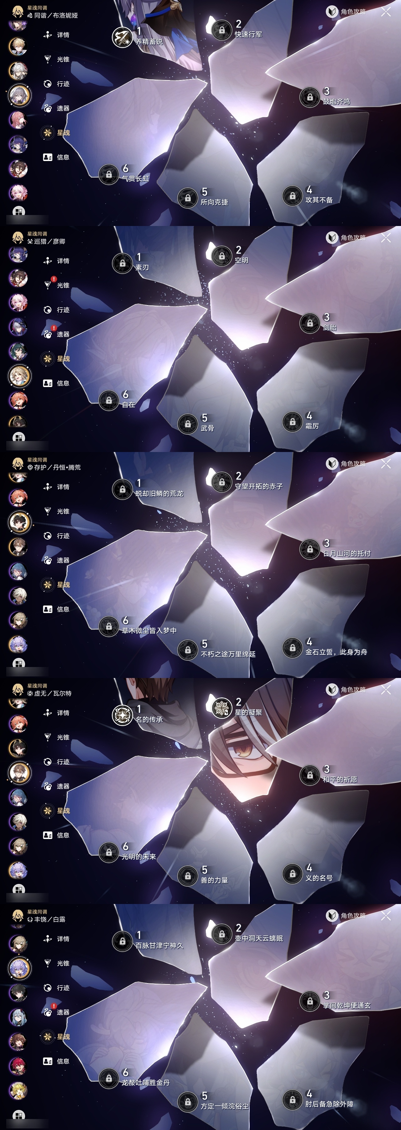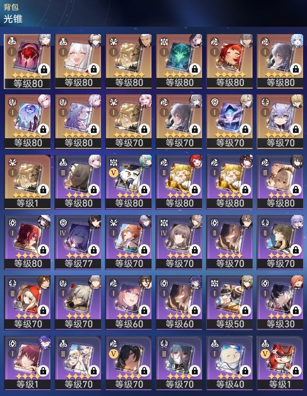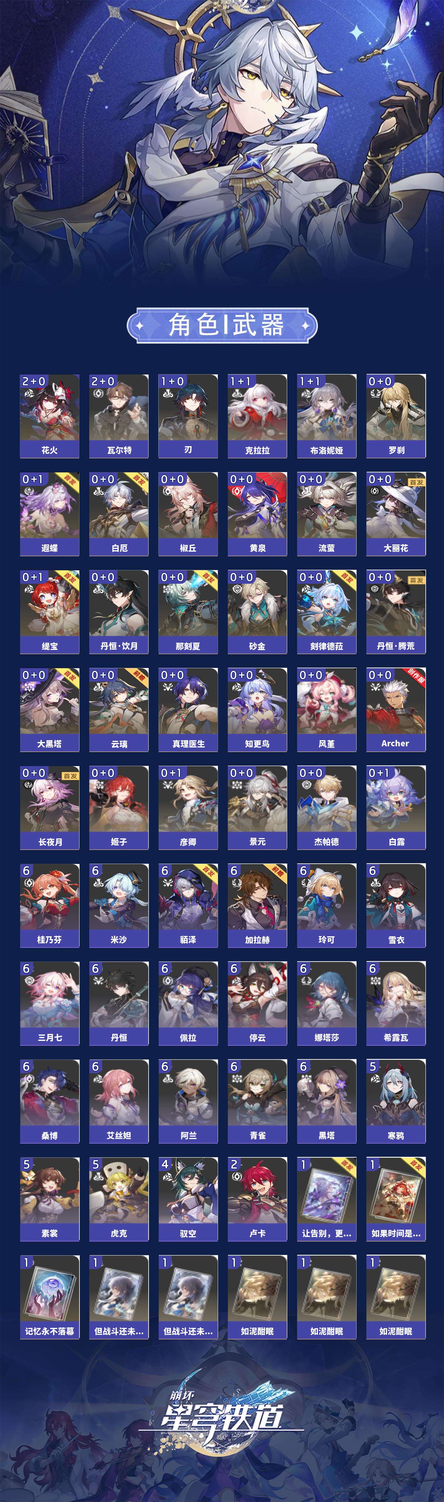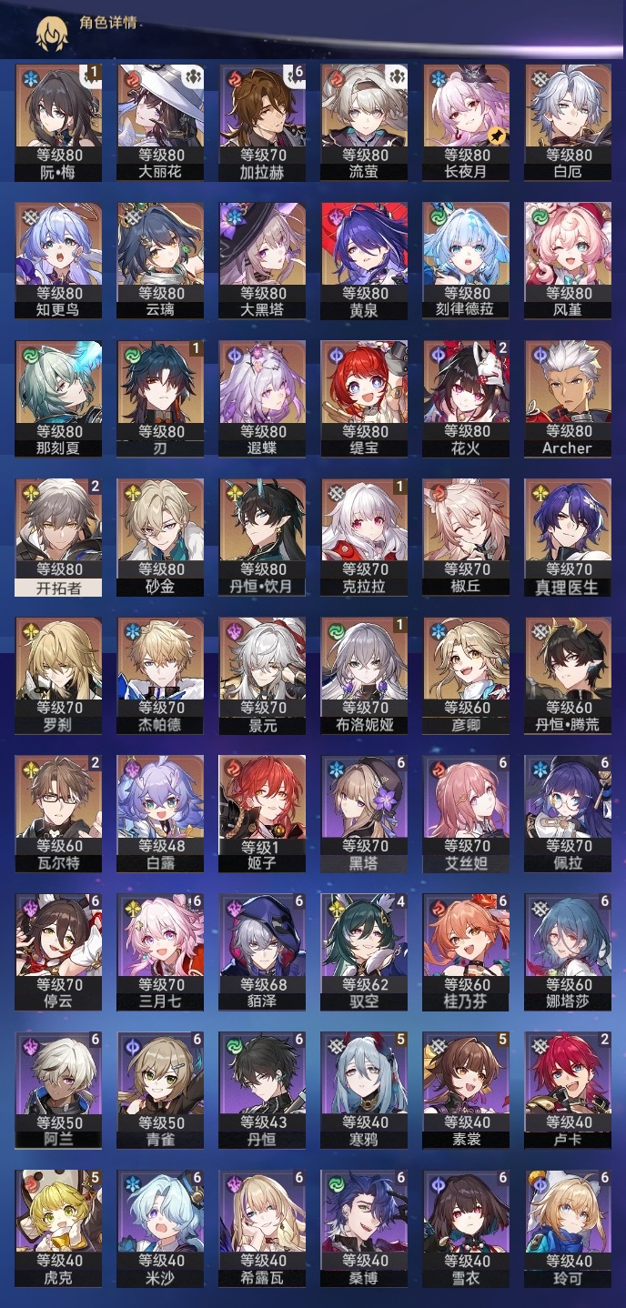 【崩坏·星穹铁道】【lyxq9432】冒险等级:70,男主,五星数量:43,五星角色:瓦尔特 2命花火 2命布洛妮娅 1命克拉拉 1命刃 1命云璃椒丘景元白露姬子杰帕德彦卿大黑塔罗刹缇宝丹恒·饮月遐蝶真理医生那刻夏黄泉风堇砂金知更鸟白厄archer刻律德菈长夜月丹恒·腾荒大丽花流萤__五星光锥:记忆的质料记一位星神的陨落无可取代的东西时节不居如泥酣眠如泥酣眠如泥酣眠但战斗还未结束但战斗还未结束不息的演算如果时间是一朵花让告别,更美一些记忆永不落幕__四星角色:阿兰 6命娜塔莎 6命貊泽 6命黑塔 6命丹恒 6命艾丝妲 6命希露瓦 6命停云 6命桑博 6命三月七 6命青雀 6命佩拉 6命玲可 6命桂乃芬 6命雪衣 6命米沙 6命加拉赫 6命虎克 5命素裳 5命寒鸦 5命驭空 4命卢卡 2命