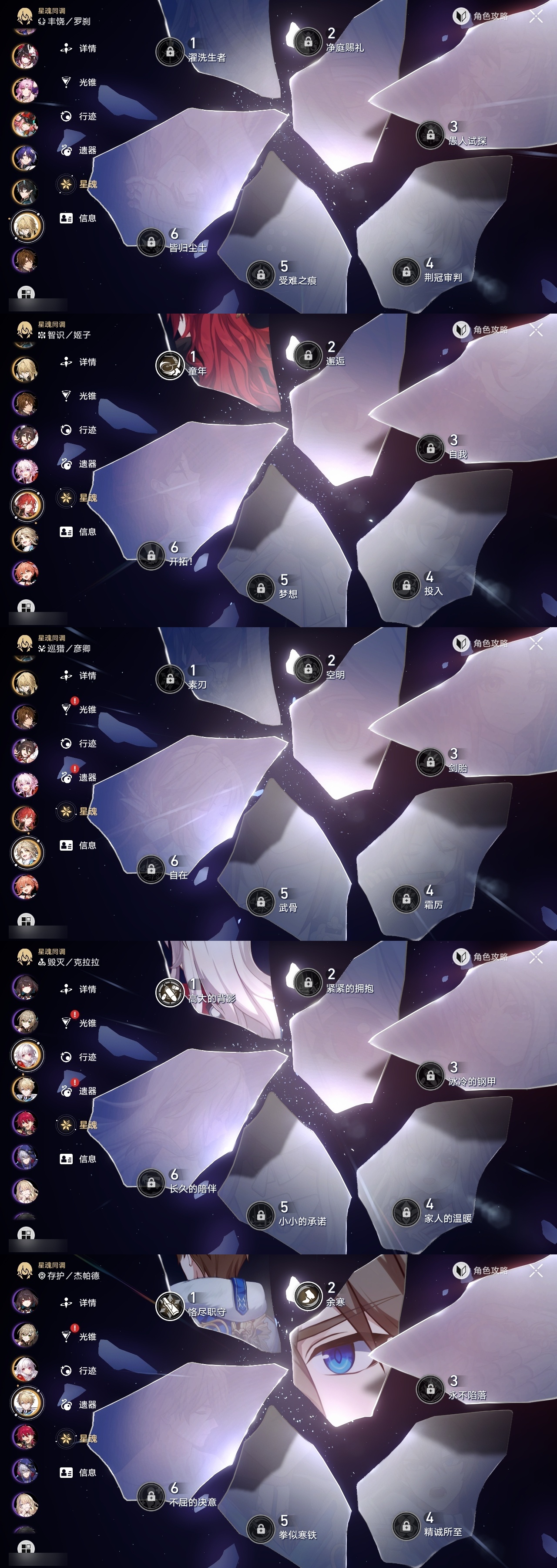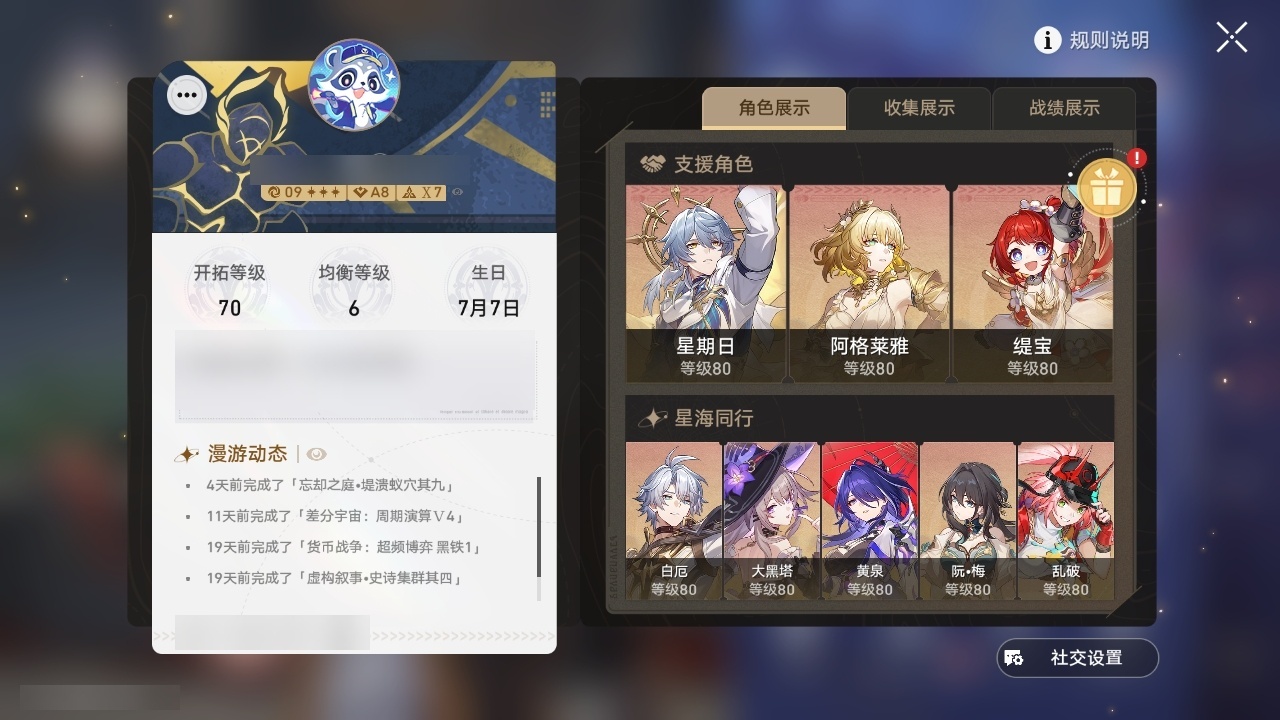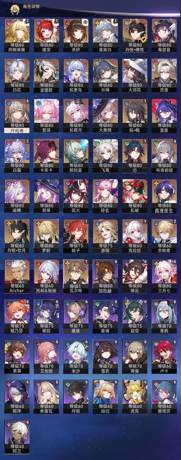 【崩坏·星穹铁道】【lyxq9408】冒险等级:70,女主,五星数量:56,五星角色:布洛妮娅 4命白露 2命杰帕德 2命阿格莱雅 2命姬子 1命瓦尔特 1命克拉拉 1命星期日 1命缇宝 1命刃 1命云璃飞霄灵砂彦卿乱破大黑塔罗刹卡芙卡丹恒·饮月遐蝶符玄托帕账账真理医生花火那刻夏黄泉知更鸟白厄archer海瑟音长夜月丹恒·腾荒昔涟大丽花波提欧流萤翡翠__五星光锥:星海巡航 5精记忆的质料 5精记一位星神的陨落 5精不息的演算 5精到不了的彼岸 2精落日时起舞无可取代的东西无可取代的东西如泥酣眠但战斗还未结束但战斗还未结束将光阴织成黄金如果时间是一朵花孤独的疗愈比阳光更明亮的此身为剑行于流逝的岸记忆永不落幕黎明恰如此燃烧__四星角色:阿兰 6命娜塔莎 6命虎克 6命貊泽 6命黑塔 6命丹恒 6命艾丝妲 6命希露瓦 6命停云 6命素裳 6命桑博 6命三月七 6命青雀 6命佩拉 6命驭空 6命卢卡 6命玲可 6命桂乃芬 6命寒鸦 6命雪衣 6命米沙 6命加拉赫 6命