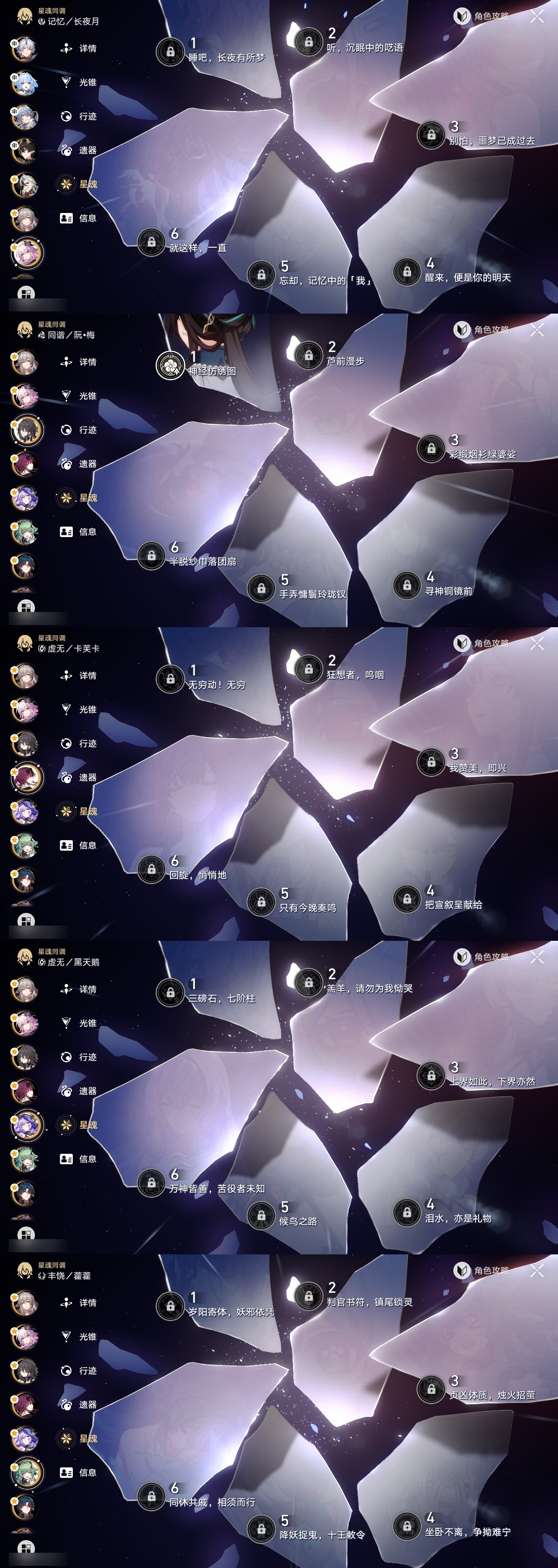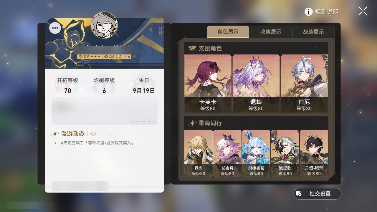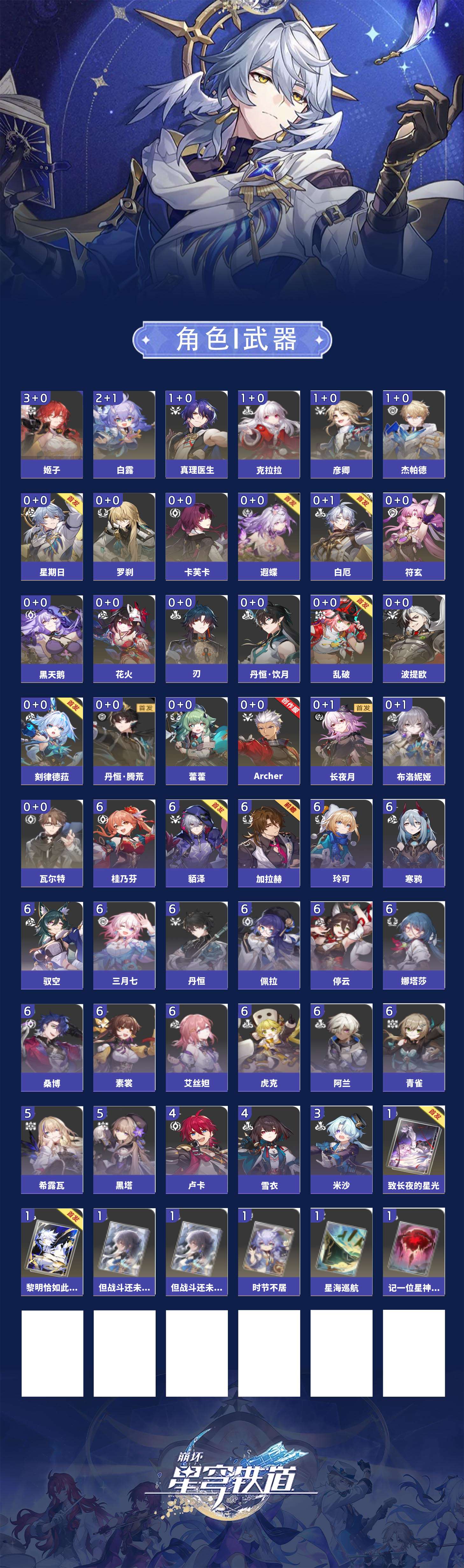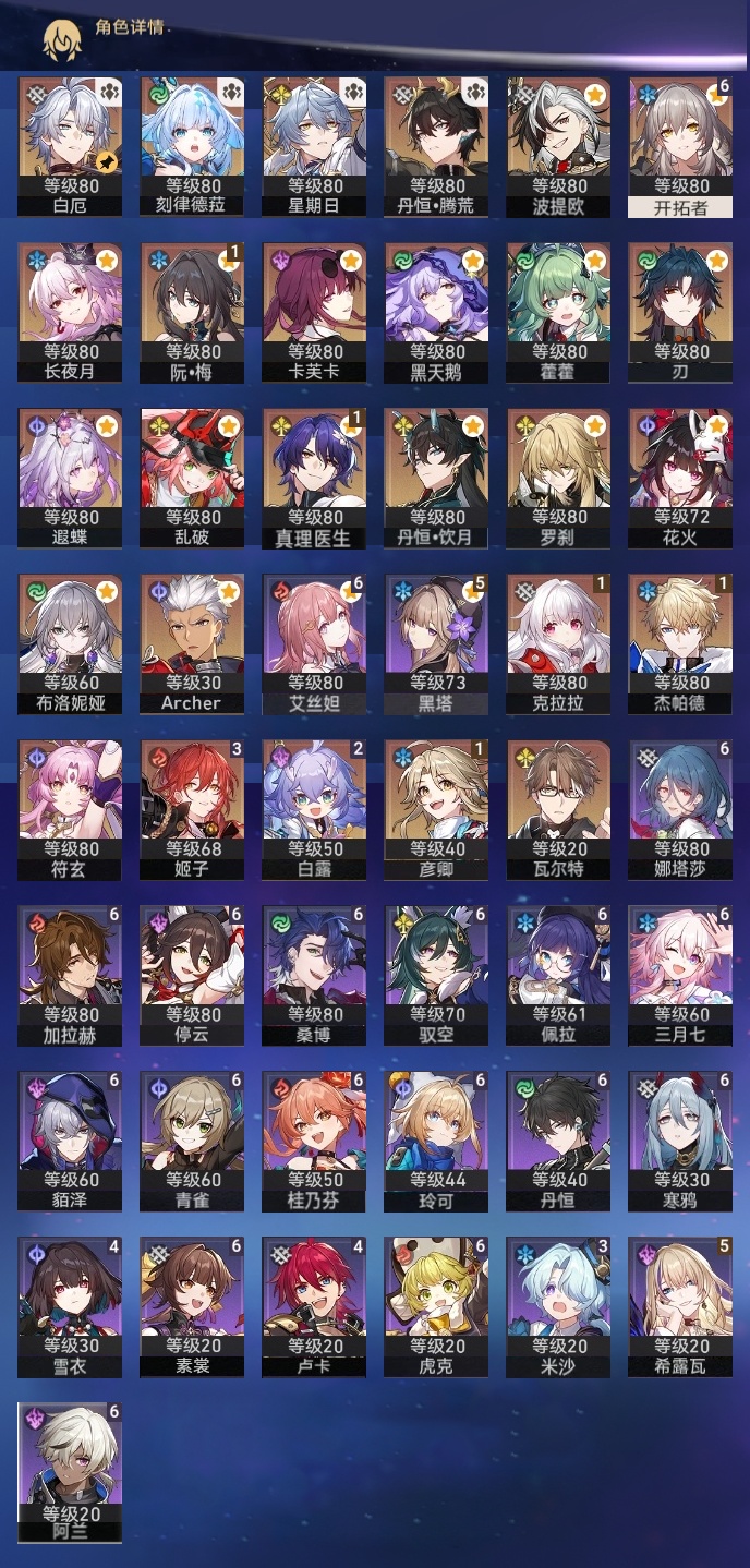 【崩坏·星穹铁道】【lyxq9406】冒险等级:70,女主,五星数量:32,五星角色:姬子 3命白露 2命杰帕德 1命彦卿 1命克拉拉 1命真理医生 1命布洛妮娅瓦尔特乱破星期日罗刹刃卡芙卡丹恒·饮月遐蝶符玄藿藿黑天鹅花火白厄archer刻律德菈长夜月丹恒·腾荒波提欧__五星光锥:星海巡航记一位星神的陨落时节不居但战斗还未结束但战斗还未结束黎明恰如此燃烧致长夜的星光__四星角色:阿兰 6命娜塔莎 6命虎克 6命貊泽 6命丹恒 6命艾丝妲 6命停云 6命素裳 6命桑博 6命三月七 6命青雀 6命佩拉 6命驭空 6命玲可 6命桂乃芬 6命寒鸦 6命加拉赫 6命黑塔 5命希露瓦 5命卢卡 4命雪衣 4命米沙 3命