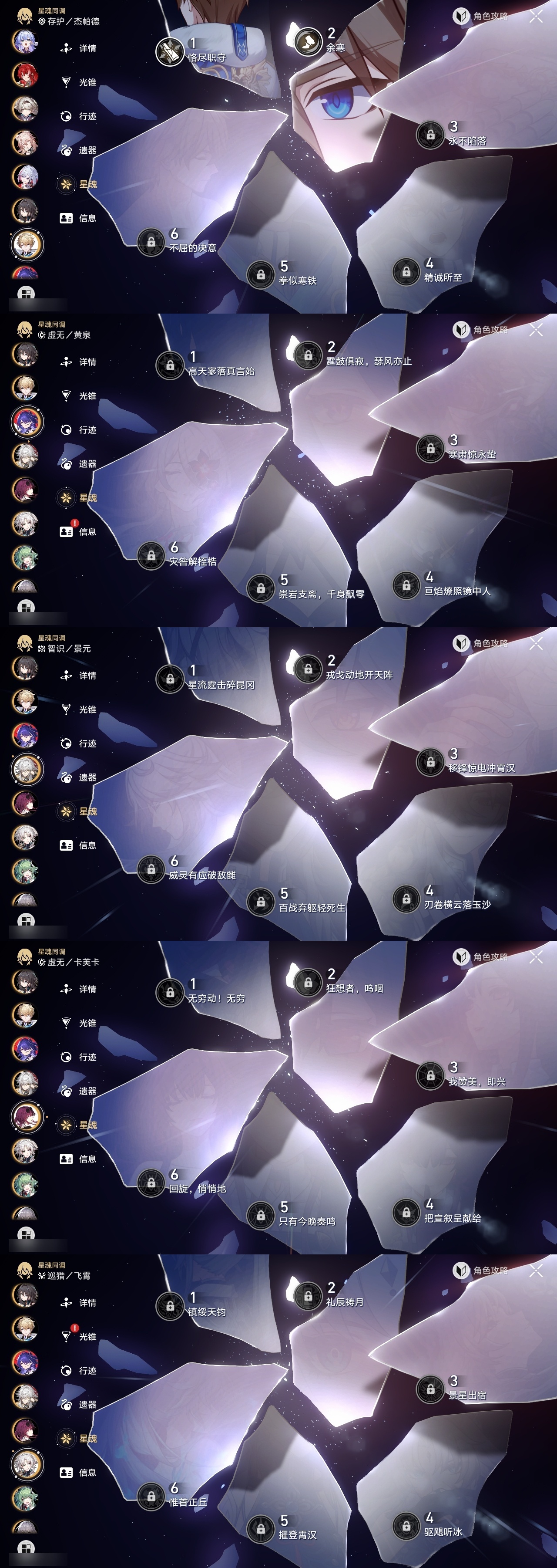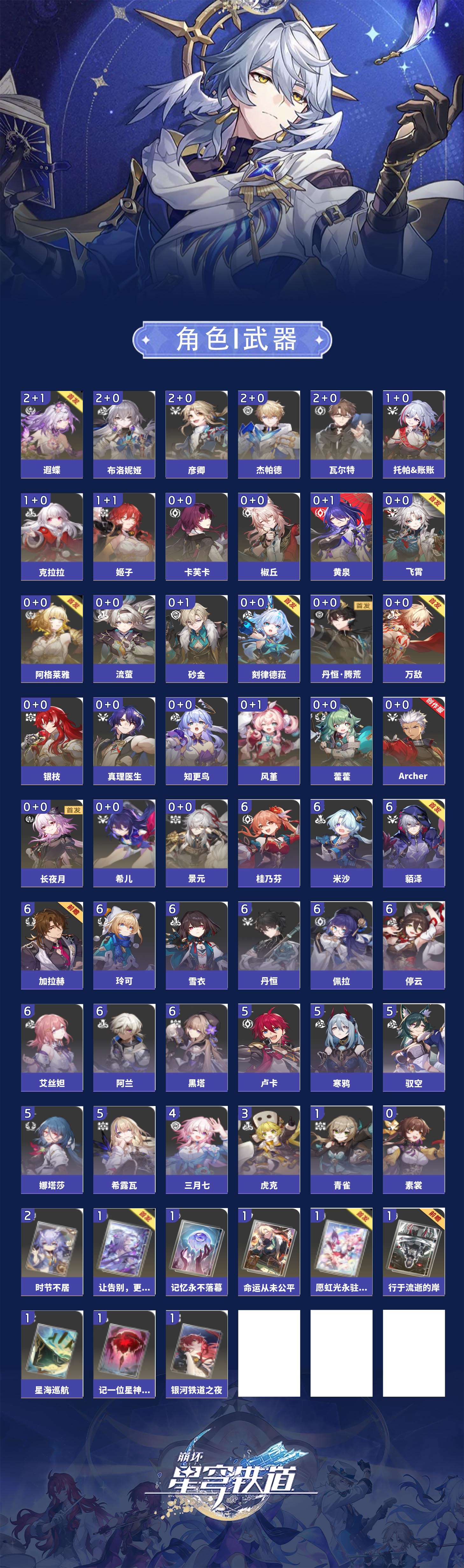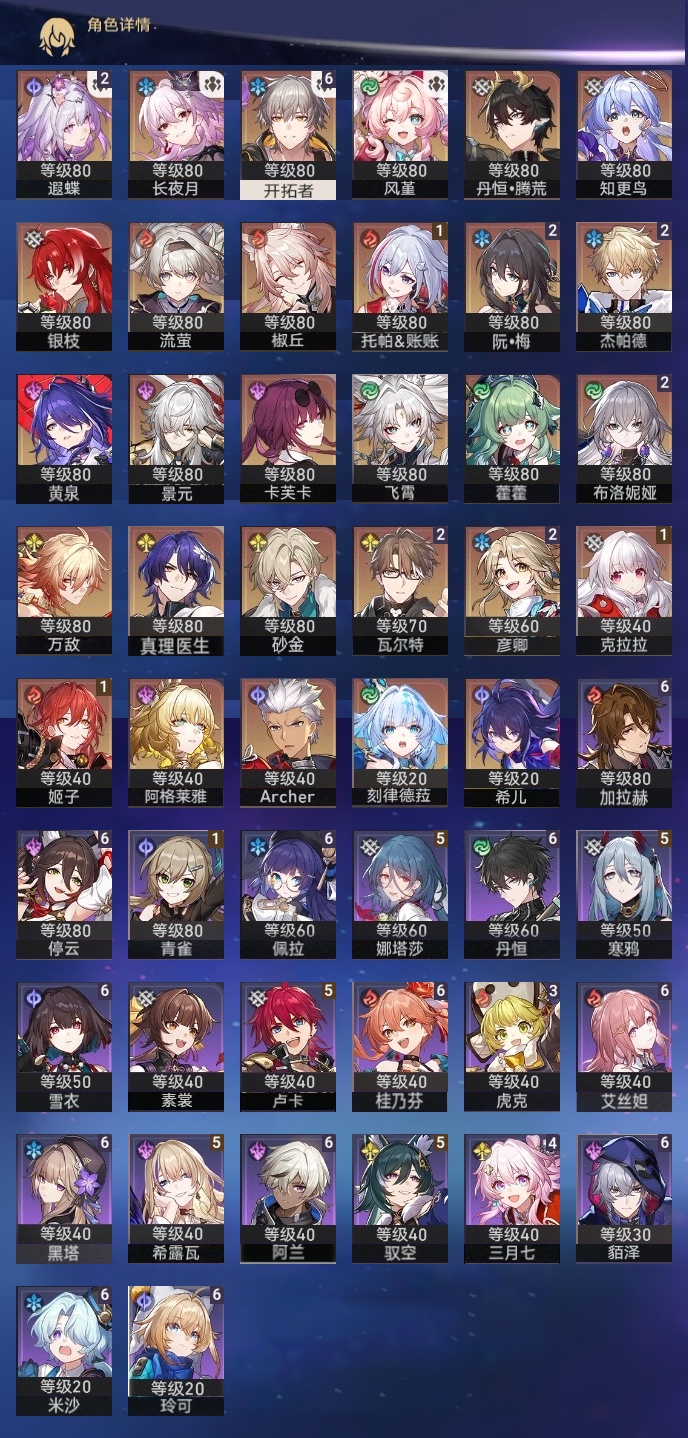 【崩坏·星穹铁道】【lyxq9416】冒险等级:70,男主,五星数量:36,五星角色:布洛妮娅 2命杰帕德 2命彦卿 2命瓦尔特 2命遐蝶 2命姬子 1命克拉拉 1命托帕账账 1命椒丘飞霄景元希儿阿格莱雅万敌卡芙卡藿藿银枝真理医生黄泉风堇砂金知更鸟archer刻律德菈长夜月丹恒·腾荒流萤__五星光锥:时节不居 2精星海巡航记一位星神的陨落银河铁道之夜让告别,更美一些行于流逝的岸愿虹光永驻天空命运从未公平记忆永不落幕__四星角色:阿兰 6命貊泽 6命黑塔 6命丹恒 6命艾丝妲 6命停云 6命佩拉 6命玲可 6命桂乃芬 6命雪衣 6命米沙 6命加拉赫 6命娜塔莎 5命希露瓦 5命驭空 5命卢卡 5命寒鸦 5命三月七 4命虎克 3命青雀 1命素裳