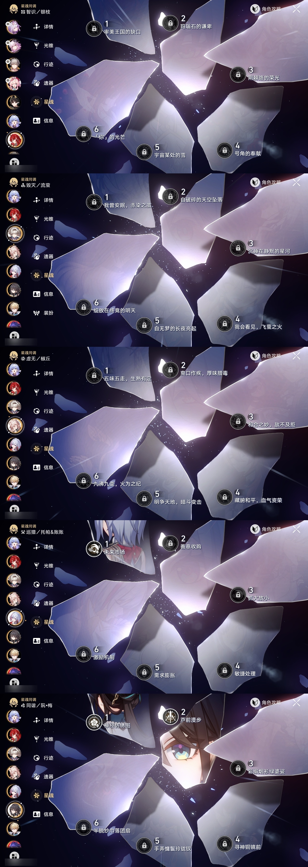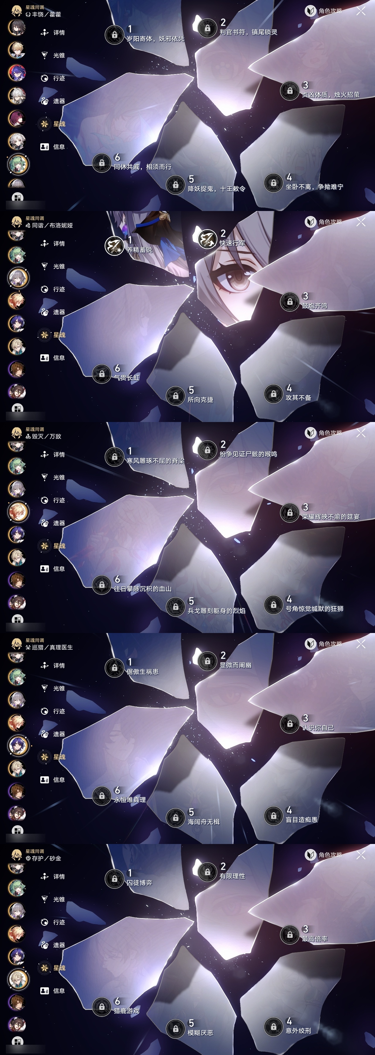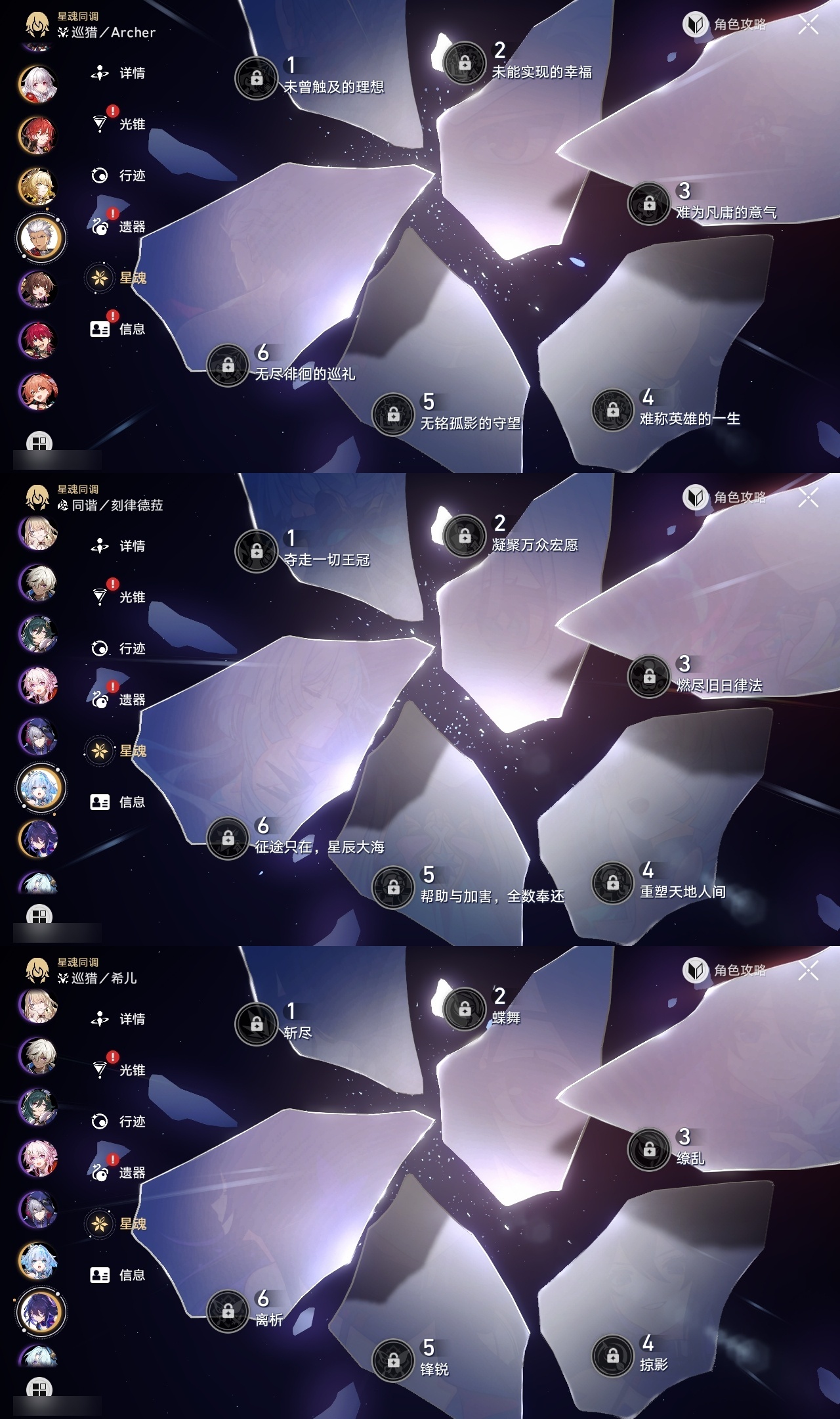 【崩坏·星穹铁道】【lyxq9416】冒险等级:70,男主,五星数量:36,五星角色:布洛妮娅 2命杰帕德 2命彦卿 2命瓦尔特 2命遐蝶 2命姬子 1命克拉拉 1命托帕账账 1命椒丘飞霄景元希儿阿格莱雅万敌卡芙卡藿藿银枝真理医生黄泉风堇砂金知更鸟archer刻律德菈长夜月丹恒·腾荒流萤__五星光锥:时节不居 2精星海巡航记一位星神的陨落银河铁道之夜让告别,更美一些行于流逝的岸愿虹光永驻天空命运从未公平记忆永不落幕__四星角色:阿兰 6命貊泽 6命黑塔 6命丹恒 6命艾丝妲 6命停云 6命佩拉 6命玲可 6命桂乃芬 6命雪衣 6命米沙 6命加拉赫 6命娜塔莎 5命希露瓦 5命驭空 5命卢卡 5命寒鸦 5命三月七 4命虎克 3命青雀 1命素裳