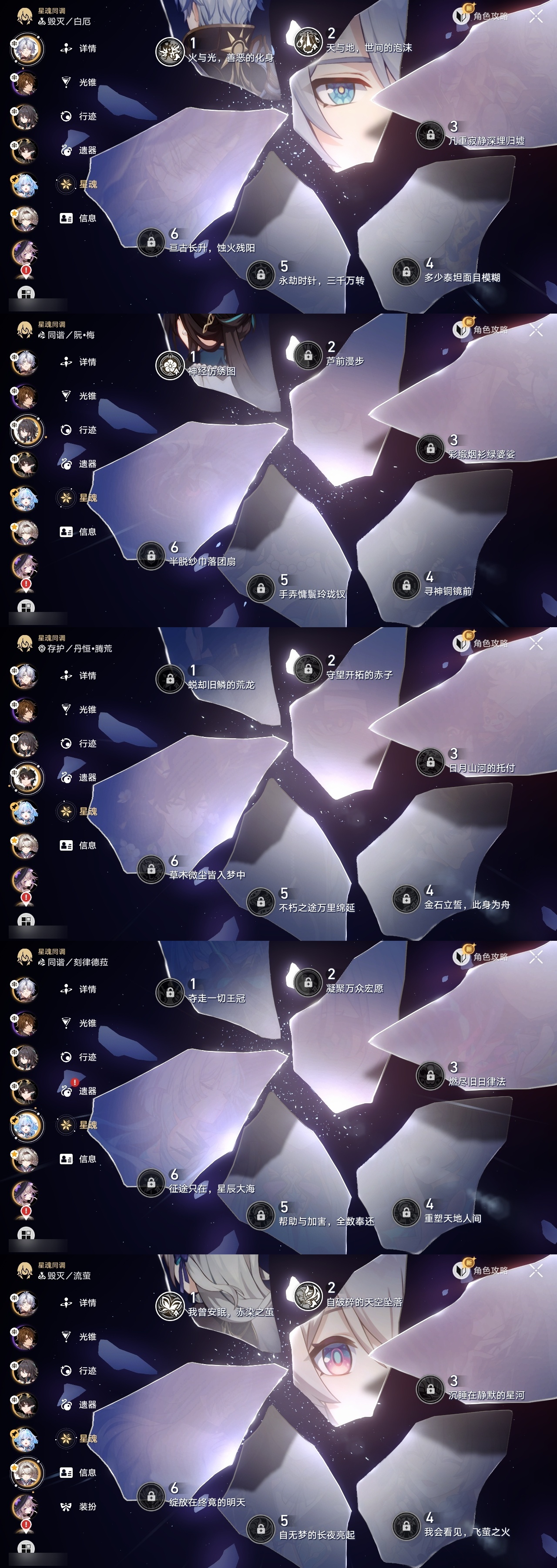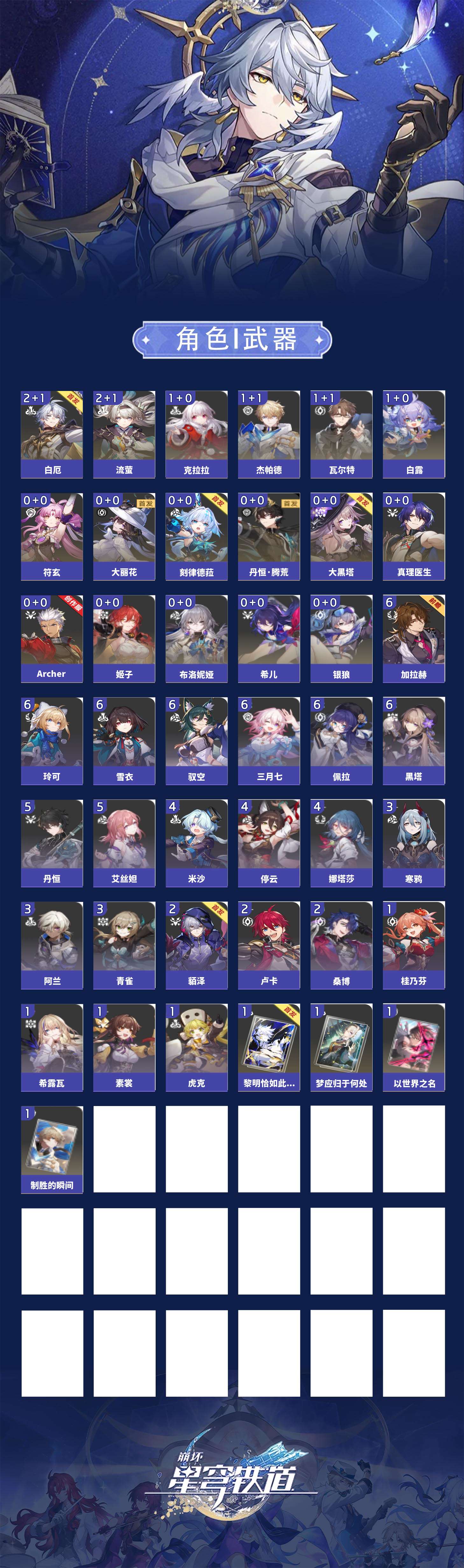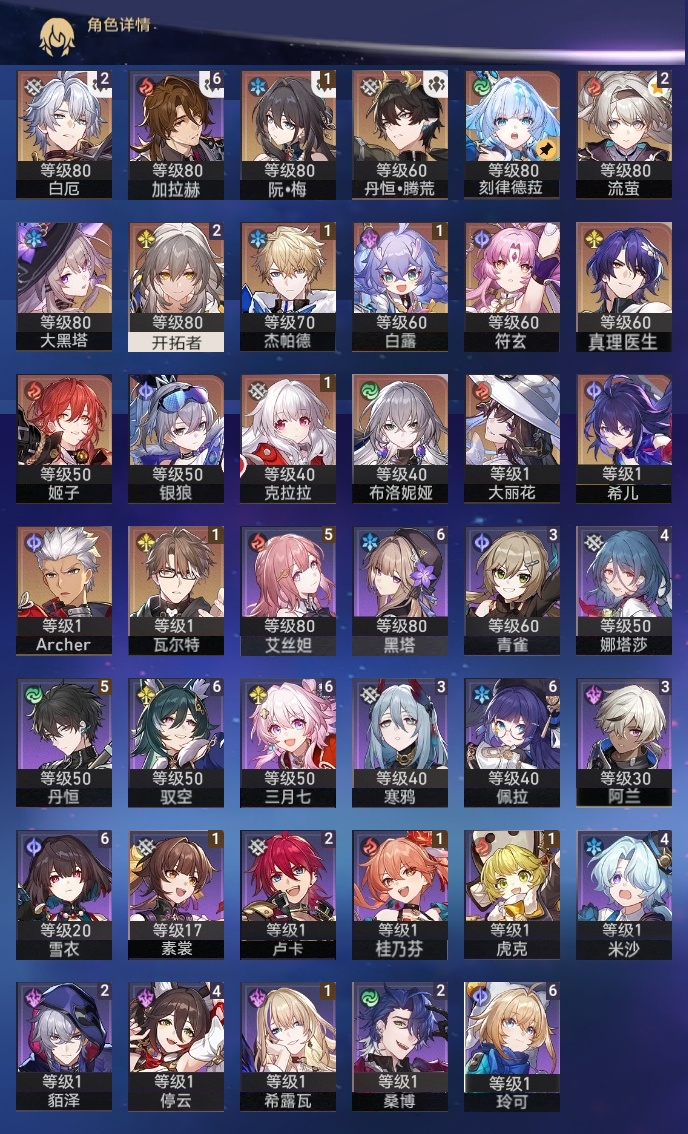 【崩坏·星穹铁道】【lyxq9445】冒险等级:66,女主,五星数量:21,五星角色:白厄 2命流萤 2命白露 1命杰帕德 1命瓦尔特 1命克拉拉 1命银狼希儿布洛妮娅姬子大黑塔符玄真理医生archer刻律德菈丹恒·腾荒大丽花__五星光锥:制胜的瞬间以世界之名黎明恰如此燃烧梦应归于何处__四星角色:黑塔 6命三月七 6命佩拉 6命驭空 6命玲可 6命雪衣 6命加拉赫 6命丹恒 5命艾丝妲 5命娜塔莎 4命停云 4命米沙 4命阿兰 3命青雀 3命寒鸦 3命貊泽 2命桑博 2命卢卡 2命虎克 1命希露瓦 1命素裳 1命桂乃芬 1命21白厄队 21流萤击破队
