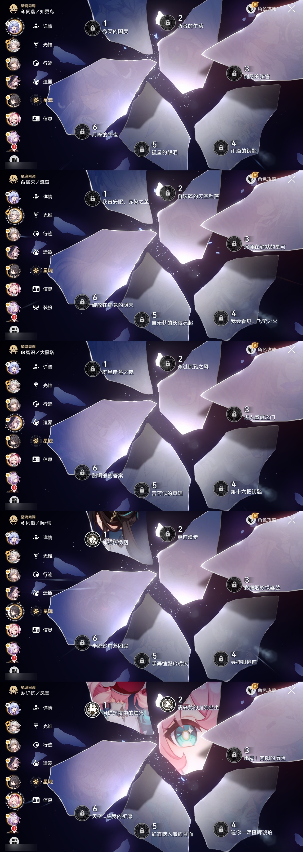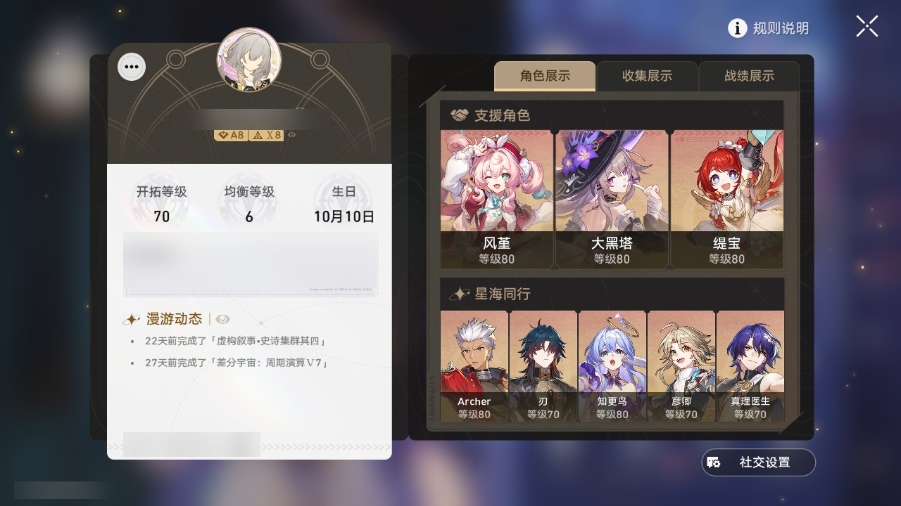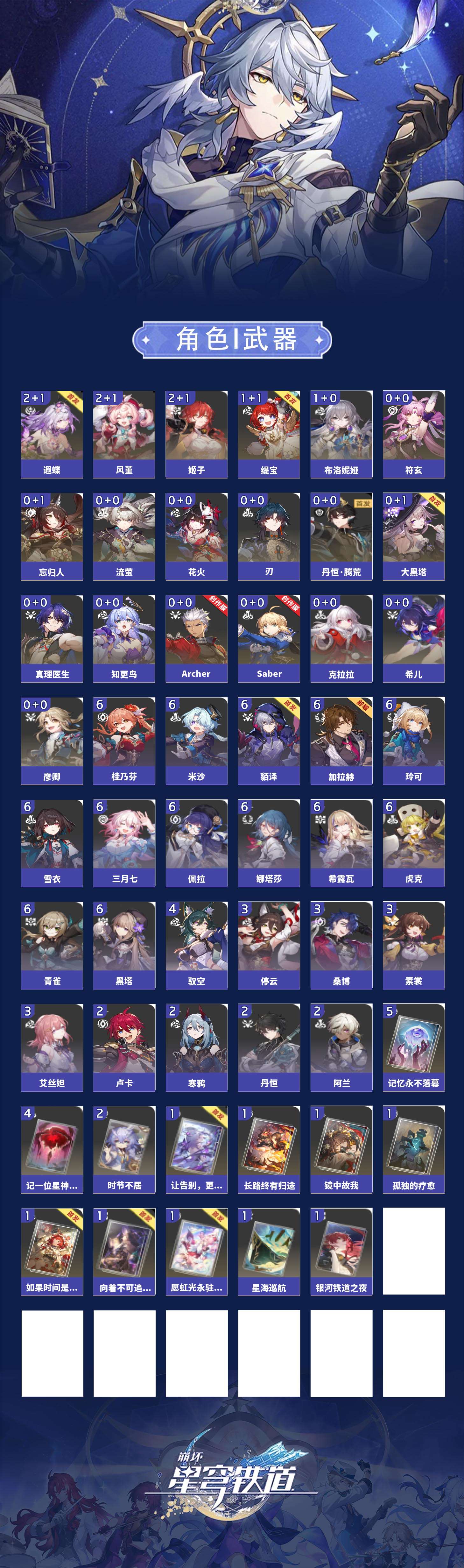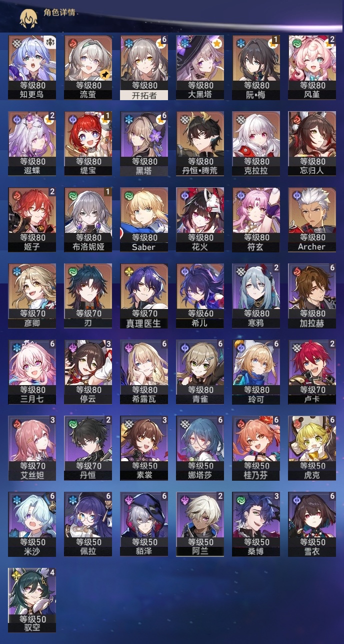 【崩坏·星穹铁道】【lyxq9453】冒险等级:70,女主,五星数量:32,五星角色:姬子 2命遐蝶 2命风堇 2命布洛妮娅 1命缇宝 1命希儿彦卿克拉拉大黑塔忘归人刃符玄真理医生花火知更鸟saberarcher丹恒·腾荒流萤__五星光锥:不息的演算 5精记忆永不落幕 5精记一位星神的陨落 4精时节不居 2精星海巡航银河铁道之夜向着不可追问处长路终有归途如果时间是一朵花孤独的疗愈让告别,更美一些镜中故我愿虹光永驻天空__四星角色:娜塔莎 6命虎克 6命貊泽 6命黑塔 6命希露瓦 6命三月七 6命青雀 6命佩拉 6命玲可 6命桂乃芬 6命雪衣 6命米沙 6命加拉赫 6命驭空 4命艾丝妲 3命停云 3命素裳 3命桑博 3命阿兰 2命丹恒 2命卢卡 2命寒鸦 2命