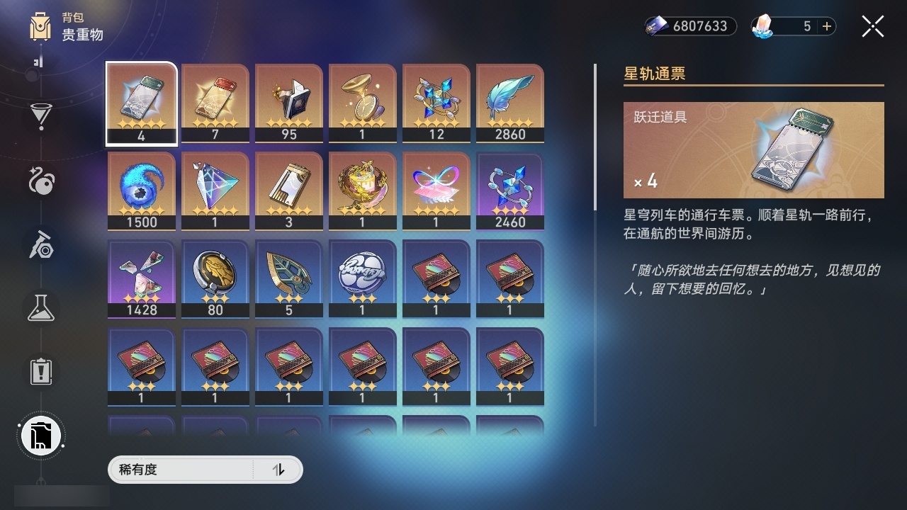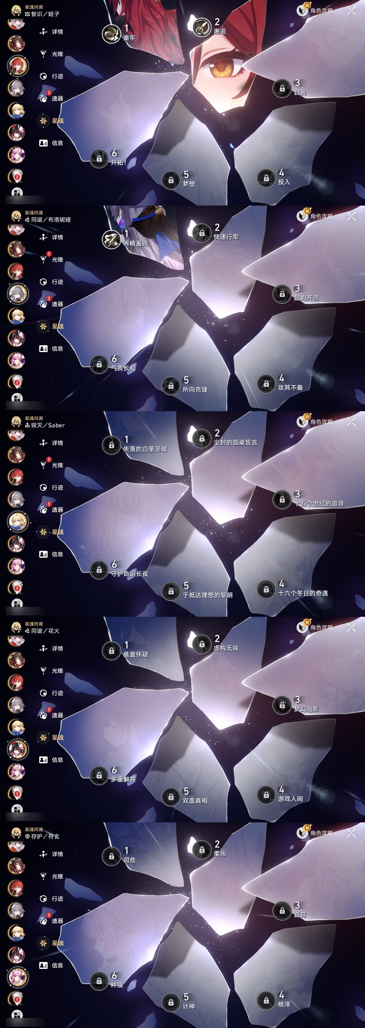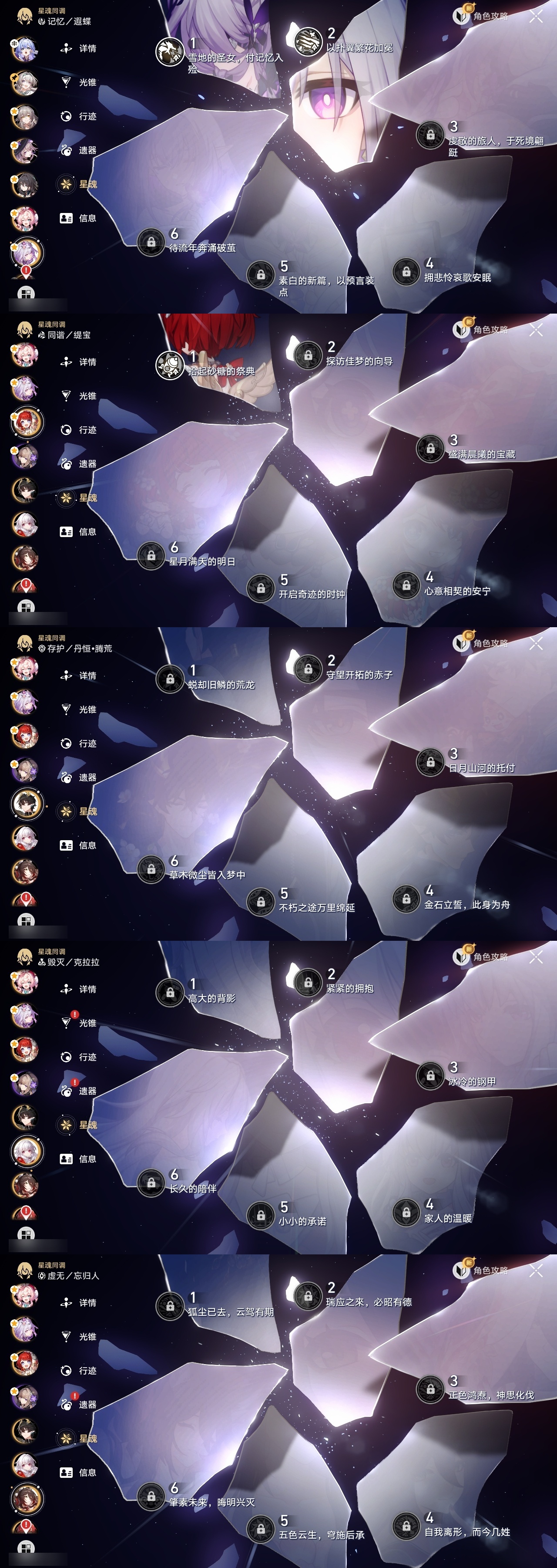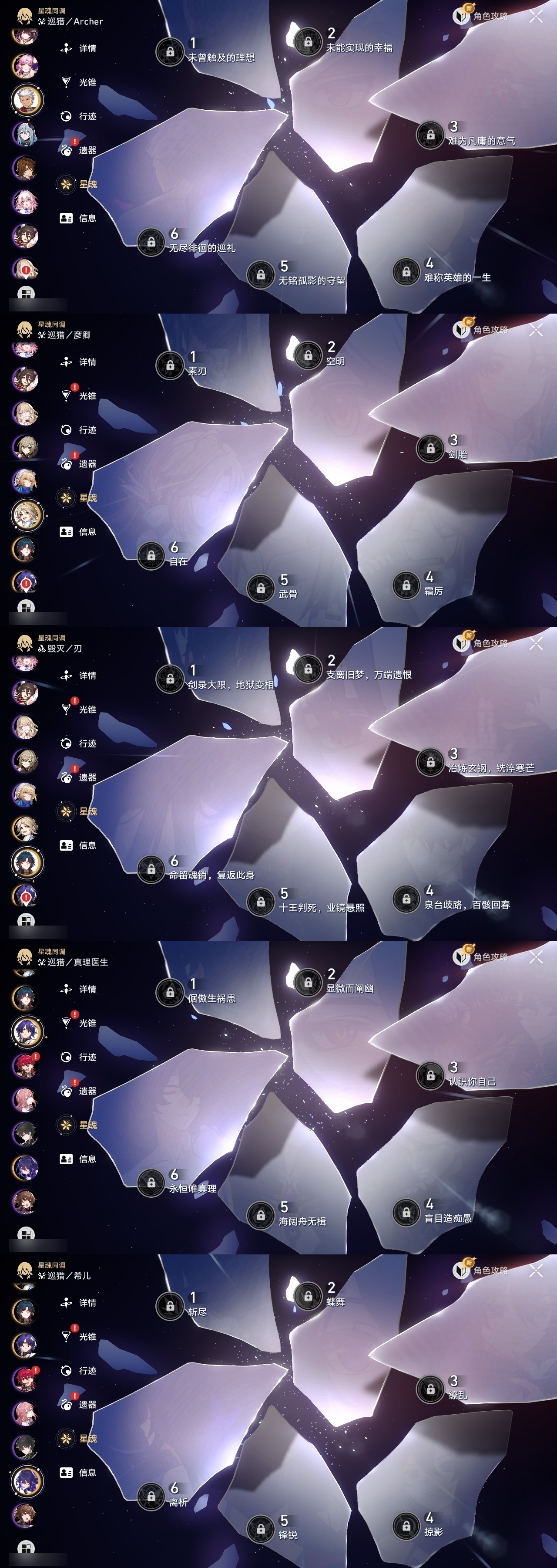 【崩坏·星穹铁道】【lyxq9453】冒险等级:70,女主,五星数量:32,五星角色:姬子 2命遐蝶 2命风堇 2命布洛妮娅 1命缇宝 1命希儿彦卿克拉拉大黑塔忘归人刃符玄真理医生花火知更鸟saberarcher丹恒·腾荒流萤__五星光锥:不息的演算 5精记忆永不落幕 5精记一位星神的陨落 4精时节不居 2精星海巡航银河铁道之夜向着不可追问处长路终有归途如果时间是一朵花孤独的疗愈让告别,更美一些镜中故我愿虹光永驻天空__四星角色:娜塔莎 6命虎克 6命貊泽 6命黑塔 6命希露瓦 6命三月七 6命青雀 6命佩拉 6命玲可 6命桂乃芬 6命雪衣 6命米沙 6命加拉赫 6命驭空 4命艾丝妲 3命停云 3命素裳 3命桑博 3命阿兰 2命丹恒 2命卢卡 2命寒鸦 2命