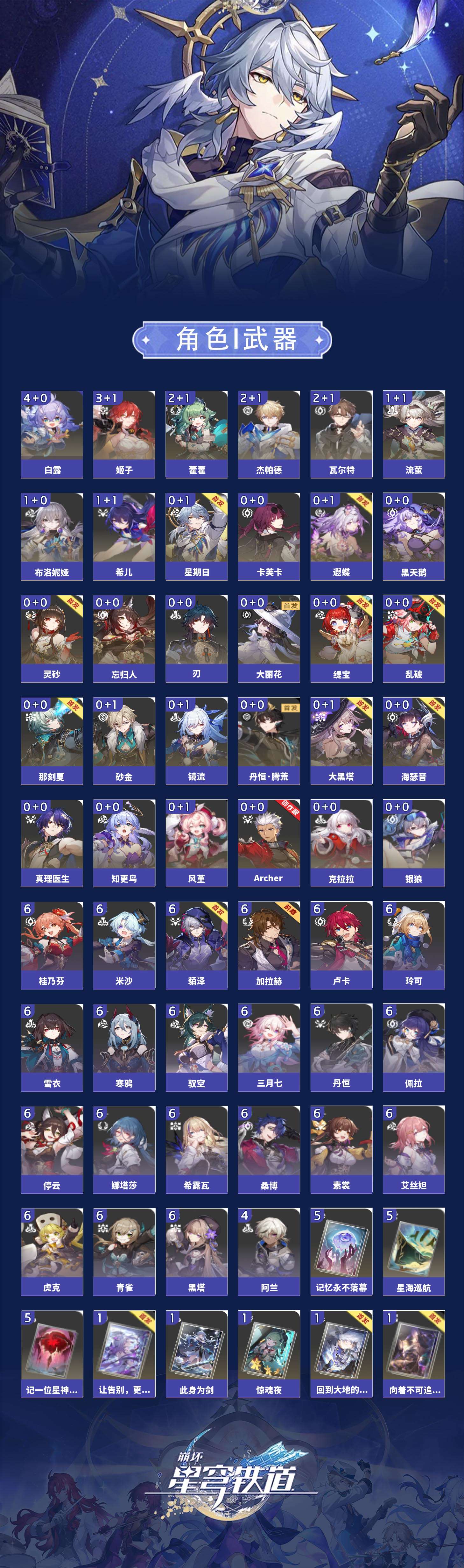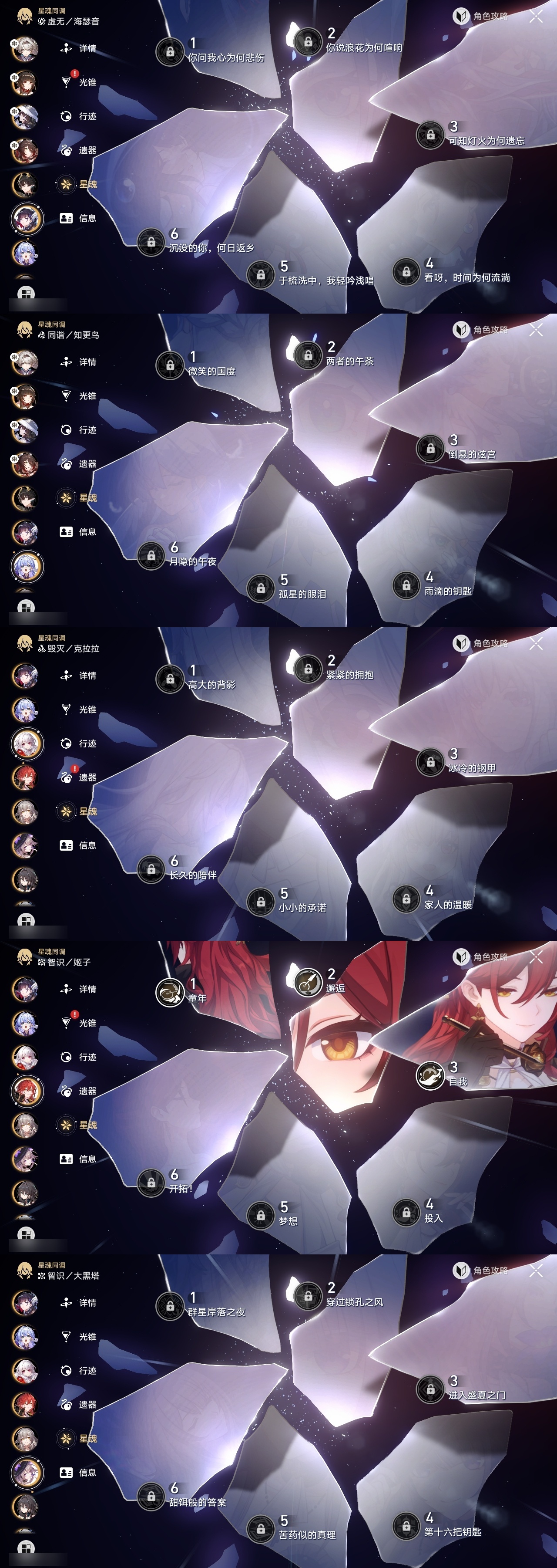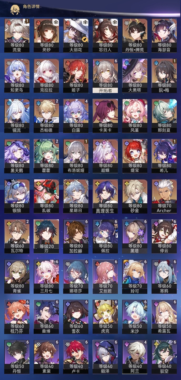 【崩坏·星穹铁道】【lyxq9561】冒险等级:70,女主,五星数量:48,五星角色:白露 4命姬子 3命杰帕德 2命瓦尔特 2命藿藿 2命希儿 1命布洛妮娅 1命流萤 1命银狼灵砂克拉拉乱破星期日大黑塔忘归人缇宝刃卡芙卡遐蝶镜流真理医生黑天鹅那刻夏风堇砂金知更鸟archer海瑟音丹恒·腾荒大丽花__五星光锥:星海巡航 5精记一位星神的陨落 5精记忆永不落幕 5精制胜的瞬间制胜的瞬间制胜的瞬间银河铁道之夜以世界之名如泥酣眠于夜色中回到大地的飞行向着不可追问处让告别,更美一些此身为剑惊魂夜愿虹光永驻天空命运从未公平梦应归于何处__四星角色:娜塔莎 6命虎克 6命貊泽 6命黑塔 6命丹恒 6命艾丝妲 6命希露瓦 6命停云 6命素裳 6命桑博 6命三月七 6命青雀 6命佩拉 6命驭空 6命卢卡 6命玲可 6命桂乃芬 6命寒鸦 6命雪衣 6命米沙 6命加拉赫 6命阿兰 4命