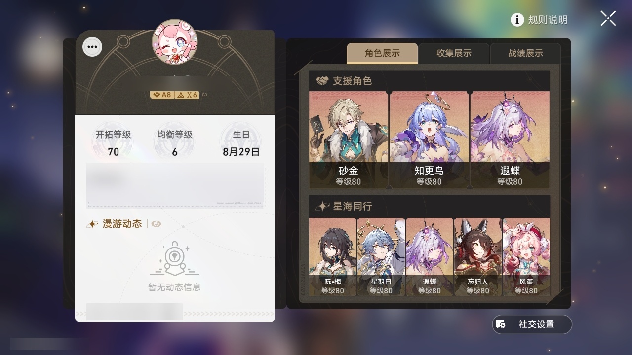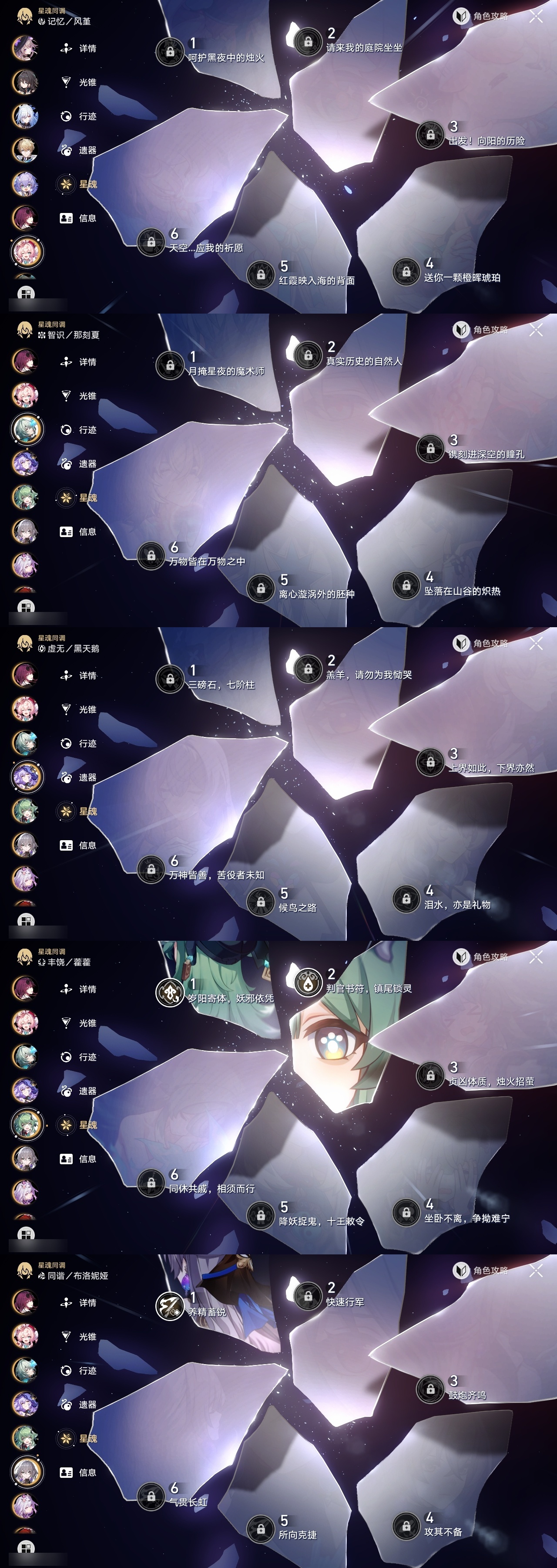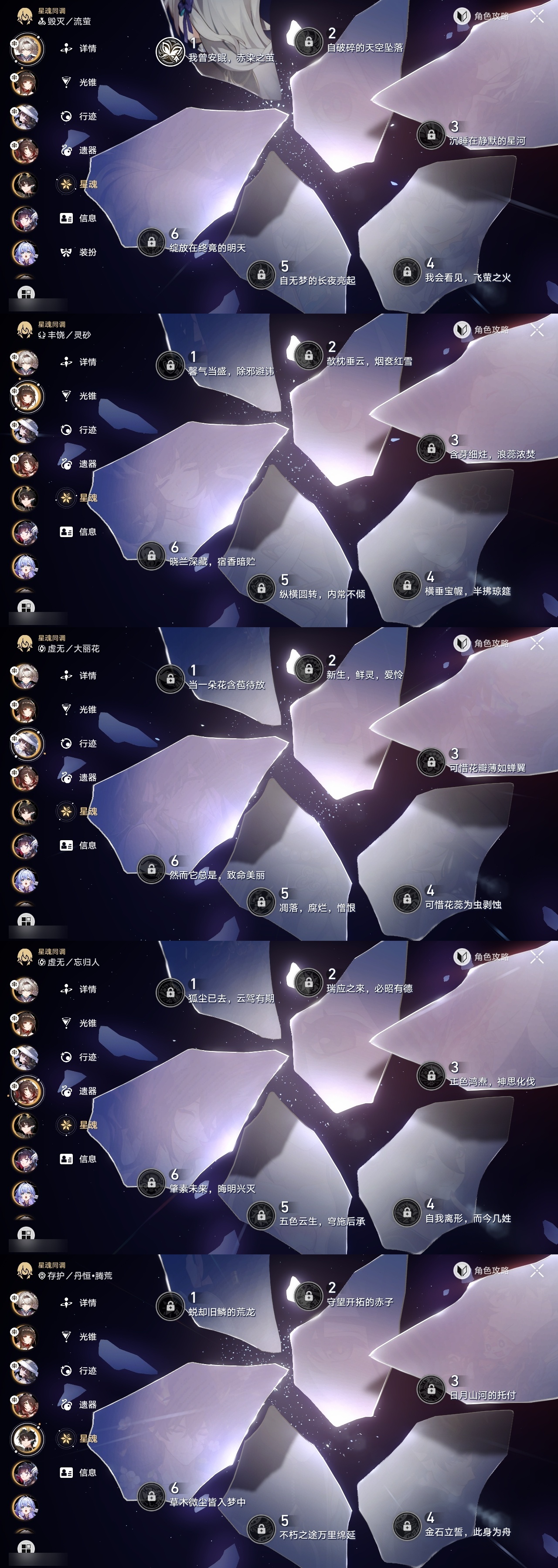 【崩坏·星穹铁道】【lyxq9561】冒险等级:70,女主,五星数量:48,五星角色:白露 4命姬子 3命杰帕德 2命瓦尔特 2命藿藿 2命希儿 1命布洛妮娅 1命流萤 1命银狼灵砂克拉拉乱破星期日大黑塔忘归人缇宝刃卡芙卡遐蝶镜流真理医生黑天鹅那刻夏风堇砂金知更鸟archer海瑟音丹恒·腾荒大丽花__五星光锥:星海巡航 5精记一位星神的陨落 5精记忆永不落幕 5精制胜的瞬间制胜的瞬间制胜的瞬间银河铁道之夜以世界之名如泥酣眠于夜色中回到大地的飞行向着不可追问处让告别,更美一些此身为剑惊魂夜愿虹光永驻天空命运从未公平梦应归于何处__四星角色:娜塔莎 6命虎克 6命貊泽 6命黑塔 6命丹恒 6命艾丝妲 6命希露瓦 6命停云 6命素裳 6命桑博 6命三月七 6命青雀 6命佩拉 6命驭空 6命卢卡 6命玲可 6命桂乃芬 6命寒鸦 6命雪衣 6命米沙 6命加拉赫 6命阿兰 4命