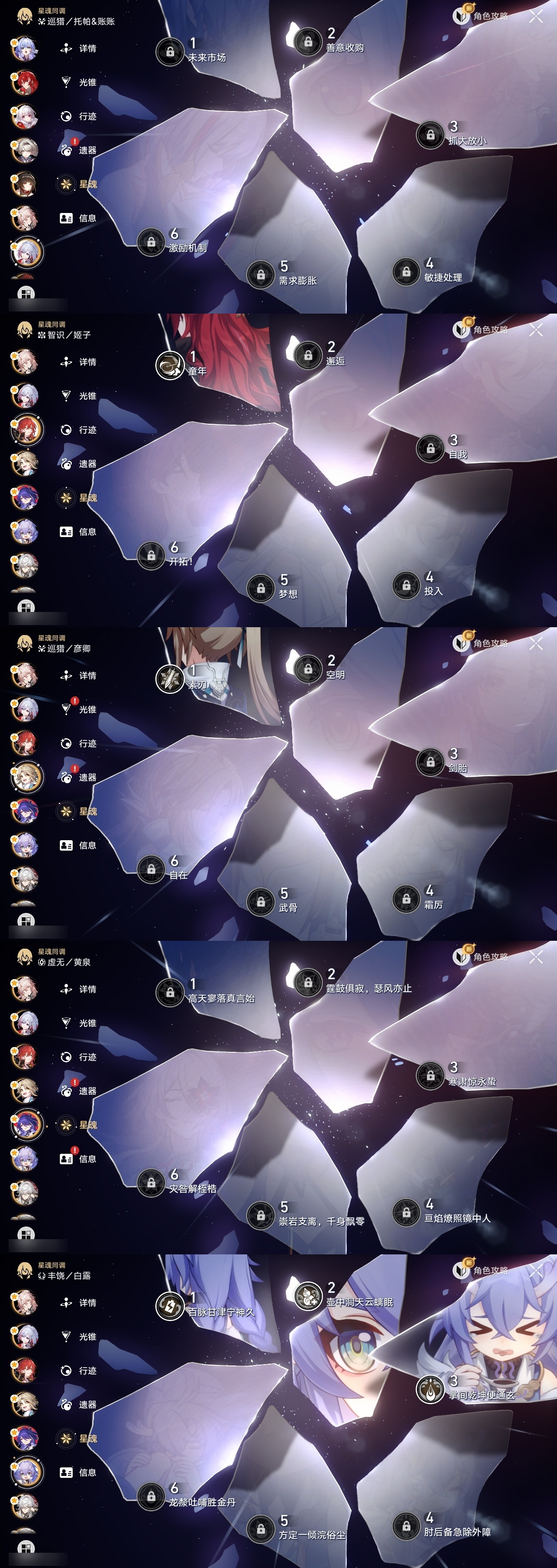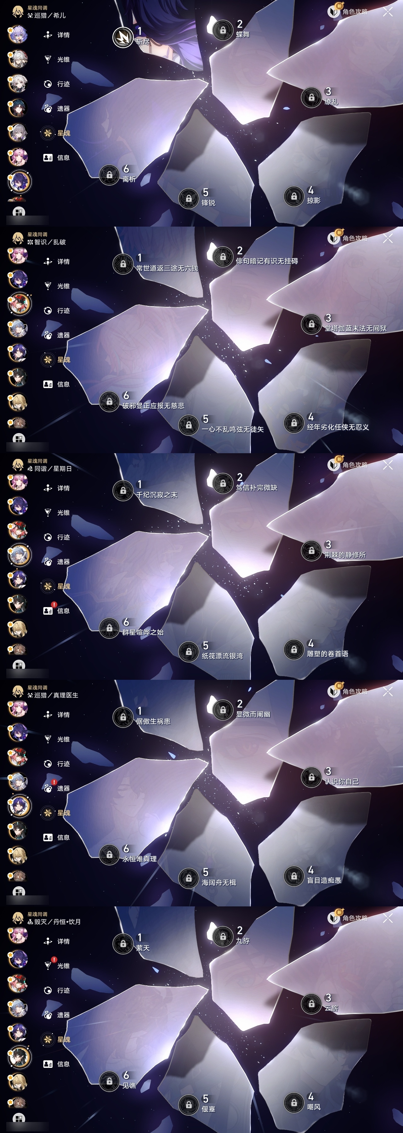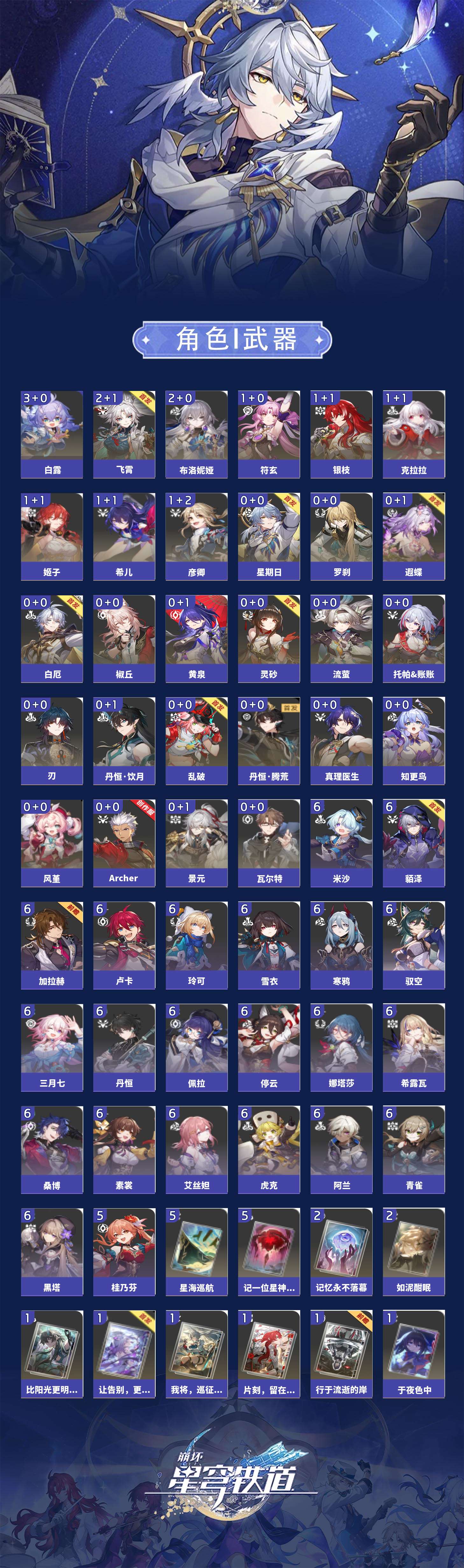 【崩坏·星穹铁道】【lyxq9582】冒险等级:70,女主,五星数量:43,五星角色:白露 3命飞霄 2命布洛妮娅 2命希儿 1命姬子 1命彦卿 1命克拉拉 1命符玄 1命银枝 1命椒丘景元灵砂瓦尔特乱破星期日罗刹刃丹恒·饮月遐蝶托帕账账真理医生黄泉风堇知更鸟白厄archer丹恒·腾荒流萤__五星光锥:星海巡航 5精记一位星神的陨落 5精如泥酣眠 2精记忆永不落幕 2精制胜的瞬间制胜的瞬间银河铁道之夜无可取代的东西于夜色中拂晓之前我将,巡征追猎比阳光更明亮的让告别,更美一些片刻,留在眼底行于流逝的岸__四星角色:阿兰 6命娜塔莎 6命虎克 6命貊泽 6命黑塔 6命丹恒 6命艾丝妲 6命希露瓦 6命停云 6命素裳 6命桑博 6命三月七 6命青雀 6命佩拉 6命驭空 6命卢卡 6命玲可 6命寒鸦 6命雪衣 6命米沙 6命加拉赫 6命桂乃芬 5命21飞宵追击队,记忆队,白厄队