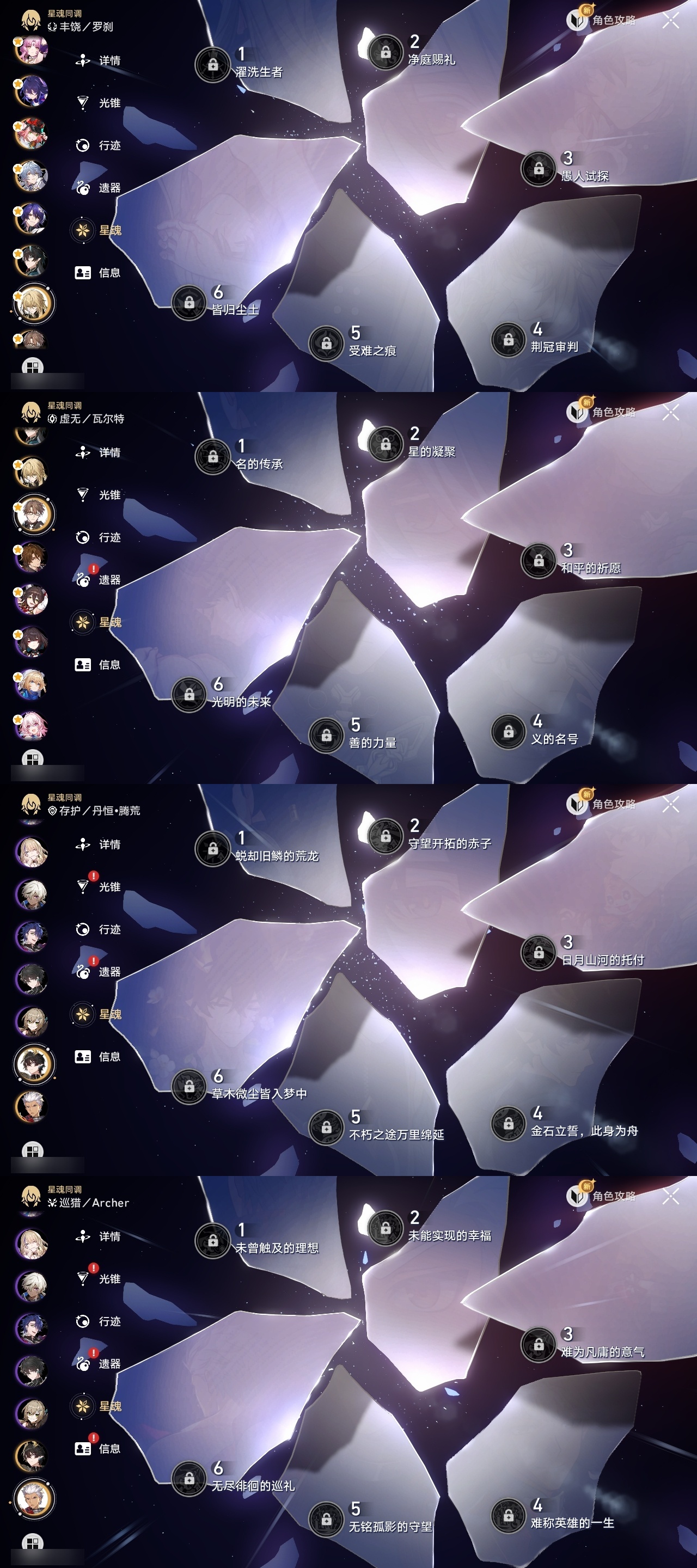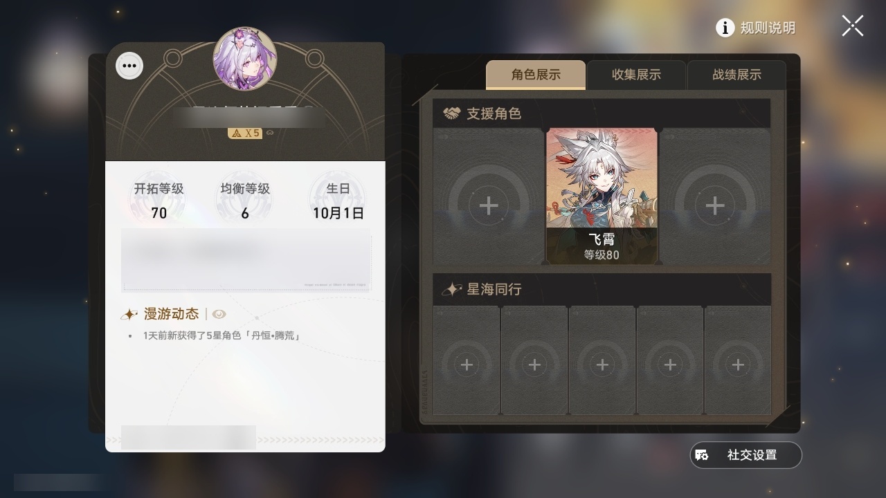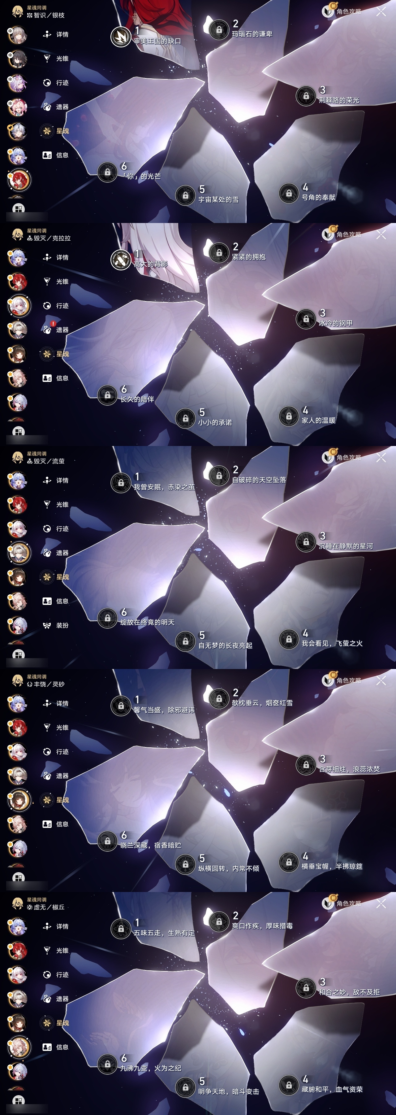 【崩坏·星穹铁道】【lyxq9582】冒险等级:70,女主,五星数量:43,五星角色:白露 3命飞霄 2命布洛妮娅 2命希儿 1命姬子 1命彦卿 1命克拉拉 1命符玄 1命银枝 1命椒丘景元灵砂瓦尔特乱破星期日罗刹刃丹恒·饮月遐蝶托帕账账真理医生黄泉风堇知更鸟白厄archer丹恒·腾荒流萤__五星光锥:星海巡航 5精记一位星神的陨落 5精如泥酣眠 2精记忆永不落幕 2精制胜的瞬间制胜的瞬间银河铁道之夜无可取代的东西于夜色中拂晓之前我将,巡征追猎比阳光更明亮的让告别,更美一些片刻,留在眼底行于流逝的岸__四星角色:阿兰 6命娜塔莎 6命虎克 6命貊泽 6命黑塔 6命丹恒 6命艾丝妲 6命希露瓦 6命停云 6命素裳 6命桑博 6命三月七 6命青雀 6命佩拉 6命驭空 6命卢卡 6命玲可 6命寒鸦 6命雪衣 6命米沙 6命加拉赫 6命桂乃芬 5命21飞宵追击队,记忆队,白厄队