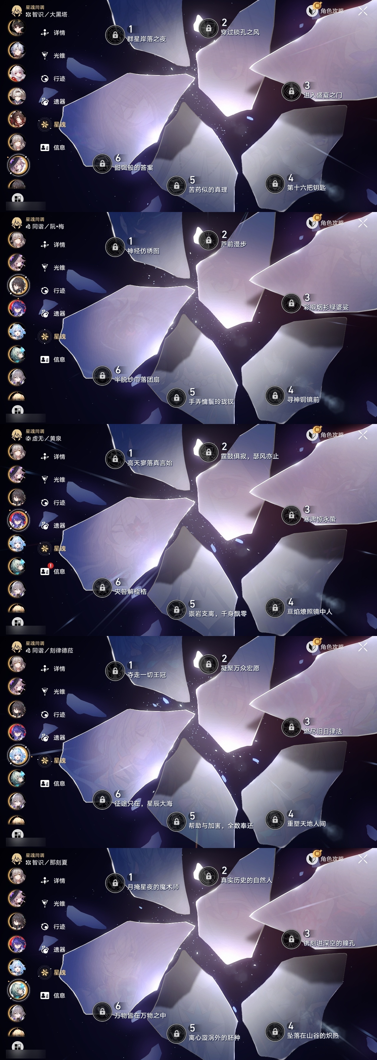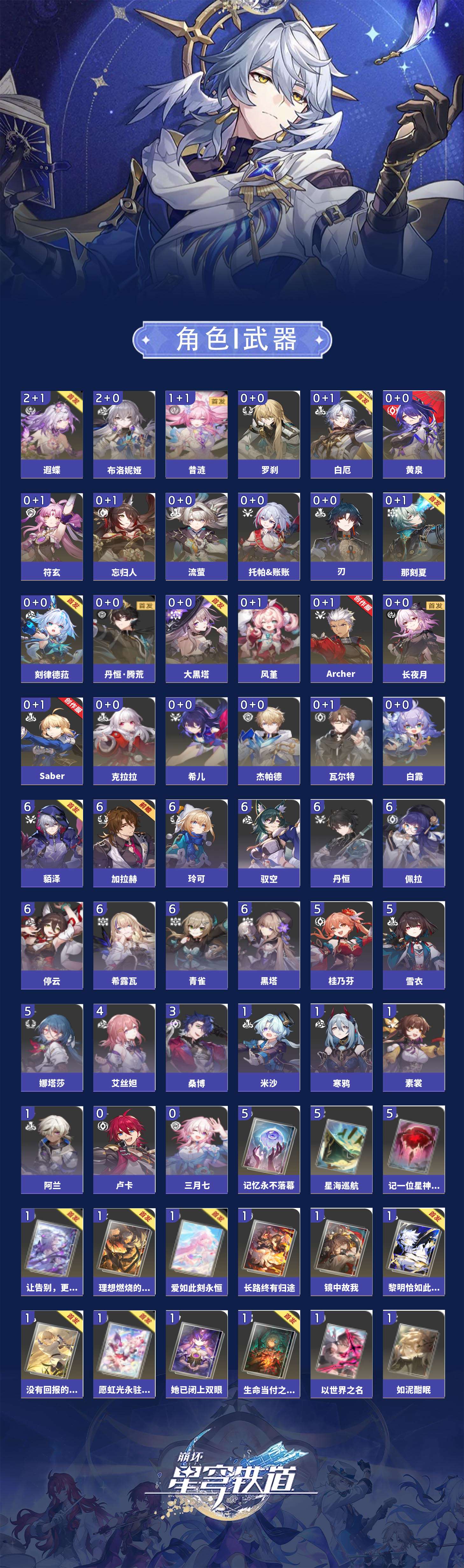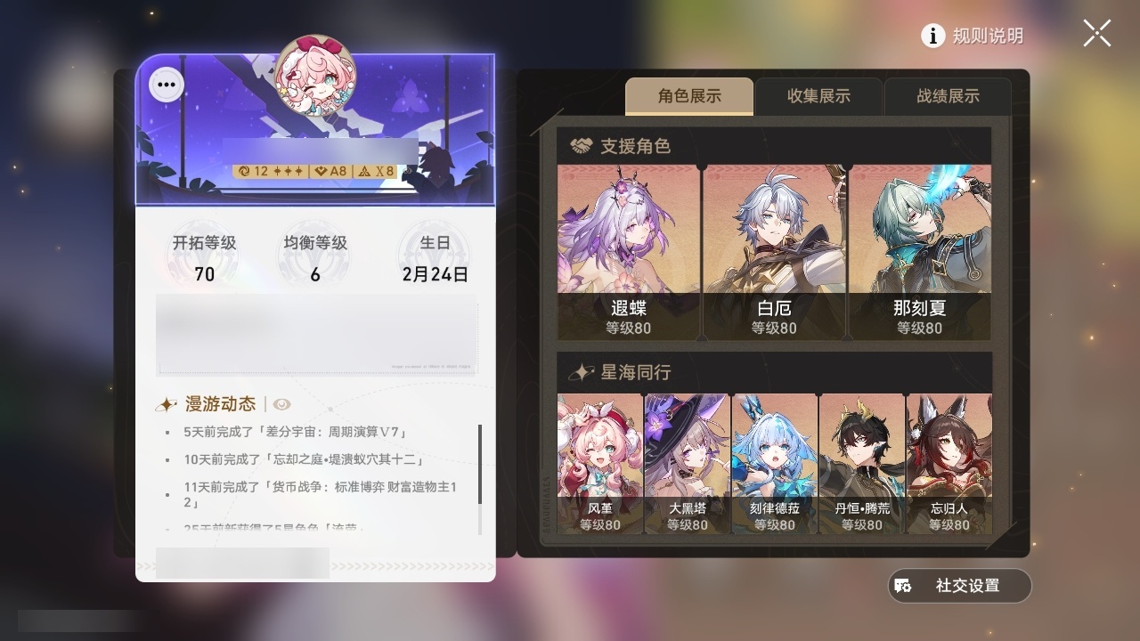 【崩坏·星穹铁道】【lyxq9603】冒险等级:70,女主,五星数量:39,五星角色:布洛妮娅 2命遐蝶 2命昔涟 1命希儿白露杰帕德瓦尔特克拉拉大黑塔忘归人罗刹刃符玄托帕账账那刻夏黄泉风堇白厄saberarcher刻律德菈长夜月丹恒·腾荒流萤__五星光锥:星海巡航 5精记一位星神的陨落 5精记忆永不落幕 5精以世界之名如泥酣眠长路终有归途她已闭上双眼让告别,更美一些镜中故我生命当付之一炬愿虹光永驻天空黎明恰如此燃烧理想燃烧的地狱没有回报的加冕爱如此刻永恒__四星角色:貊泽 6命黑塔 6命丹恒 6命希露瓦 6命停云 6命青雀 6命佩拉 6命驭空 6命玲可 6命加拉赫 6命娜塔莎 5命桂乃芬 5命雪衣 5命艾丝妲 4命桑博 3命阿兰 1命素裳 1命寒鸦 1命米沙 1命三月七卢卡