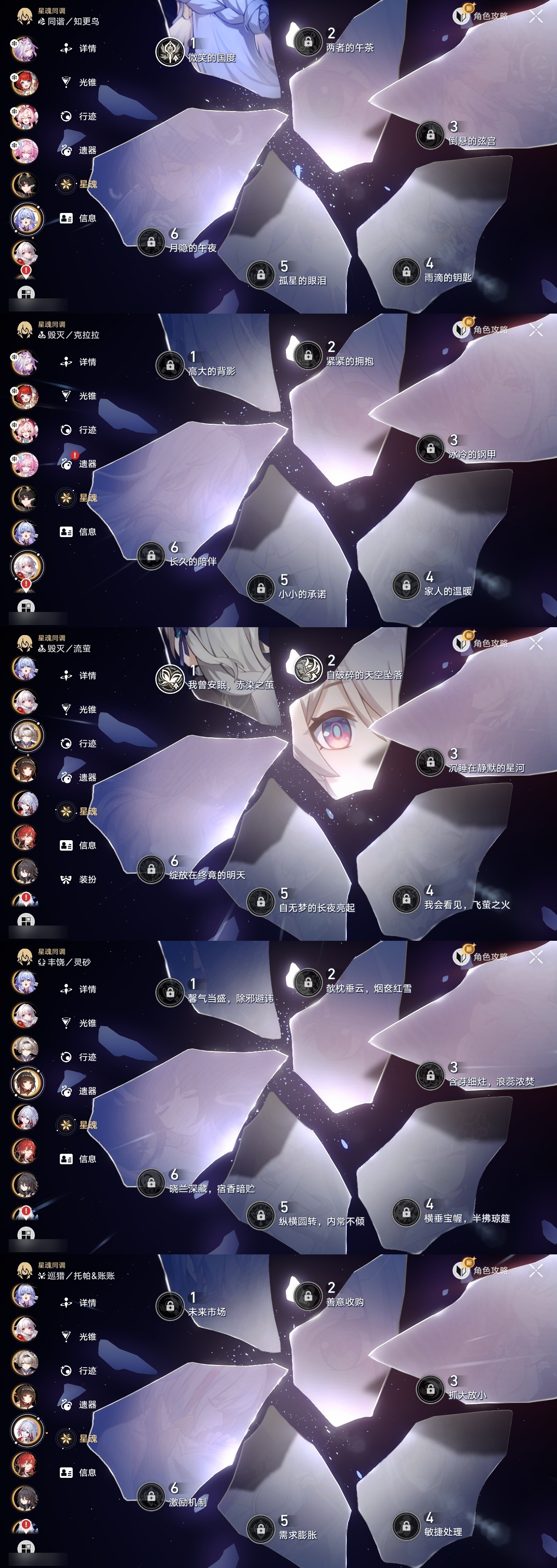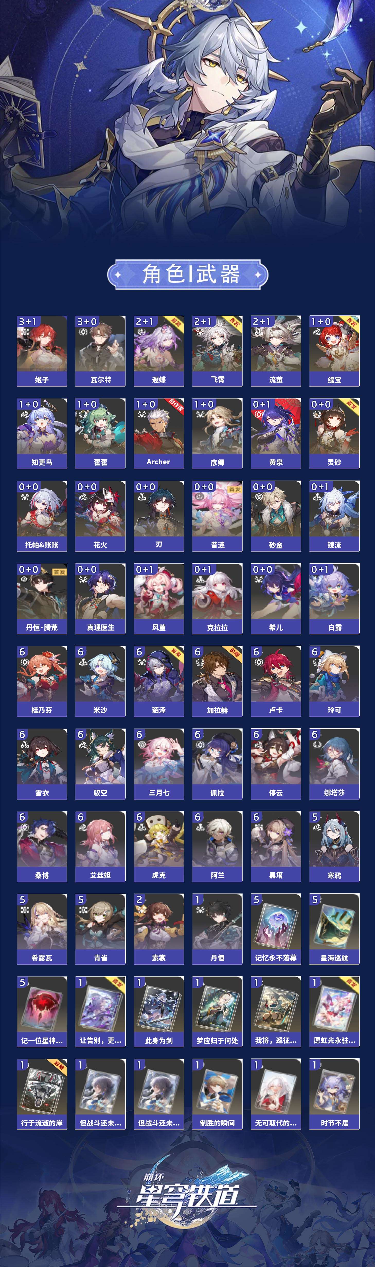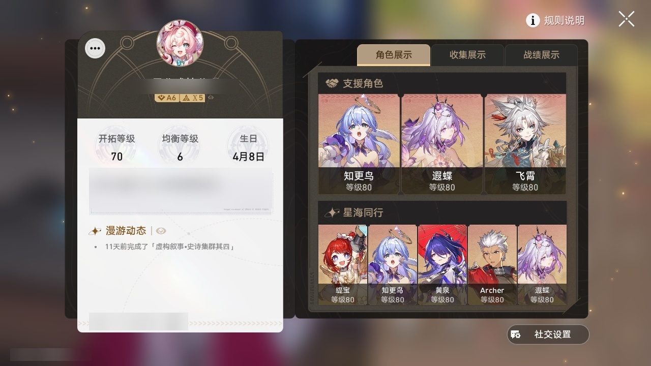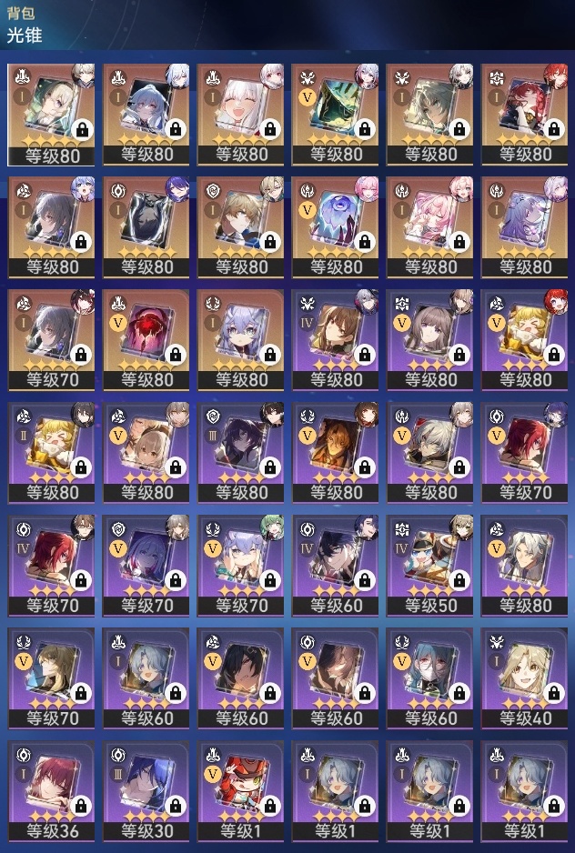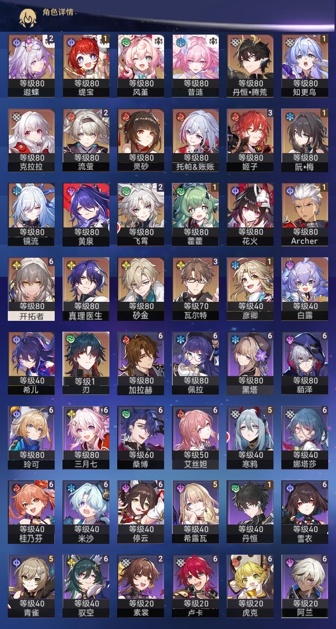 【崩坏·星穹铁道】【lyxq9596】冒险等级:70,女主,五星数量:39,五星角色:姬子 3命瓦尔特 3命飞霄 2命遐蝶 2命流萤 2命彦卿 1命缇宝 1命藿藿 1命知更鸟 1命archer 1命希儿白露灵砂克拉拉刃镜流托帕账账真理医生花火黄泉风堇砂金丹恒·腾荒昔涟__五星光锥:星海巡航 5精记一位星神的陨落 5精记忆永不落幕 5精制胜的瞬间银河铁道之夜无可取代的东西时节不居但战斗还未结束但战斗还未结束我将,巡征追猎让告别,更美一些此身为剑行于流逝的岸愿虹光永驻天空梦应归于何处__四星角色:阿兰 6命娜塔莎 6命虎克 6命貊泽 6命黑塔 6命艾丝妲 6命停云 6命桑博 6命三月七 6命佩拉 6命驭空 6命卢卡 6命玲可 6命桂乃芬 6命雪衣 6命米沙 6命加拉赫 6命希露瓦 5命青雀 5命寒鸦 5命素裳 2命丹恒 1命
