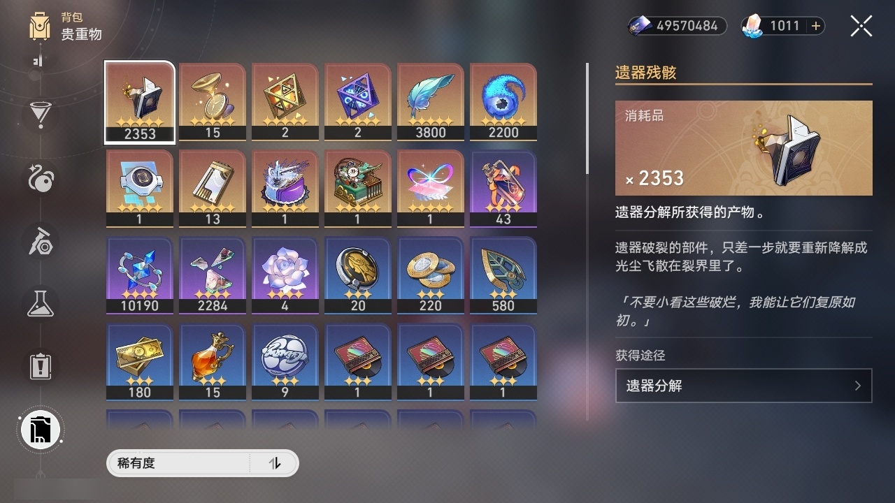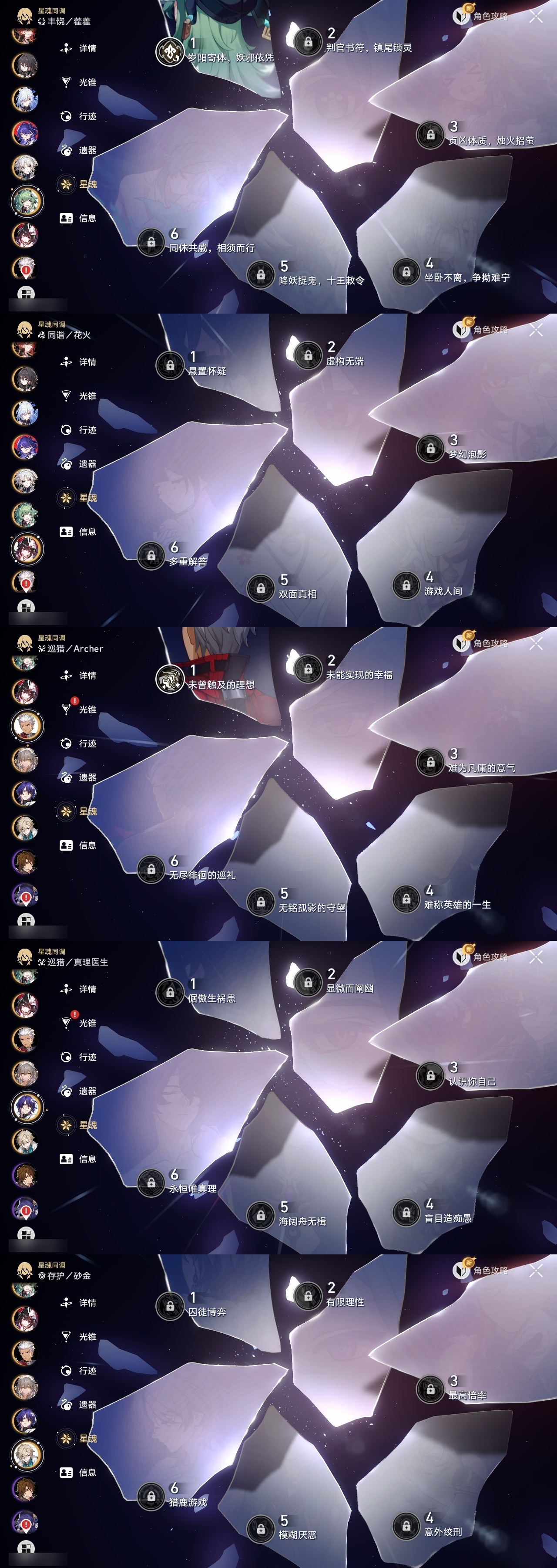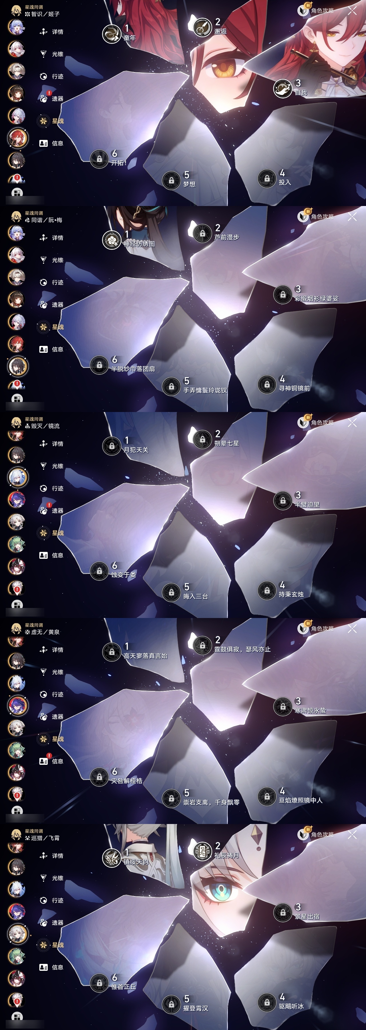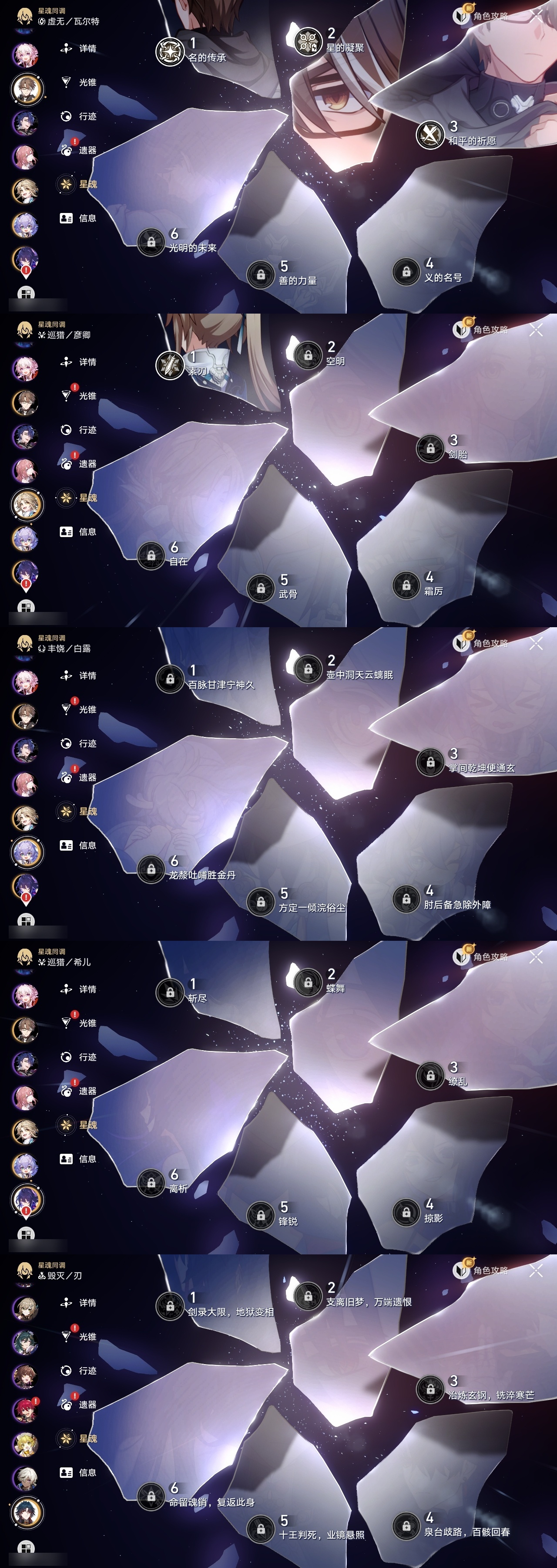 【崩坏·星穹铁道】【lyxq9596】冒险等级:70,女主,五星数量:39,五星角色:姬子 3命瓦尔特 3命飞霄 2命遐蝶 2命流萤 2命彦卿 1命缇宝 1命藿藿 1命知更鸟 1命archer 1命希儿白露灵砂克拉拉刃镜流托帕账账真理医生花火黄泉风堇砂金丹恒·腾荒昔涟__五星光锥:星海巡航 5精记一位星神的陨落 5精记忆永不落幕 5精制胜的瞬间银河铁道之夜无可取代的东西时节不居但战斗还未结束但战斗还未结束我将,巡征追猎让告别,更美一些此身为剑行于流逝的岸愿虹光永驻天空梦应归于何处__四星角色:阿兰 6命娜塔莎 6命虎克 6命貊泽 6命黑塔 6命艾丝妲 6命停云 6命桑博 6命三月七 6命佩拉 6命驭空 6命卢卡 6命玲可 6命桂乃芬 6命雪衣 6命米沙 6命加拉赫 6命希露瓦 5命青雀 5命寒鸦 5命素裳 2命丹恒 1命