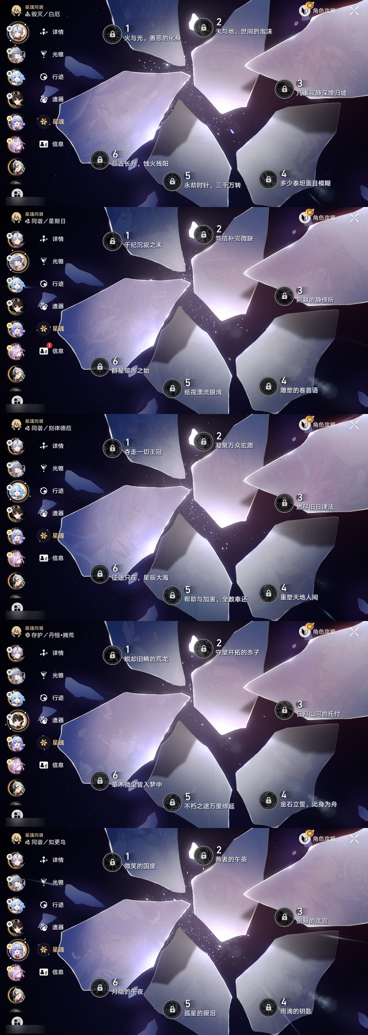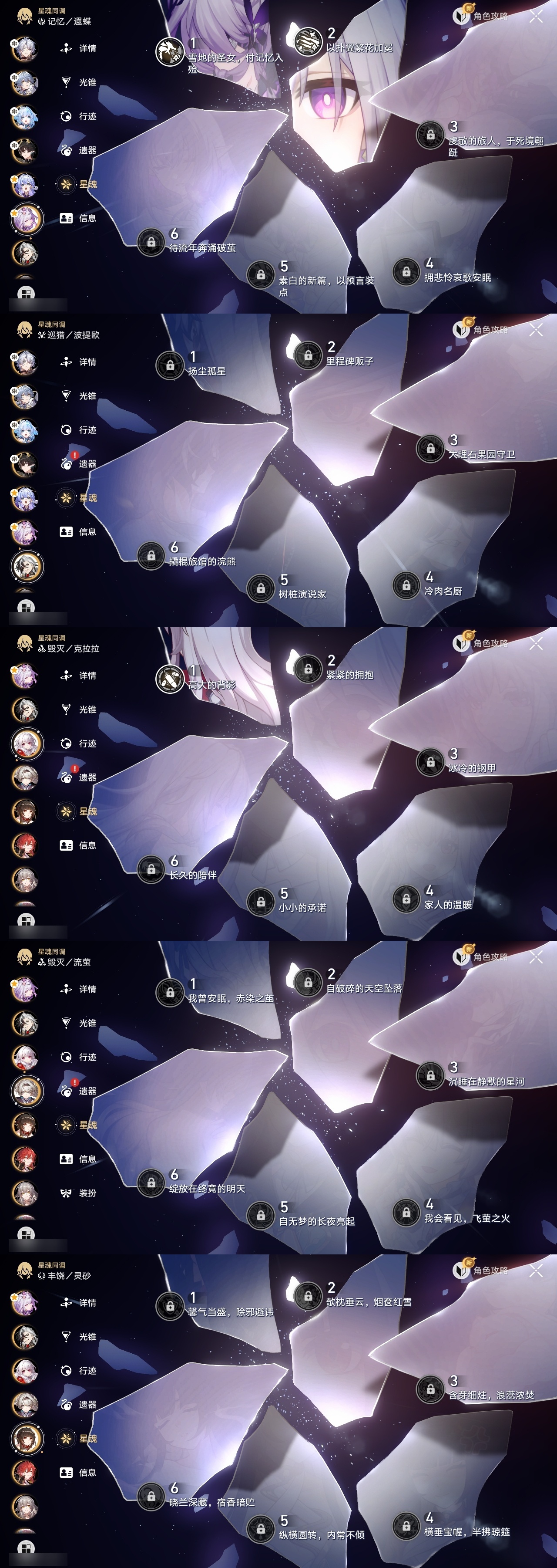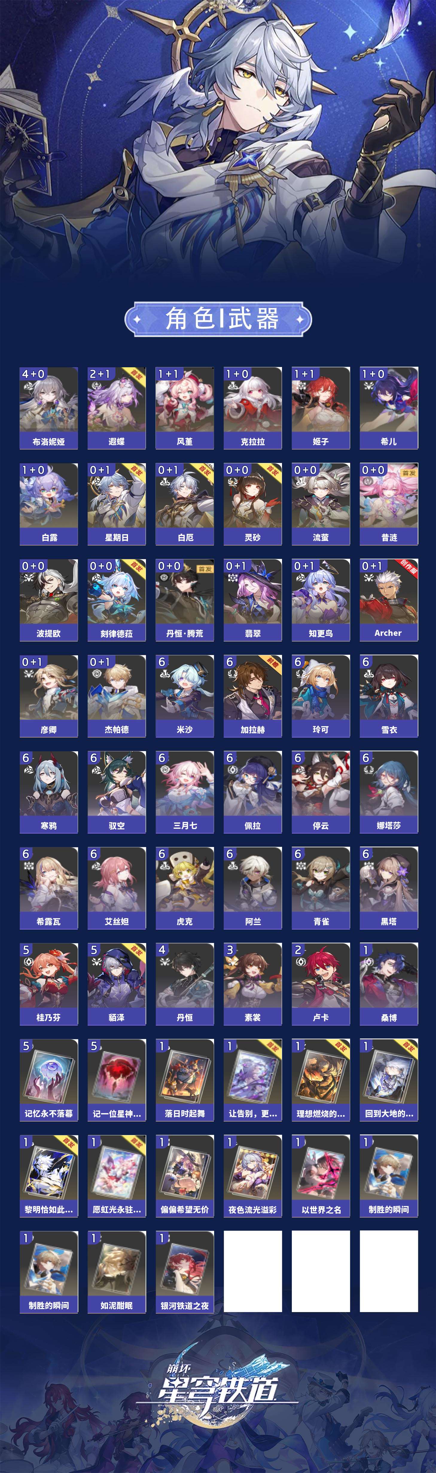 【崩坏·星穹铁道】【lyxq9594】冒险等级:70,女主,五星数量:36,五星角色:布洛妮娅 4命遐蝶 2命希儿 1命白露 1命姬子 1命克拉拉 1命风堇 1命灵砂杰帕德彦卿星期日知更鸟白厄archer刻律德菈丹恒·腾荒昔涟波提欧流萤翡翠__五星光锥:记一位星神的陨落 5精不息的演算 5精记忆永不落幕 5精落日时起舞制胜的瞬间制胜的瞬间银河铁道之夜以世界之名如泥酣眠回到大地的飞行让告别,更美一些愿虹光永驻天空夜色流光溢彩黎明恰如此燃烧理想燃烧的地狱偏偏希望无价__四星角色:阿兰 6命娜塔莎 6命虎克 6命黑塔 6命艾丝妲 6命希露瓦 6命停云 6命三月七 6命青雀 6命佩拉 6命驭空 6命玲可 6命寒鸦 6命雪衣 6命米沙 6命加拉赫 6命貊泽 5命桂乃芬 5命丹恒 4命素裳 3命卢卡 2命桑博 1命