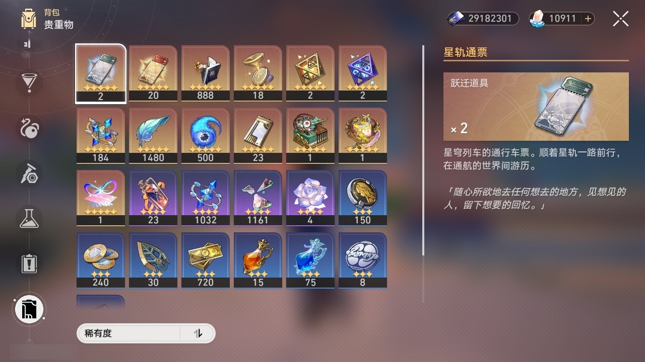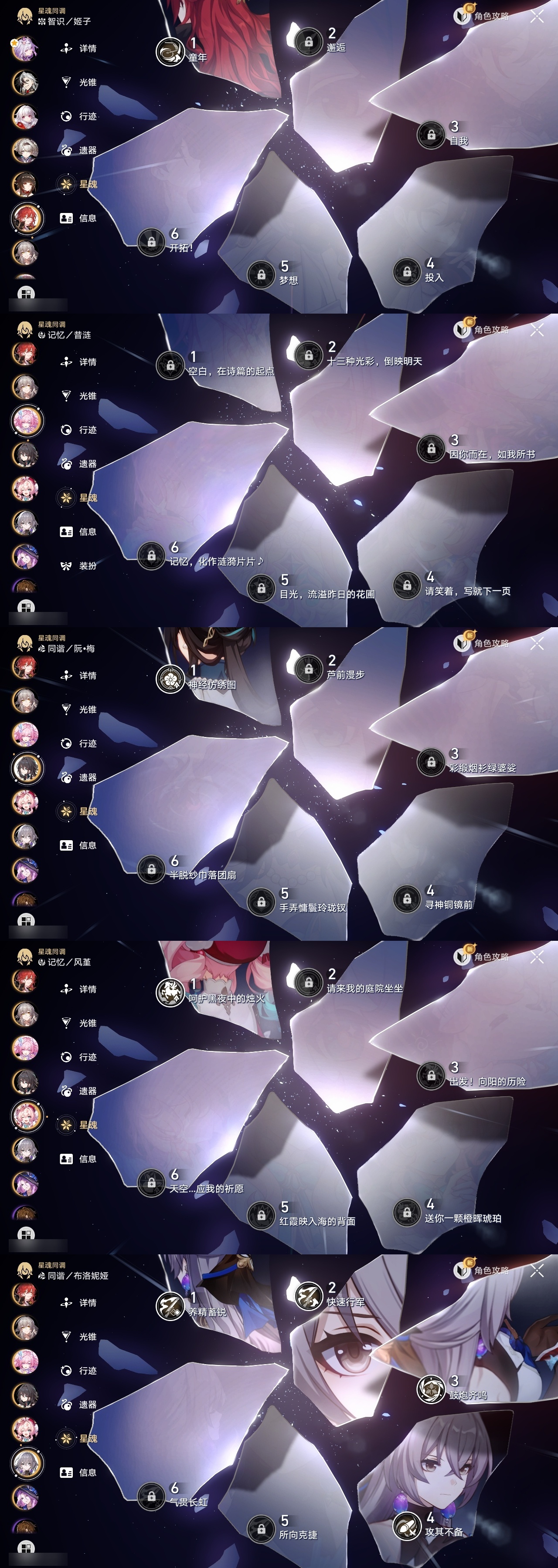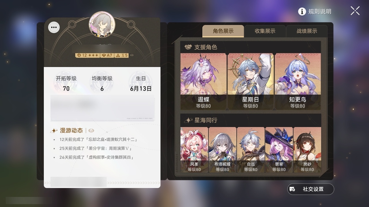 【崩坏·星穹铁道】【lyxq9594】冒险等级:70,女主,五星数量:36,五星角色:布洛妮娅 4命遐蝶 2命希儿 1命白露 1命姬子 1命克拉拉 1命风堇 1命灵砂杰帕德彦卿星期日知更鸟白厄archer刻律德菈丹恒·腾荒昔涟波提欧流萤翡翠__五星光锥:记一位星神的陨落 5精不息的演算 5精记忆永不落幕 5精落日时起舞制胜的瞬间制胜的瞬间银河铁道之夜以世界之名如泥酣眠回到大地的飞行让告别,更美一些愿虹光永驻天空夜色流光溢彩黎明恰如此燃烧理想燃烧的地狱偏偏希望无价__四星角色:阿兰 6命娜塔莎 6命虎克 6命黑塔 6命艾丝妲 6命希露瓦 6命停云 6命三月七 6命青雀 6命佩拉 6命驭空 6命玲可 6命寒鸦 6命雪衣 6命米沙 6命加拉赫 6命貊泽 5命桂乃芬 5命丹恒 4命素裳 3命卢卡 2命桑博 1命