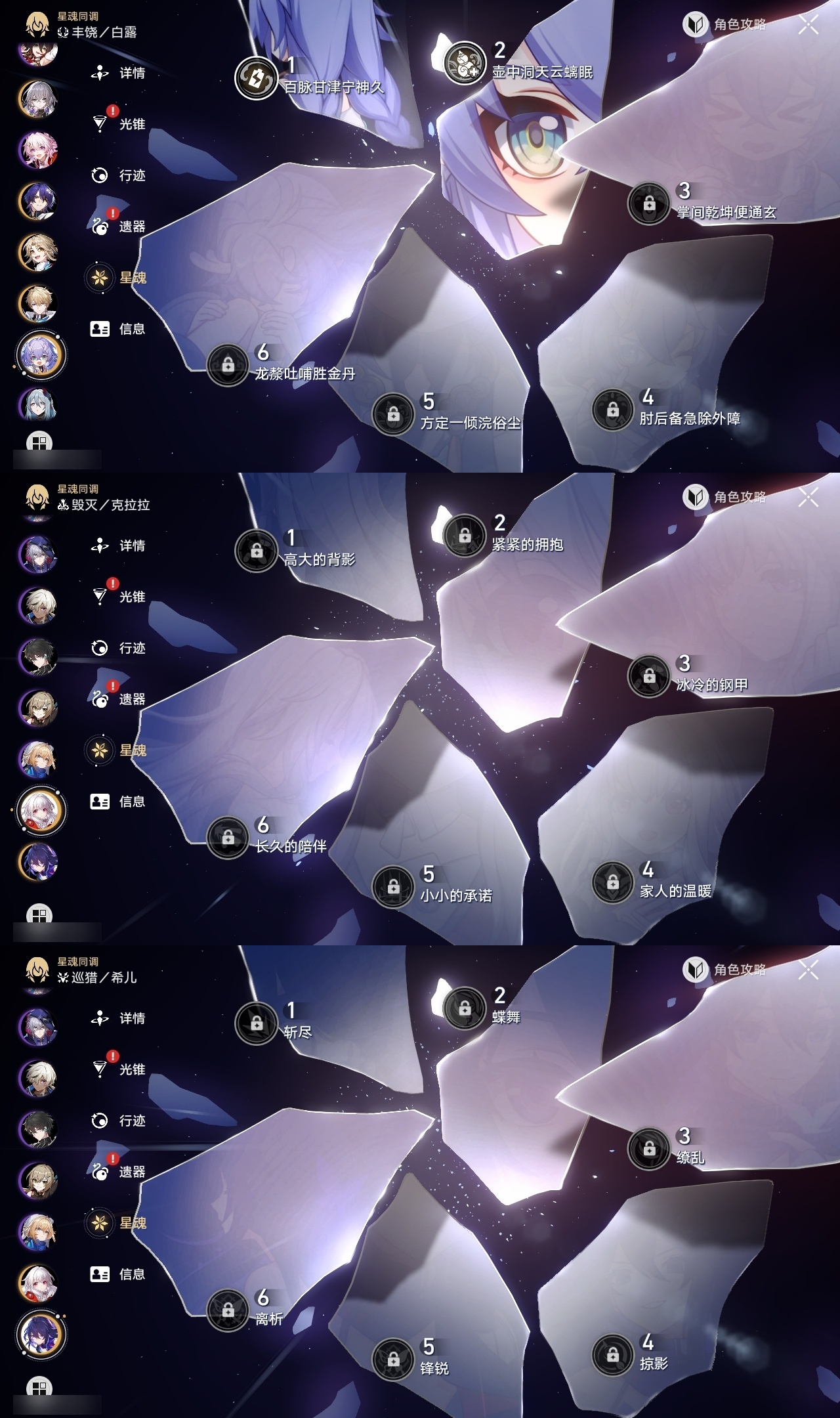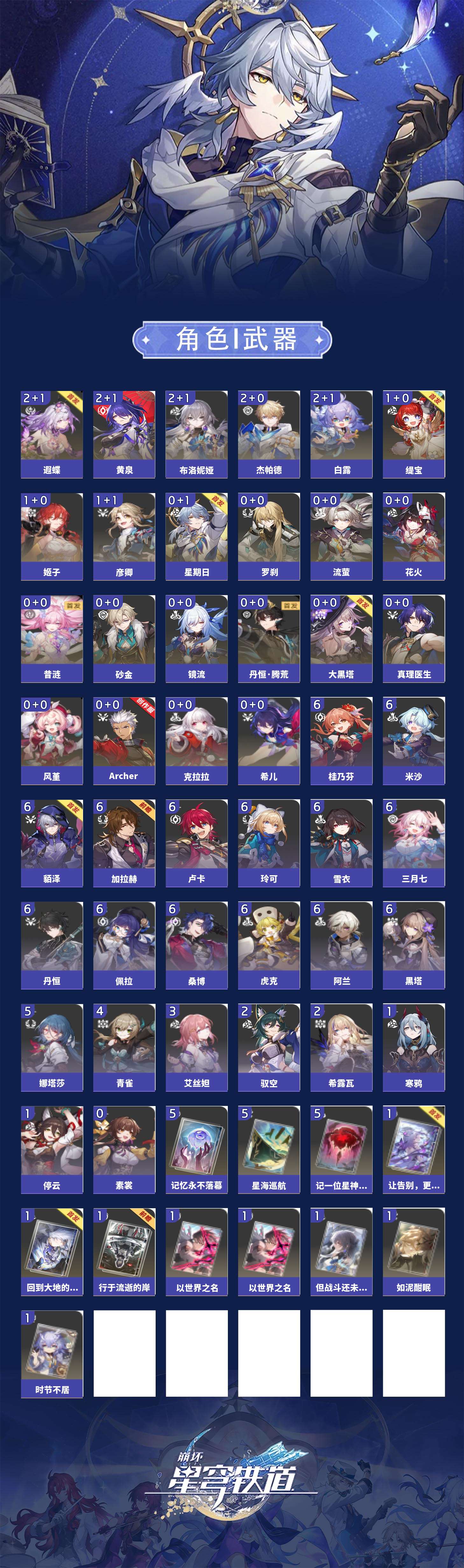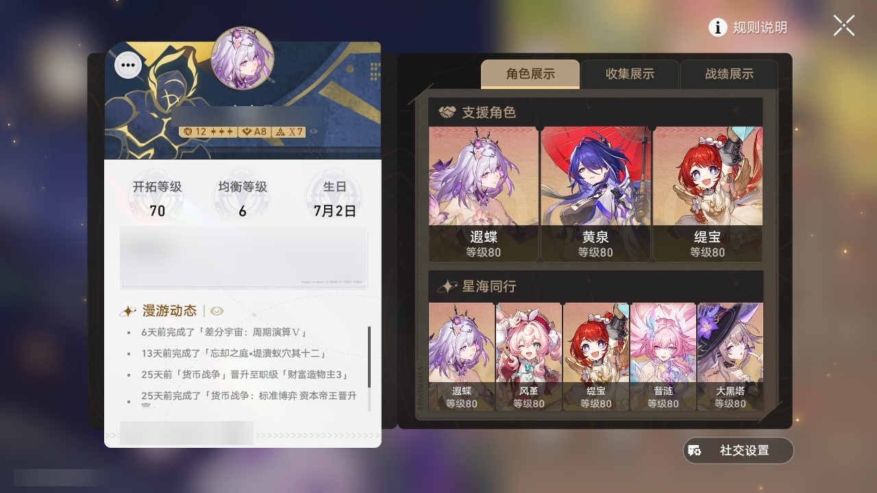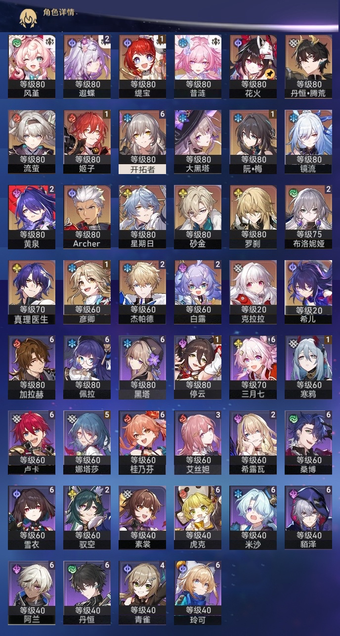 【崩坏·星穹铁道】【lyxq9635】冒险等级:70,女主,五星数量:34,五星角色:白露 2命布洛妮娅 2命杰帕德 2命遐蝶 2命黄泉 2命姬子 1命彦卿 1命缇宝 1命希儿克拉拉星期日大黑塔罗刹镜流真理医生花火风堇砂金archer丹恒·腾荒昔涟流萤__五星光锥:星海巡航 5精记一位星神的陨落 5精不息的演算 5精记忆永不落幕 5精以世界之名以世界之名时节不居如泥酣眠但战斗还未结束回到大地的飞行让告别,更美一些行于流逝的岸__四星角色:阿兰 6命虎克 6命貊泽 6命黑塔 6命丹恒 6命桑博 6命三月七 6命佩拉 6命卢卡 6命玲可 6命桂乃芬 6命雪衣 6命米沙 6命加拉赫 6命娜塔莎 5命青雀 4命艾丝妲 3命希露瓦 2命驭空 2命停云 1命寒鸦 1命素裳