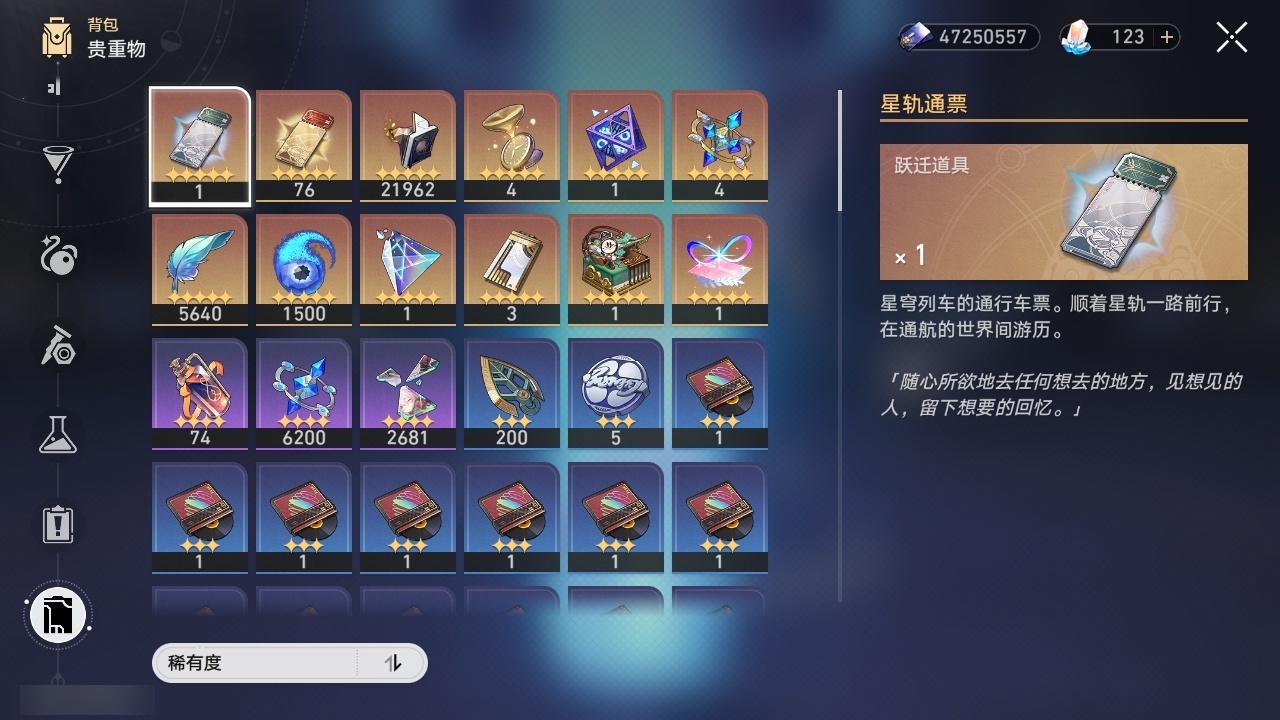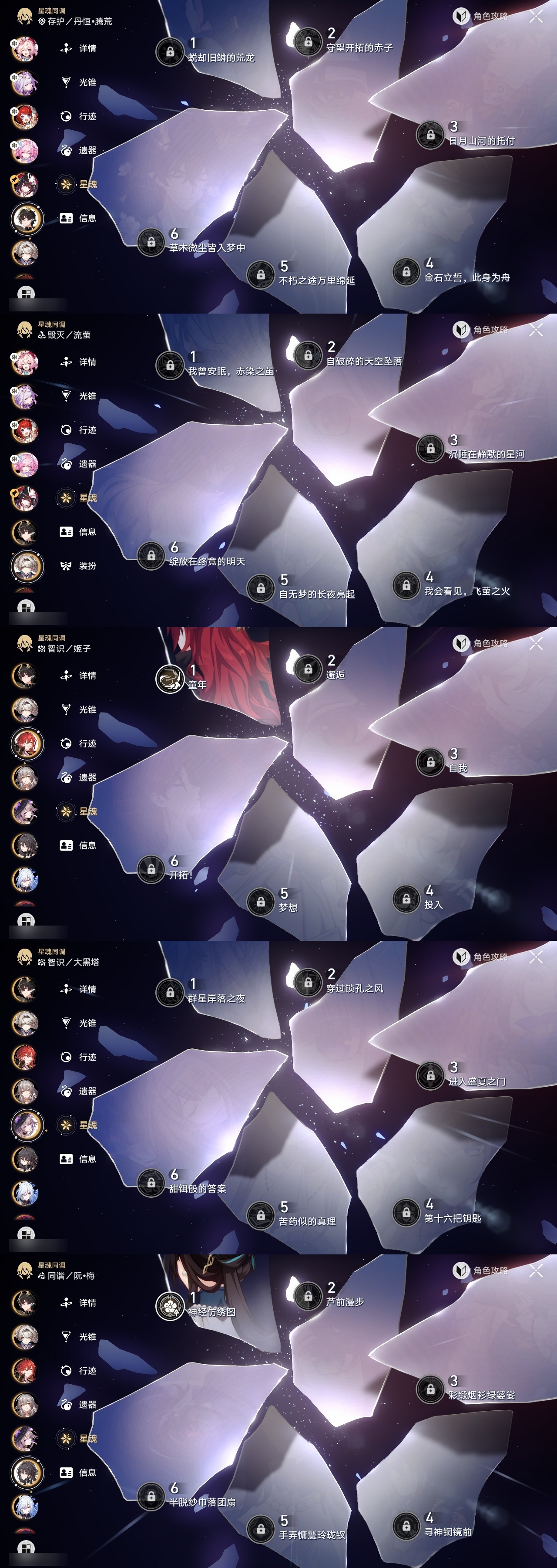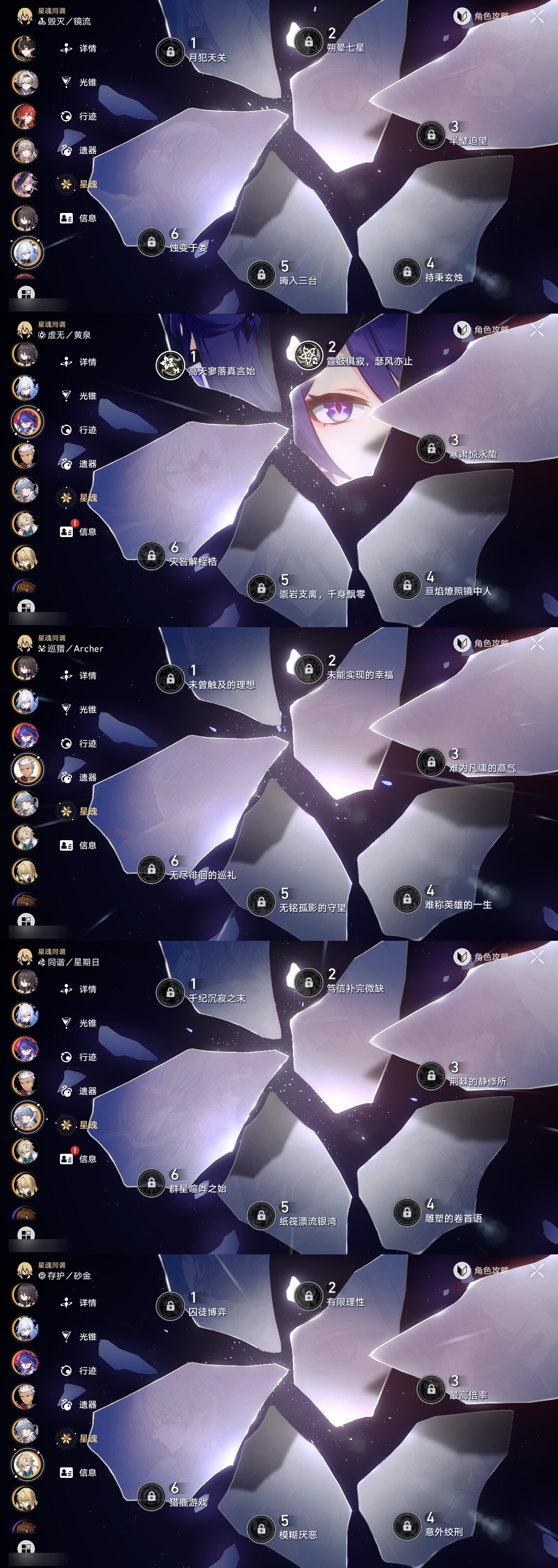 【崩坏·星穹铁道】【lyxq9635】冒险等级:70,女主,五星数量:34,五星角色:白露 2命布洛妮娅 2命杰帕德 2命遐蝶 2命黄泉 2命姬子 1命彦卿 1命缇宝 1命希儿克拉拉星期日大黑塔罗刹镜流真理医生花火风堇砂金archer丹恒·腾荒昔涟流萤__五星光锥:星海巡航 5精记一位星神的陨落 5精不息的演算 5精记忆永不落幕 5精以世界之名以世界之名时节不居如泥酣眠但战斗还未结束回到大地的飞行让告别,更美一些行于流逝的岸__四星角色:阿兰 6命虎克 6命貊泽 6命黑塔 6命丹恒 6命桑博 6命三月七 6命佩拉 6命卢卡 6命玲可 6命桂乃芬 6命雪衣 6命米沙 6命加拉赫 6命娜塔莎 5命青雀 4命艾丝妲 3命希露瓦 2命驭空 2命停云 1命寒鸦 1命素裳