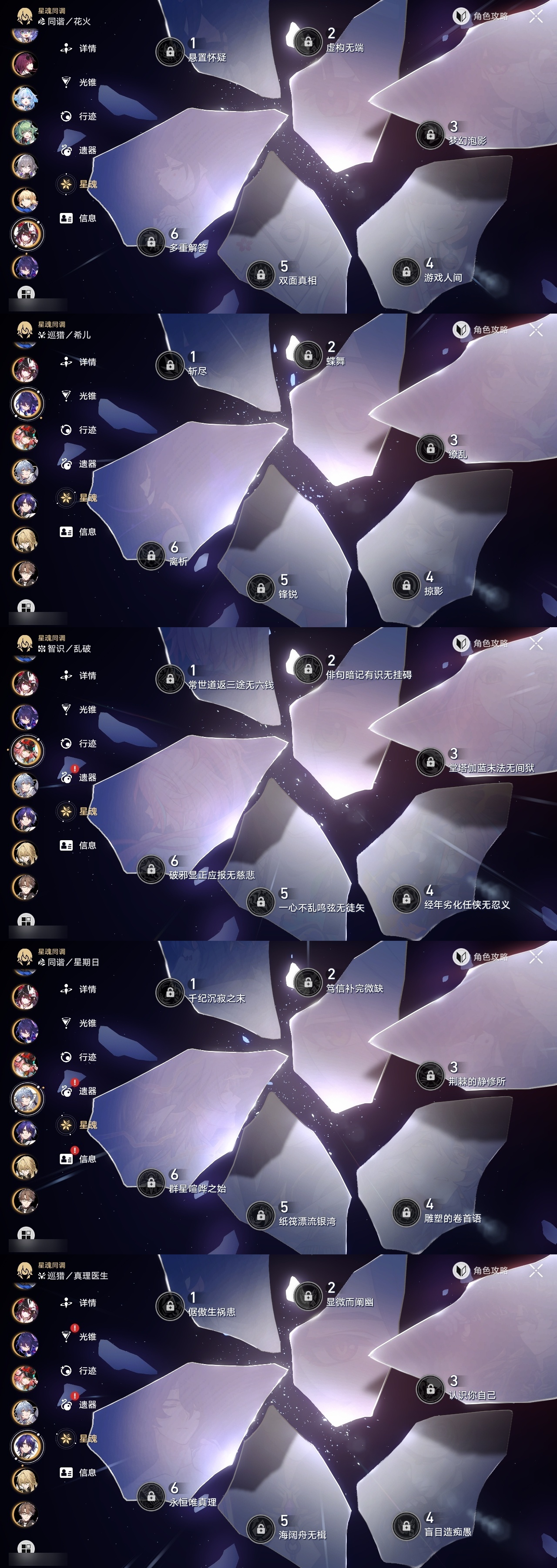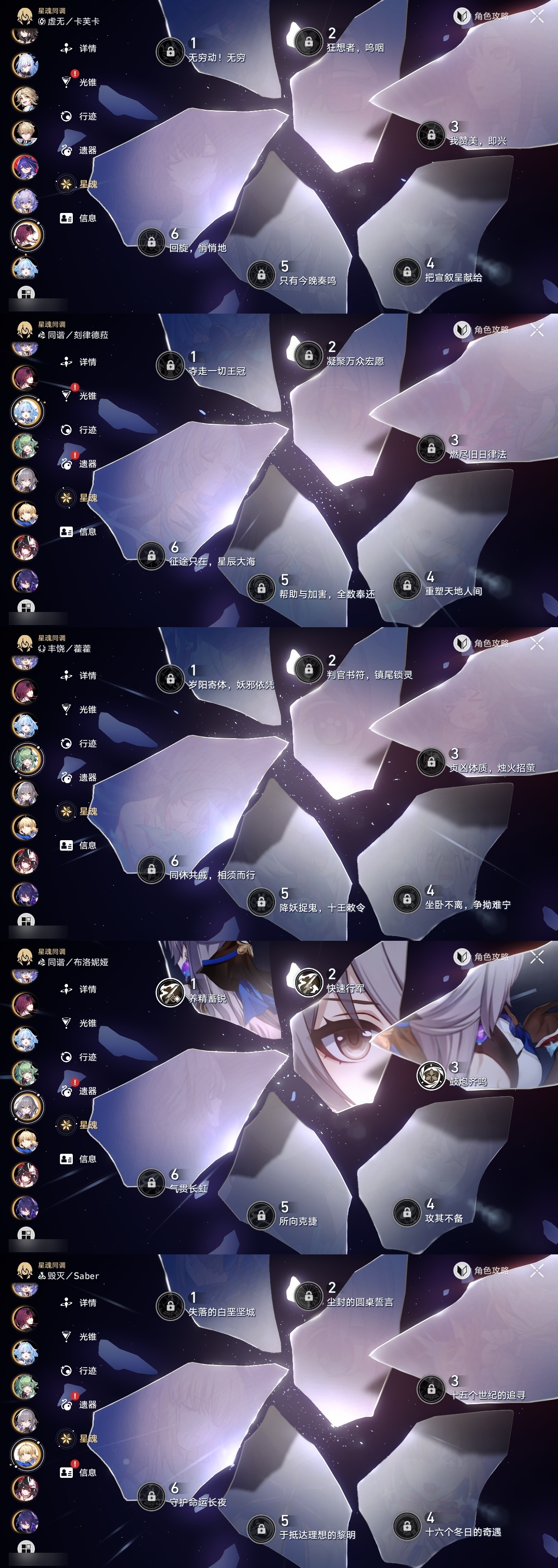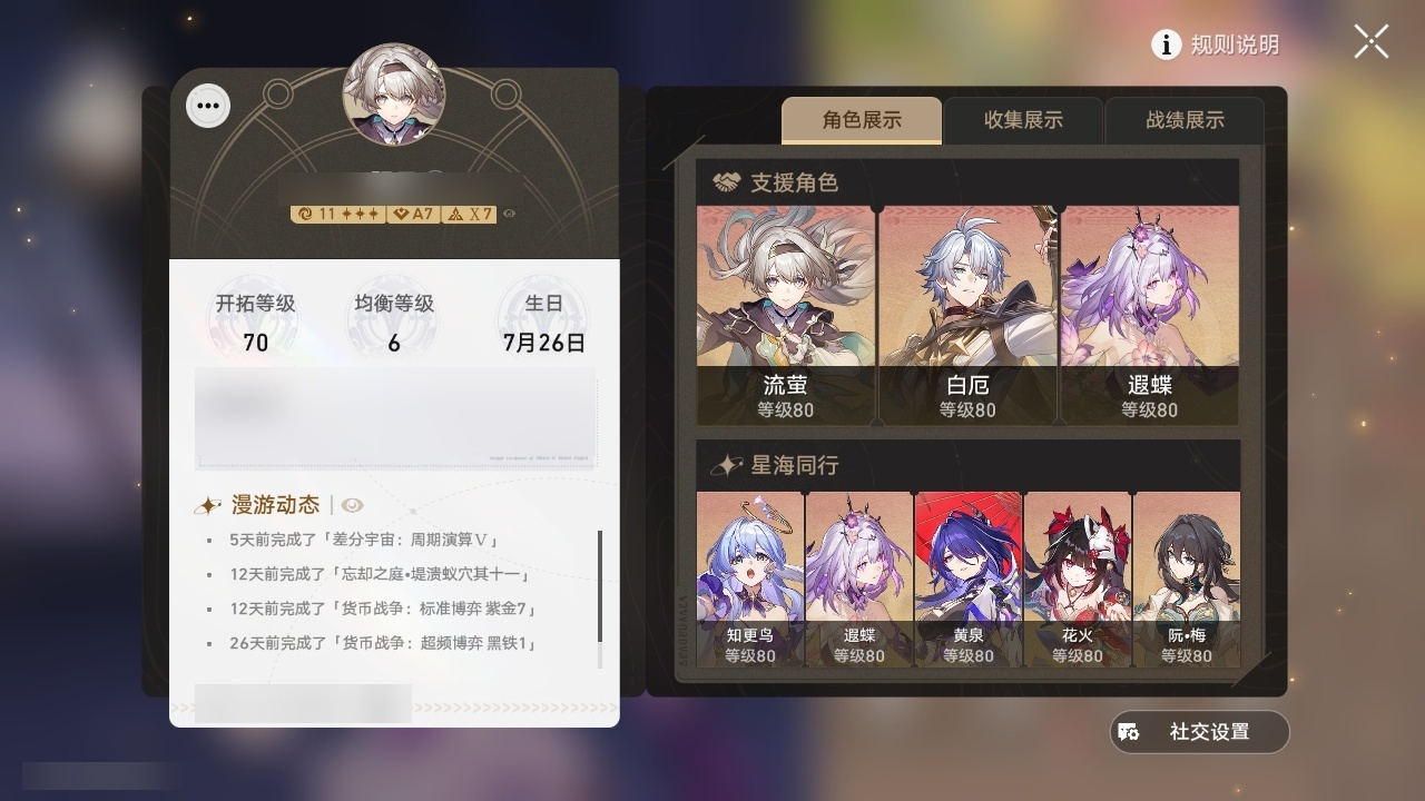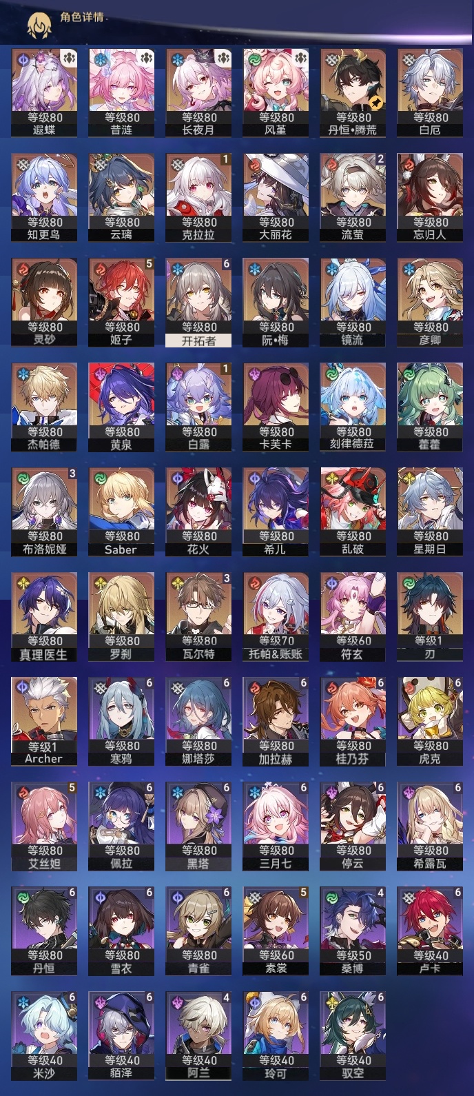 【崩坏·星穹铁道】【lyxq9627】冒险等级:70,女主,五星数量:48,五星角色:姬子 5命布洛妮娅 3命瓦尔特 3命流萤 2命白露 1命克拉拉 1命云璃希儿灵砂杰帕德彦卿乱破星期日忘归人罗刹刃卡芙卡遐蝶符玄镜流托帕账账藿藿真理医生花火黄泉风堇知更鸟白厄saberarcher刻律德菈长夜月丹恒·腾荒昔涟大丽花__五星光锥:记一位星神的陨落 5精孤独的疗愈 3精星海巡航 2精以世界之名 2精银河铁道之夜以世界之名无可取代的东西时节不居如泥酣眠不息的演算让告别,更美一些行于流逝的岸梦应归于何处__四星角色:娜塔莎 6命虎克 6命貊泽 6命黑塔 6命丹恒 6命希露瓦 6命停云 6命三月七 6命青雀 6命佩拉 6命驭空 6命卢卡 6命玲可 6命桂乃芬 6命寒鸦 6命雪衣 6命米沙 6命加拉赫 6命艾丝妲 5命素裳 5命阿兰 4命桑博 4命21流萤击破队辅助全,记忆队,白厄队