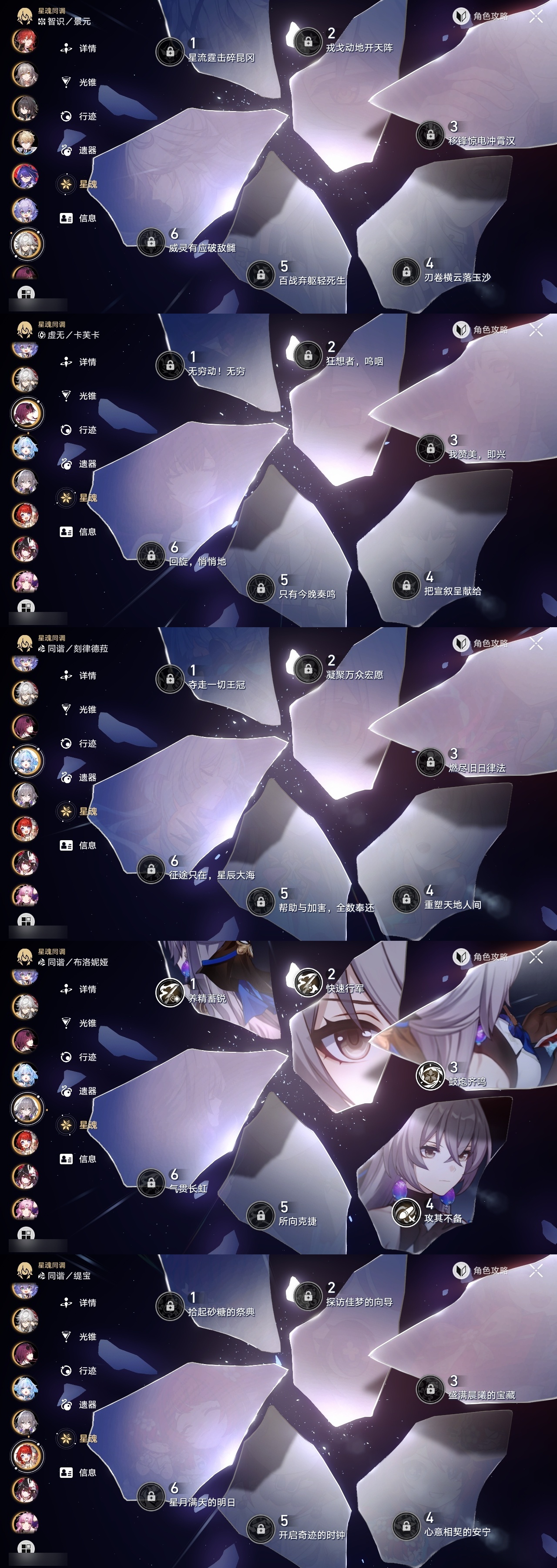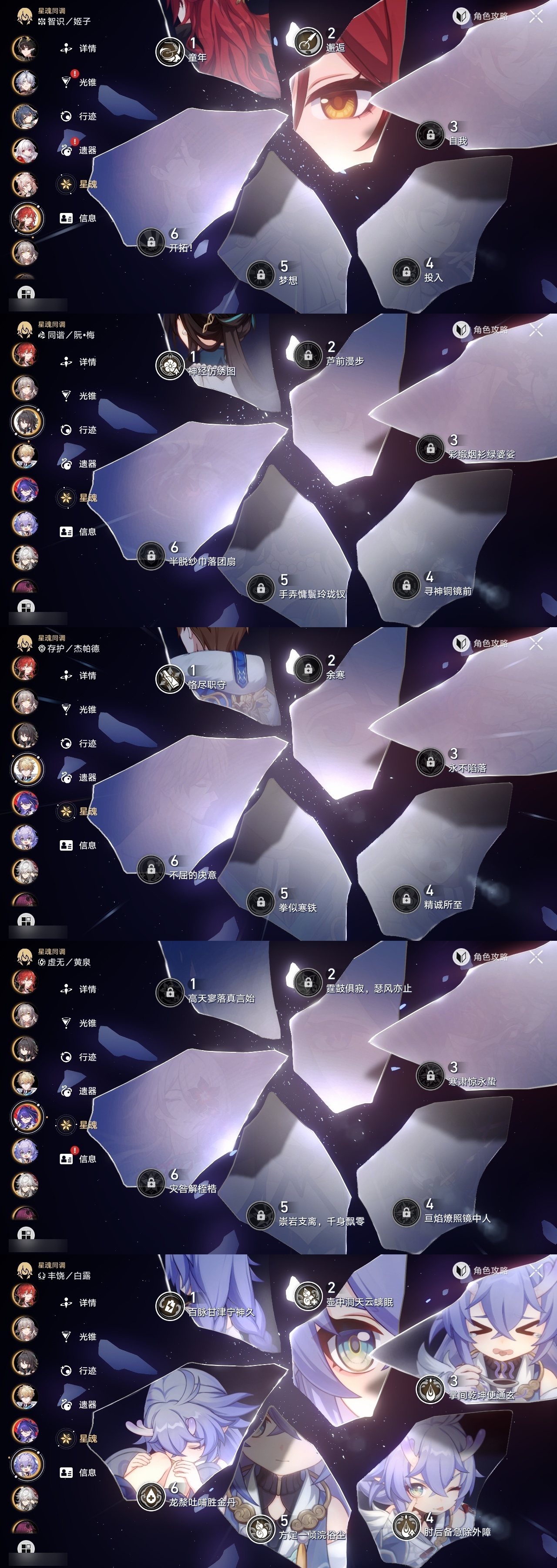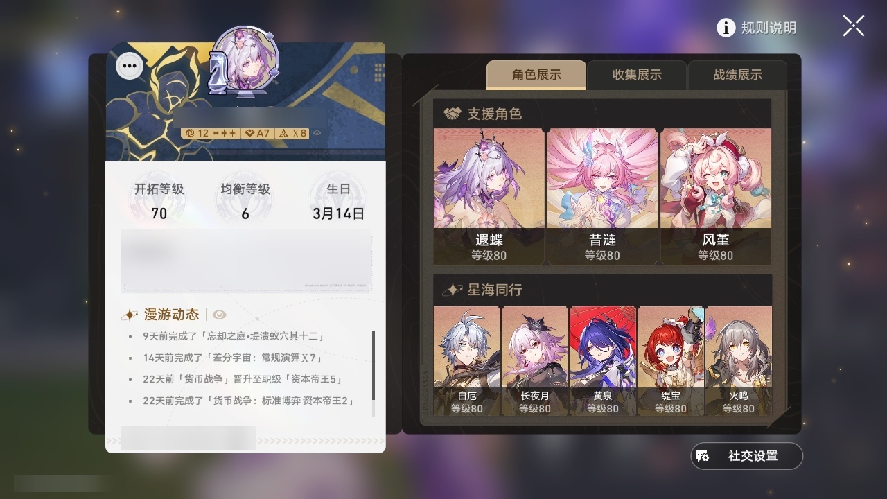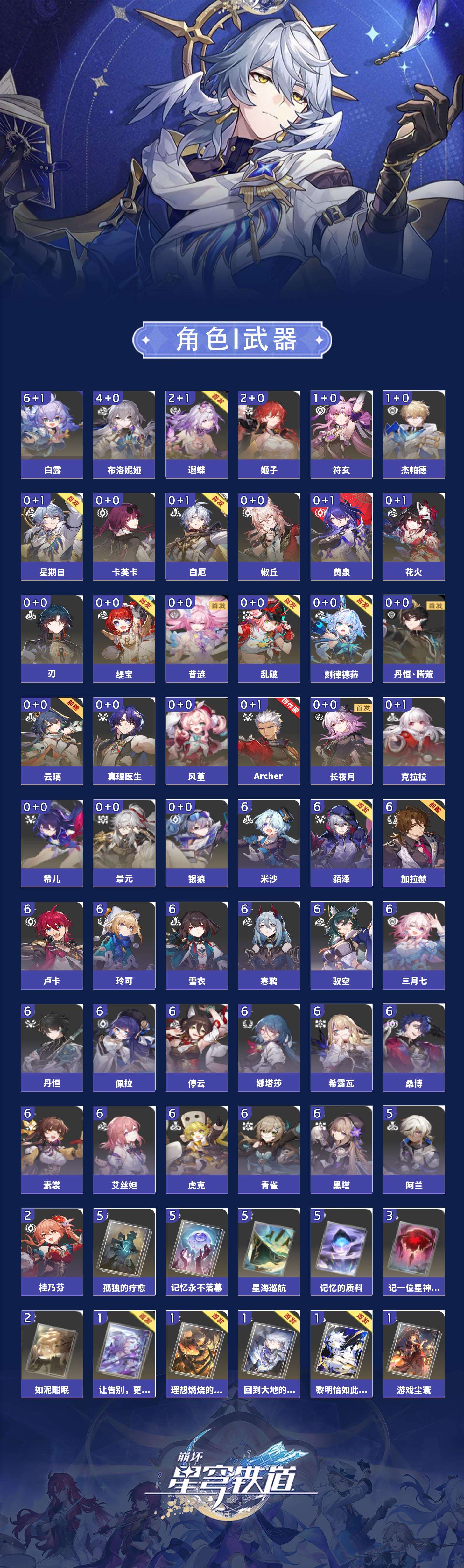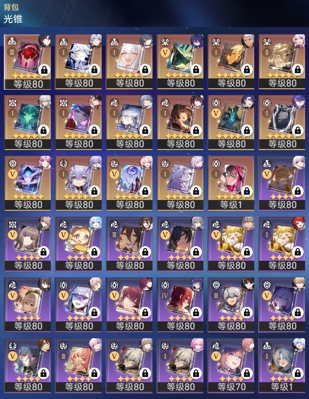 【崩坏·星穹铁道】【lyxq9648】冒险等级:70,女主,五星数量:43,五星角色:白露 6命布洛妮娅 4命姬子 2命遐蝶 2命杰帕德 1命符玄 1命云璃椒丘银狼景元希儿克拉拉乱破星期日缇宝刃卡芙卡真理医生花火黄泉风堇白厄archer刻律德菈长夜月丹恒·腾荒昔涟__五星光锥:星海巡航 5精记忆的质料 5精孤独的疗愈 5精记忆永不落幕 5精记一位星神的陨落 3精如泥酣眠 2精以世界之名无可取代的东西时节不居不息的演算回到大地的飞行让告别,更美一些游戏尘寰行于流逝的岸黎明恰如此燃烧理想燃烧的地狱__四星角色:娜塔莎 6命虎克 6命貊泽 6命黑塔 6命丹恒 6命艾丝妲 6命希露瓦 6命停云 6命素裳 6命桑博 6命三月七 6命青雀 6命佩拉 6命驭空 6命卢卡 6命玲可 6命寒鸦 6命雪衣 6命米沙 6命加拉赫 6命阿兰 5命桂乃芬 2命