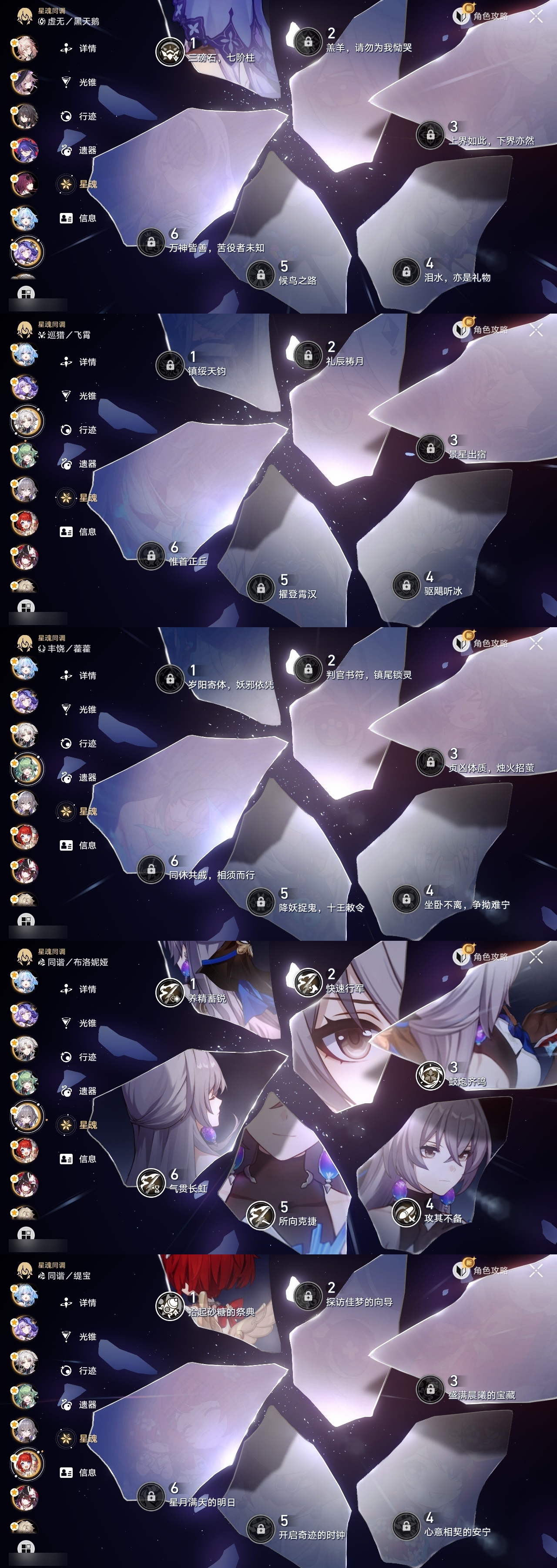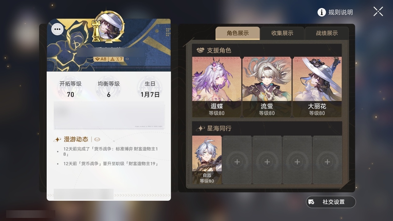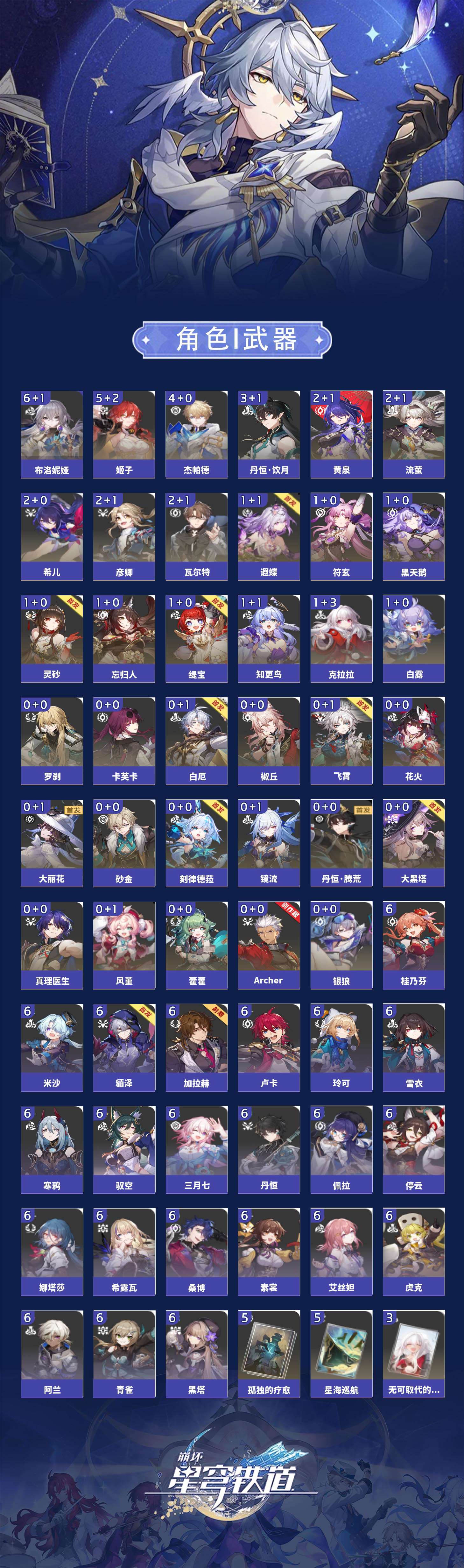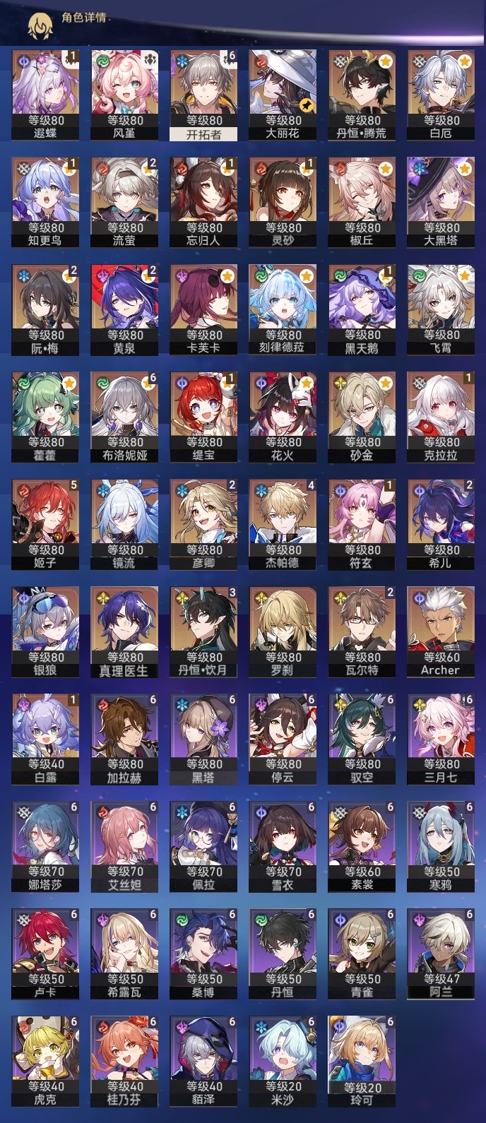 【崩坏·星穹铁道】【lyxq9644】冒险等级:70,男主,五星数量:54,五星角色:布洛妮娅 6命姬子 5命杰帕德 4命丹恒·饮月 3命希儿 2命彦卿 2命瓦尔特 2命黄泉 2命流萤 2命白露 1命灵砂 1命克拉拉 1命忘归人 1命缇宝 1命符玄 1命遐蝶 1命黑天鹅 1命知更鸟 1命椒丘飞霄银狼大黑塔罗刹卡芙卡镜流藿藿真理医生花火风堇砂金白厄archer刻律德菈丹恒·腾荒大丽花__五星光锥:星海巡航 5精孤独的疗愈 5精无可取代的东西 3精银河铁道之夜 2精记忆的质料以世界之名如泥酣眠但战斗还未结束我将,巡征追猎比阳光更明亮的让告别,更美一些此身为剑镜中故我行于流逝的岸愿虹光永驻天空夜色流光溢彩黎明恰如此燃烧勿忘她的火焰梦应归于何处__四星角色:阿兰 6命娜塔莎 6命虎克 6命貊泽 6命黑塔 6命丹恒 6命艾丝妲 6命希露瓦 6命停云 6命素裳 6命桑博 6命三月七 6命青雀 6命佩拉 6命驭空 6命卢卡 6命玲可 6命桂乃芬 6命寒鸦 6命雪衣 6命米沙 6命加拉赫 6命
