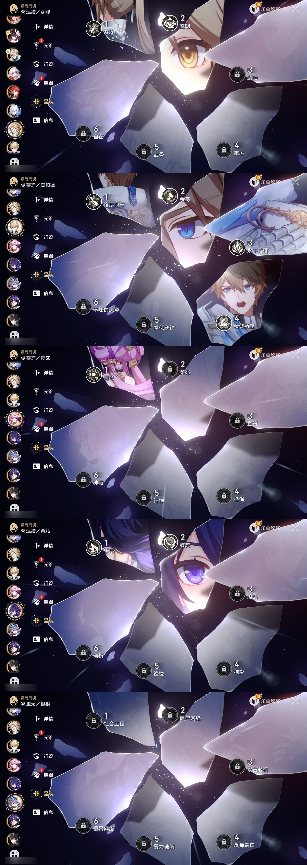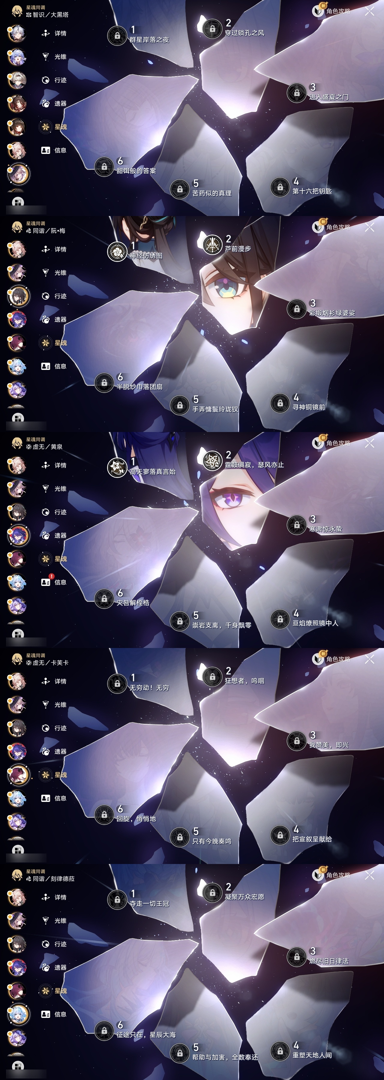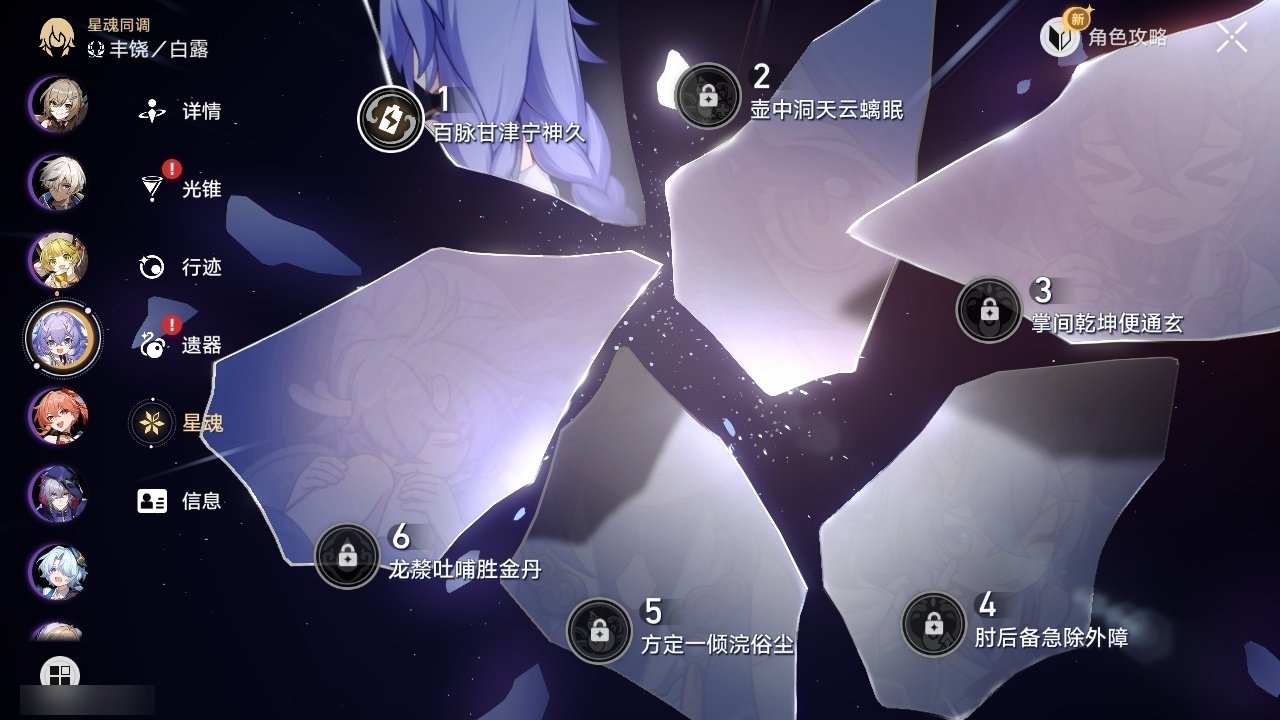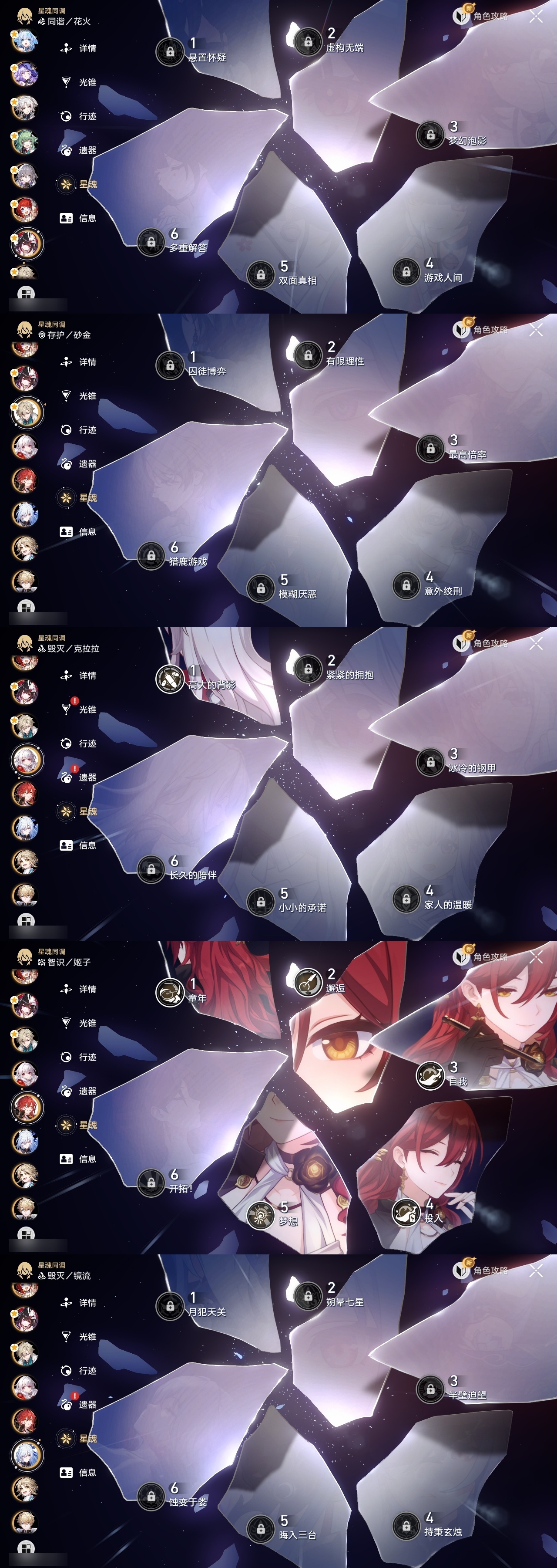 【崩坏·星穹铁道】【lyxq9644】冒险等级:70,男主,五星数量:54,五星角色:布洛妮娅 6命姬子 5命杰帕德 4命丹恒·饮月 3命希儿 2命彦卿 2命瓦尔特 2命黄泉 2命流萤 2命白露 1命灵砂 1命克拉拉 1命忘归人 1命缇宝 1命符玄 1命遐蝶 1命黑天鹅 1命知更鸟 1命椒丘飞霄银狼大黑塔罗刹卡芙卡镜流藿藿真理医生花火风堇砂金白厄archer刻律德菈丹恒·腾荒大丽花__五星光锥:星海巡航 5精孤独的疗愈 5精无可取代的东西 3精银河铁道之夜 2精记忆的质料以世界之名如泥酣眠但战斗还未结束我将,巡征追猎比阳光更明亮的让告别,更美一些此身为剑镜中故我行于流逝的岸愿虹光永驻天空夜色流光溢彩黎明恰如此燃烧勿忘她的火焰梦应归于何处__四星角色:阿兰 6命娜塔莎 6命虎克 6命貊泽 6命黑塔 6命丹恒 6命艾丝妲 6命希露瓦 6命停云 6命素裳 6命桑博 6命三月七 6命青雀 6命佩拉 6命驭空 6命卢卡 6命玲可 6命桂乃芬 6命寒鸦 6命雪衣 6命米沙 6命加拉赫 6命