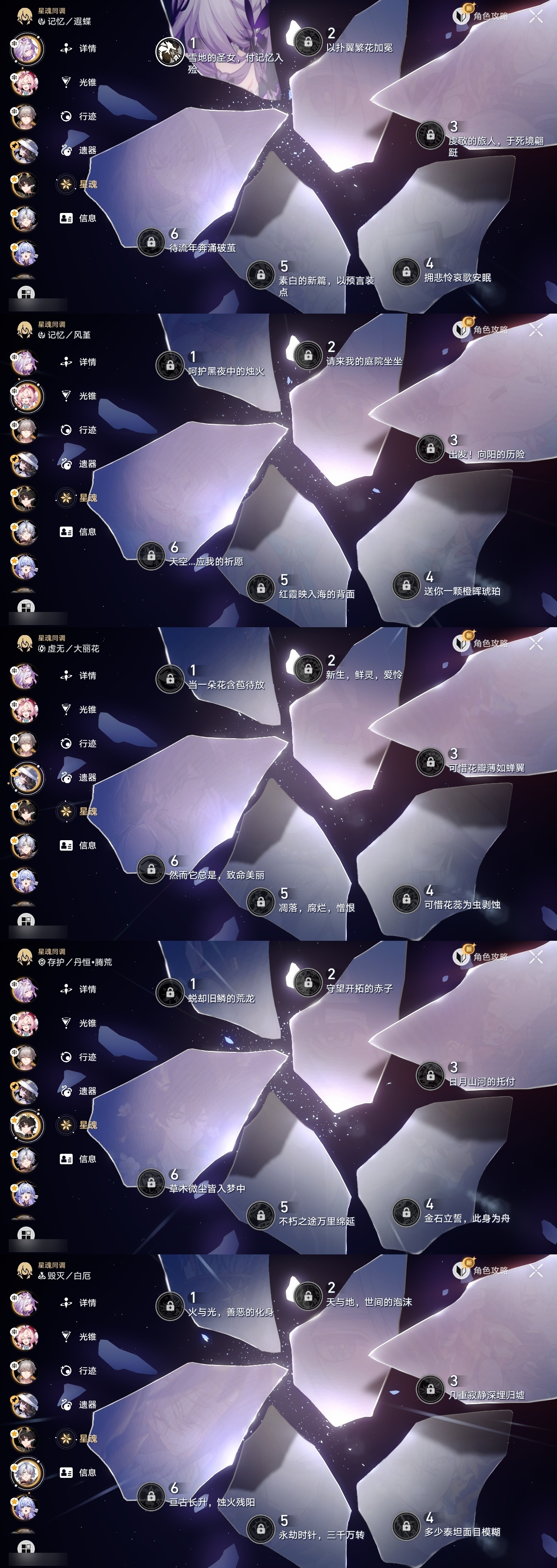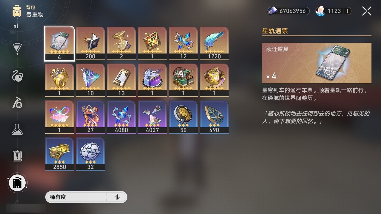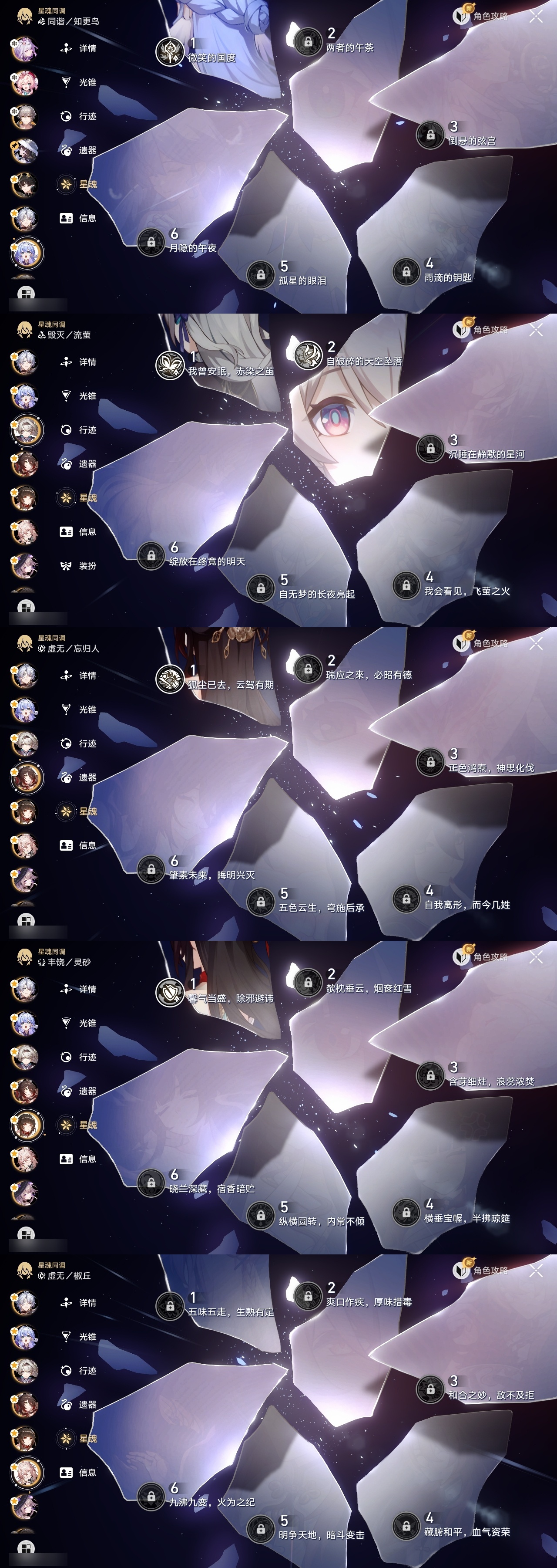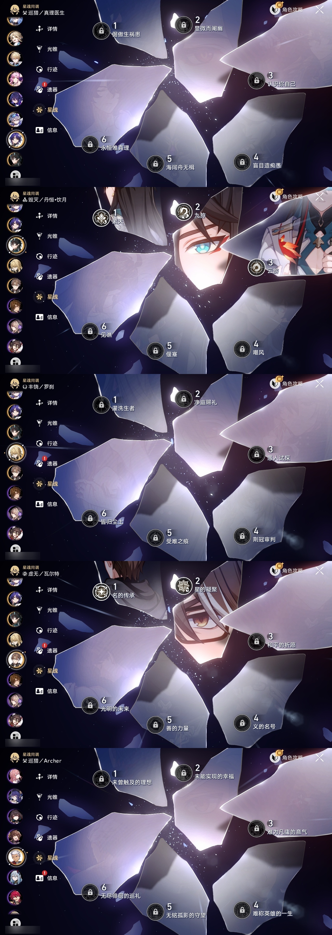 【崩坏·星穹铁道】【lyxq9644】冒险等级:70,男主,五星数量:54,五星角色:布洛妮娅 6命姬子 5命杰帕德 4命丹恒·饮月 3命希儿 2命彦卿 2命瓦尔特 2命黄泉 2命流萤 2命白露 1命灵砂 1命克拉拉 1命忘归人 1命缇宝 1命符玄 1命遐蝶 1命黑天鹅 1命知更鸟 1命椒丘飞霄银狼大黑塔罗刹卡芙卡镜流藿藿真理医生花火风堇砂金白厄archer刻律德菈丹恒·腾荒大丽花__五星光锥:星海巡航 5精孤独的疗愈 5精无可取代的东西 3精银河铁道之夜 2精记忆的质料以世界之名如泥酣眠但战斗还未结束我将,巡征追猎比阳光更明亮的让告别,更美一些此身为剑镜中故我行于流逝的岸愿虹光永驻天空夜色流光溢彩黎明恰如此燃烧勿忘她的火焰梦应归于何处__四星角色:阿兰 6命娜塔莎 6命虎克 6命貊泽 6命黑塔 6命丹恒 6命艾丝妲 6命希露瓦 6命停云 6命素裳 6命桑博 6命三月七 6命青雀 6命佩拉 6命驭空 6命卢卡 6命玲可 6命桂乃芬 6命寒鸦 6命雪衣 6命米沙 6命加拉赫 6命