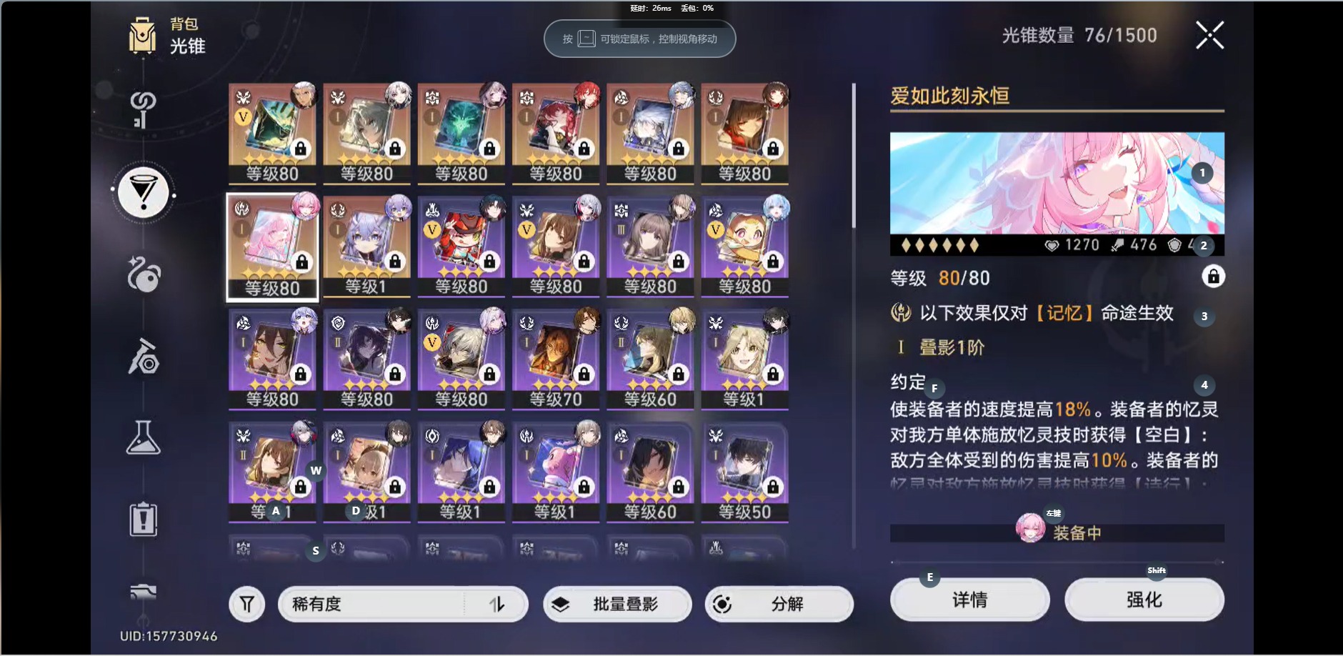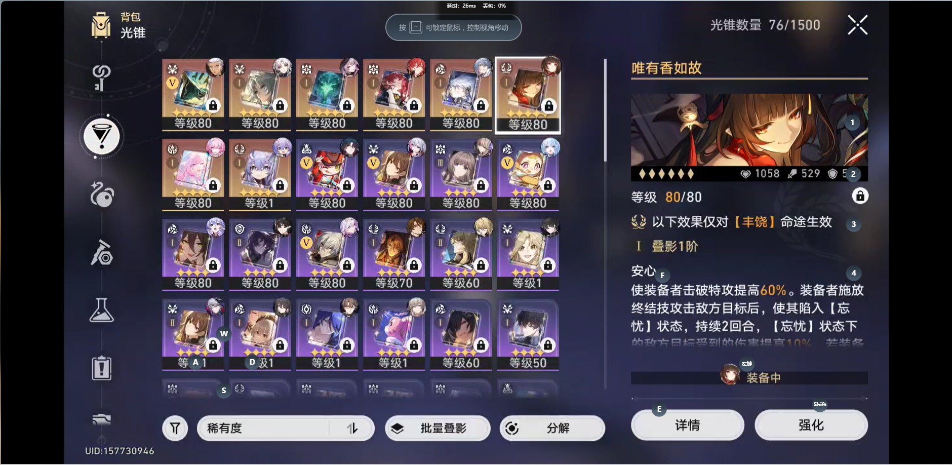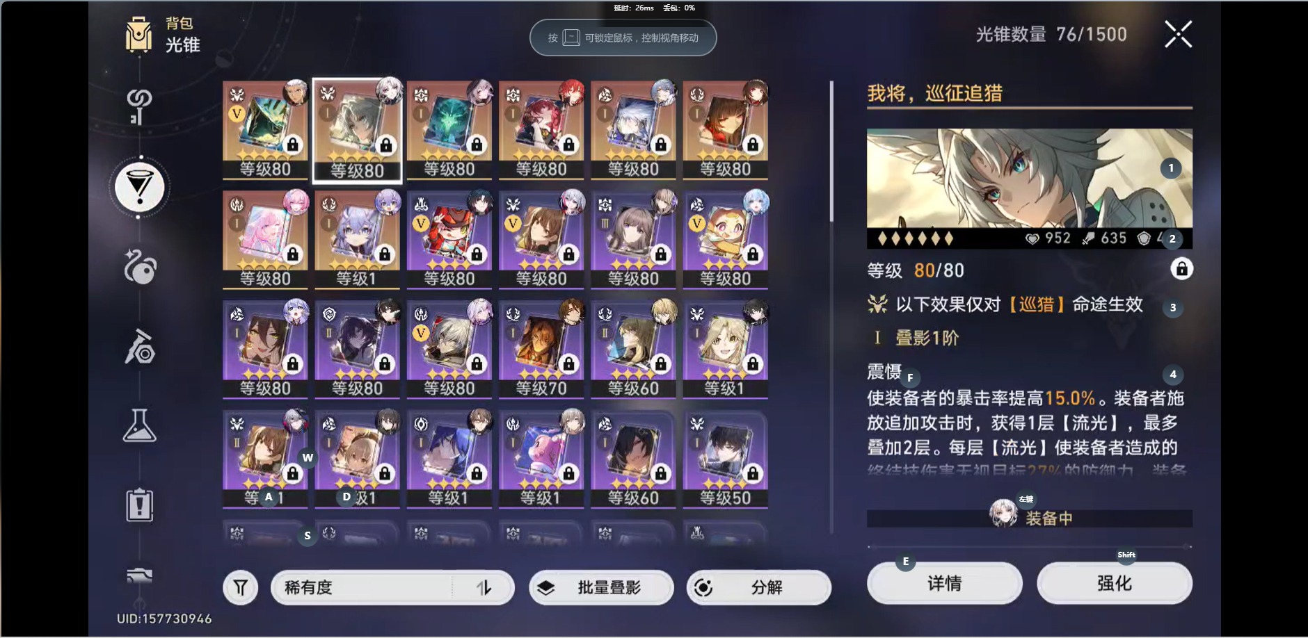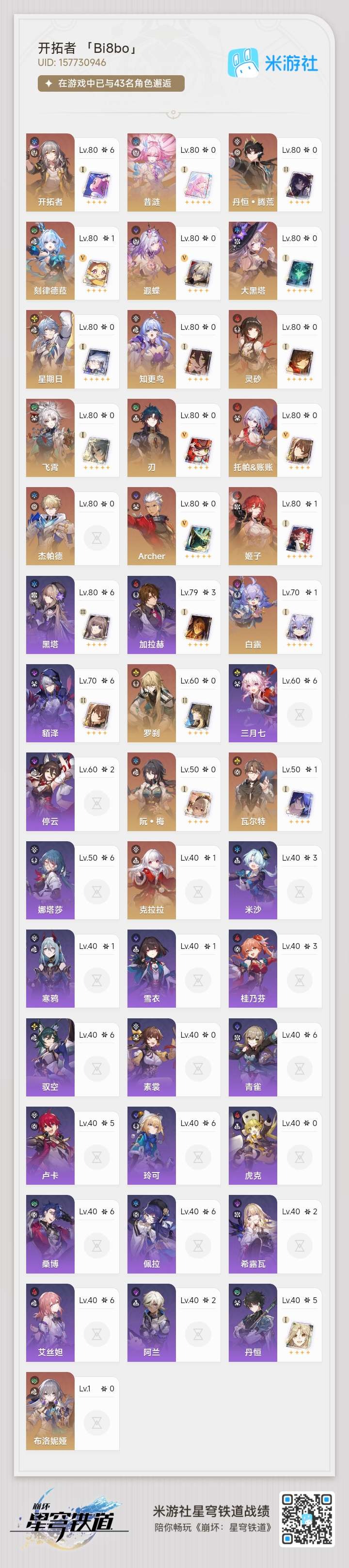 [16295499]【总黄数】:30 【1命金色角色】:1命刻律德菈1命白露1命姬子1命瓦尔特1命克拉拉 【0命金色角色】:0命飞霄0命灵砂0命星期日0命大黑塔0命遐蝶0命archer0命丹恒·腾荒0命布洛妮娅0命杰帕德0命罗刹0命刃0命知更鸟0命托帕账账0命阮•梅0命昔涟 【精5武器】:精5星海巡航 【精1武器】:精1不息的演算精1我将,巡征追猎精1唯有香如故精1回到大地的飞行精1时节不居精1银河铁道之夜精1爱如此刻永恒