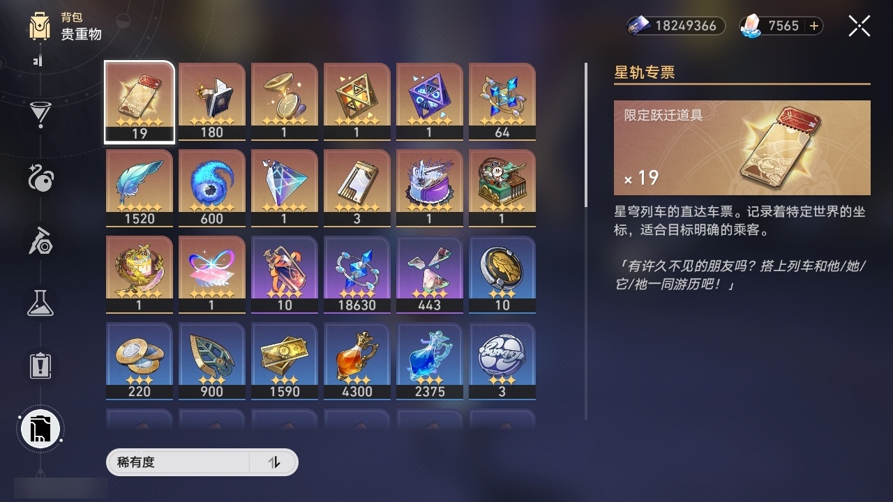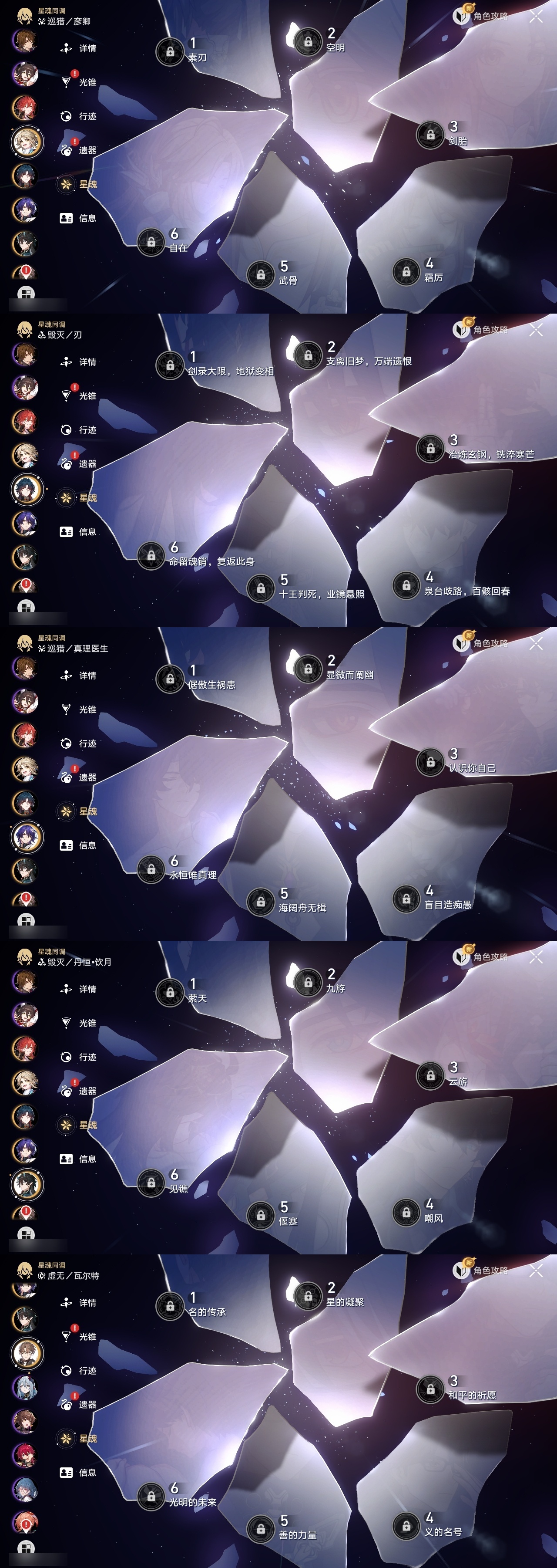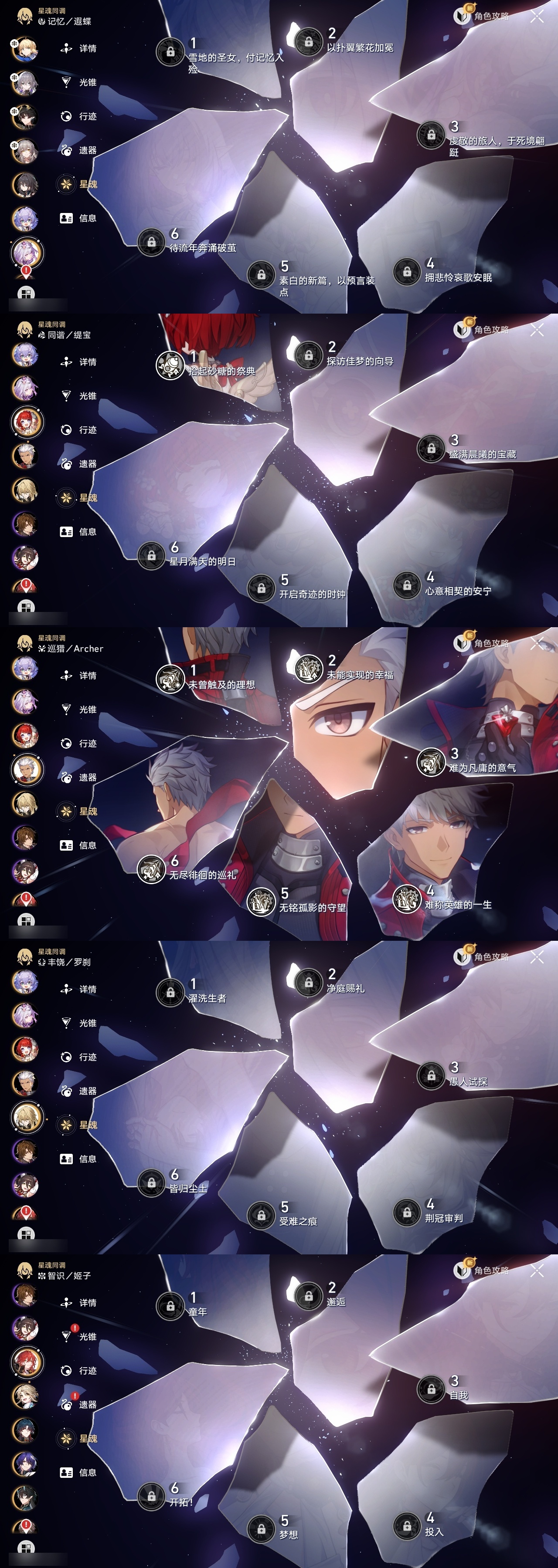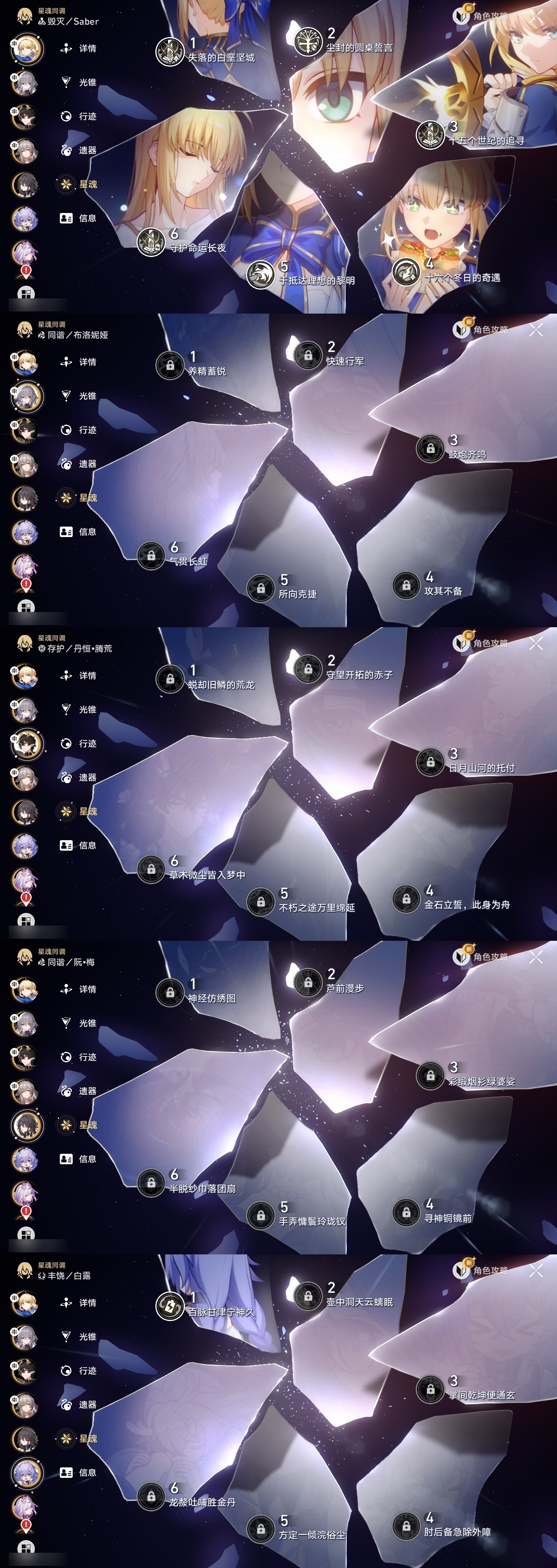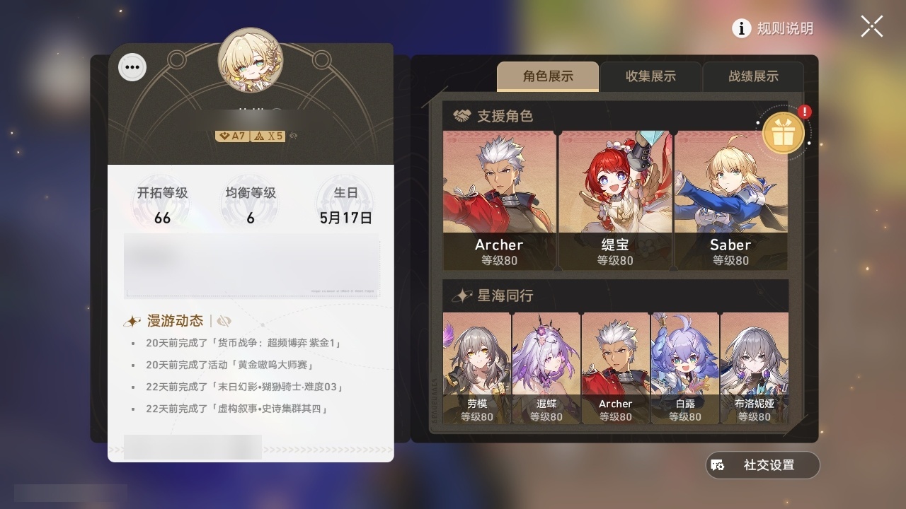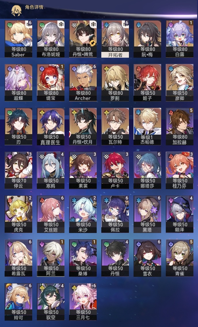 【崩坏·星穹铁道】【lyxq9618】冒险等级:66,女主,五星数量:23,五星角色:saber 6命archer 6命白露 1命缇宝 1命布洛妮娅姬子杰帕德彦卿瓦尔特罗刹刃丹恒·饮月遐蝶真理医生丹恒·腾荒__五星光锥:记忆永不落幕 5精记一位星神的陨落如泥酣眠如果时间是一朵花让告别,更美一些镜中故我理想燃烧的地狱没有回报的加冕__四星角色:娜塔莎 6命黑塔 6命艾丝妲 6命希露瓦 6命三月七 6命佩拉 6命玲可 6命雪衣 6命青雀 5命加拉赫 5命貊泽 4命丹恒 4命驭空 4命寒鸦 4命停云 3命素裳 3命卢卡 3命桂乃芬 3命虎克 2命米沙 2命阿兰 1命桑博 1命66抽
