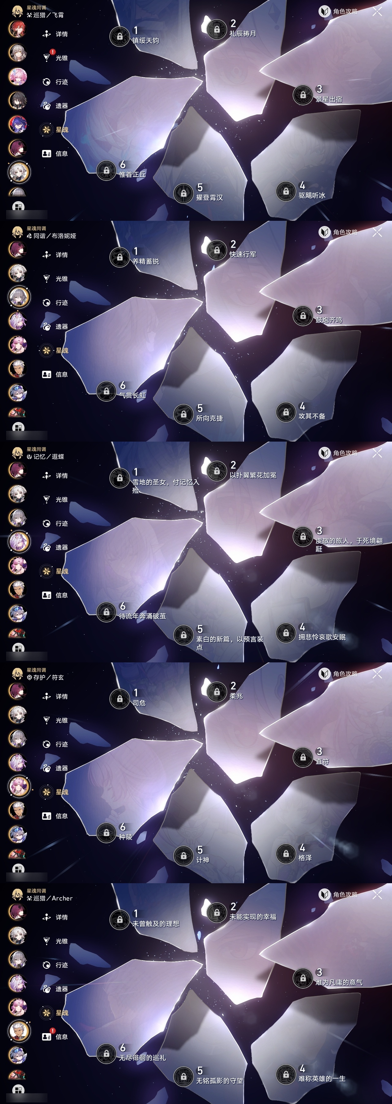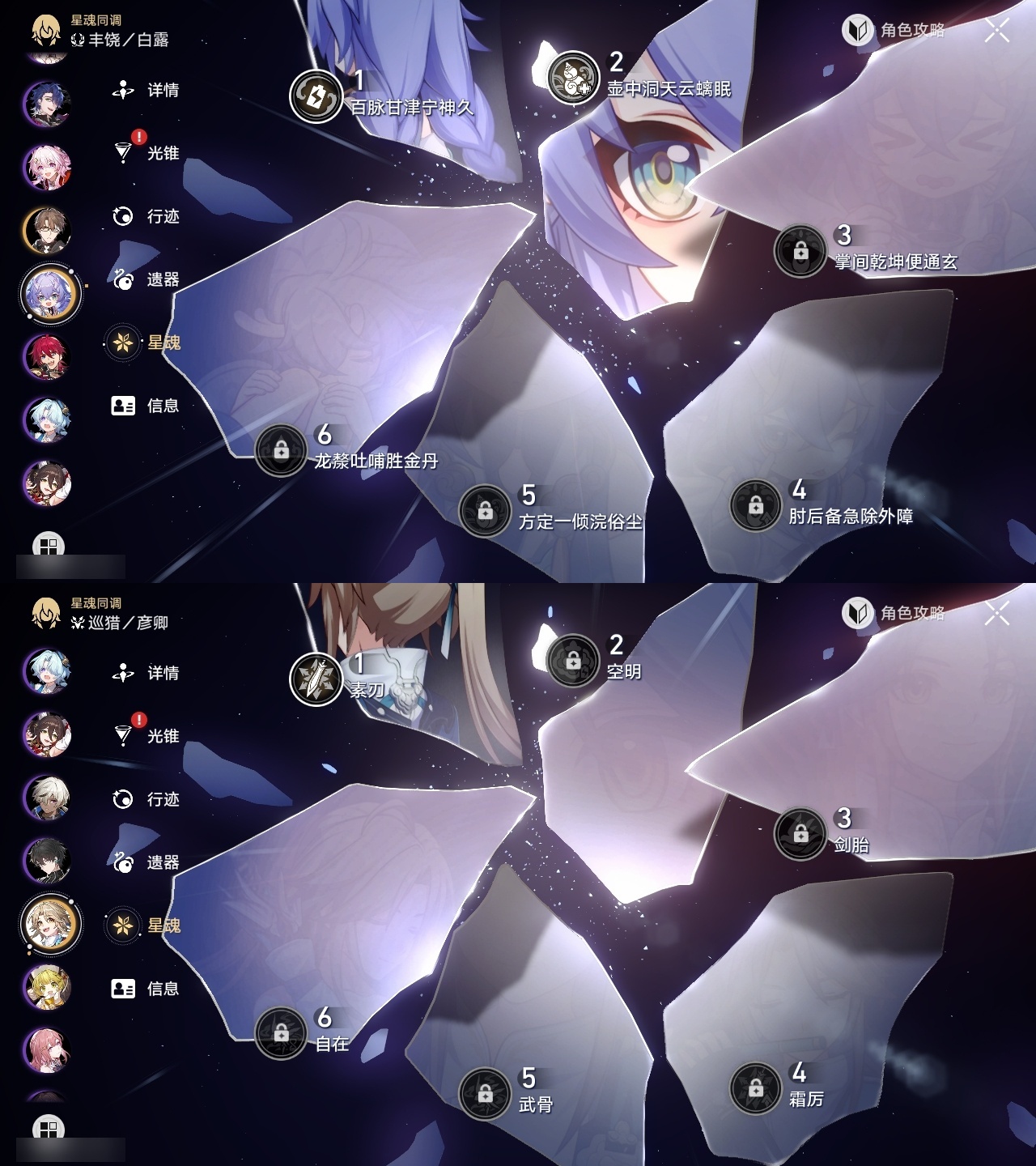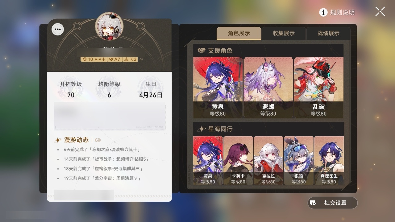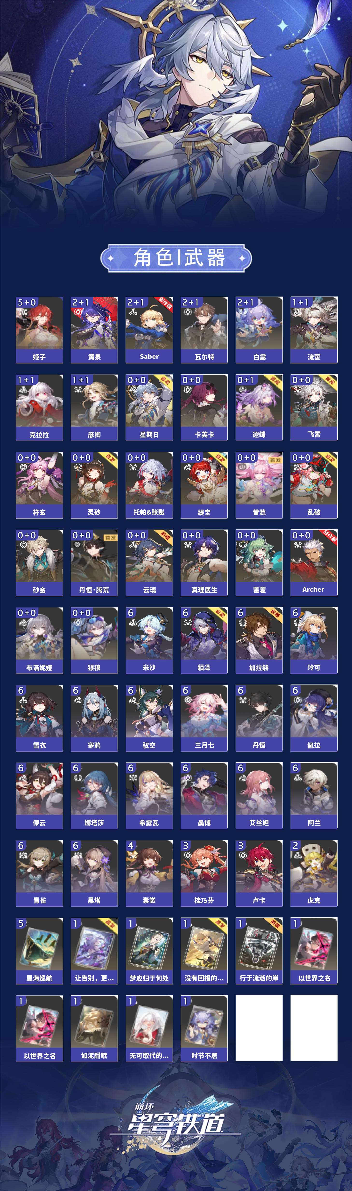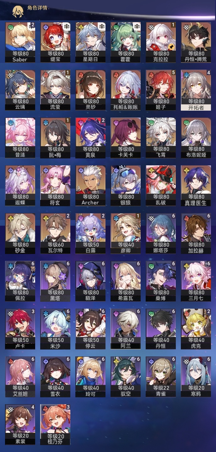 【崩坏·星穹铁道】【lyxq9658】冒险等级:70,女主,五星数量:36,五星角色:姬子 5命白露 2命瓦尔特 2命黄泉 2命saber 2命彦卿 1命克拉拉 1命流萤 1命云璃飞霄银狼布洛妮娅灵砂乱破星期日缇宝卡芙卡遐蝶符玄托帕账账藿藿真理医生砂金archer丹恒·腾荒昔涟__五星光锥:星海巡航 5精以世界之名以世界之名无可取代的东西时节不居如泥酣眠让告别,更美一些行于流逝的岸没有回报的加冕梦应归于何处__四星角色:阿兰 6命娜塔莎 6命貊泽 6命黑塔 6命丹恒 6命艾丝妲 6命希露瓦 6命停云 6命桑博 6命三月七 6命青雀 6命佩拉 6命驭空 6命玲可 6命寒鸦 6命雪衣 6命米沙 6命加拉赫 6命素裳 4命卢卡 3命桂乃芬 3命虎克 2命